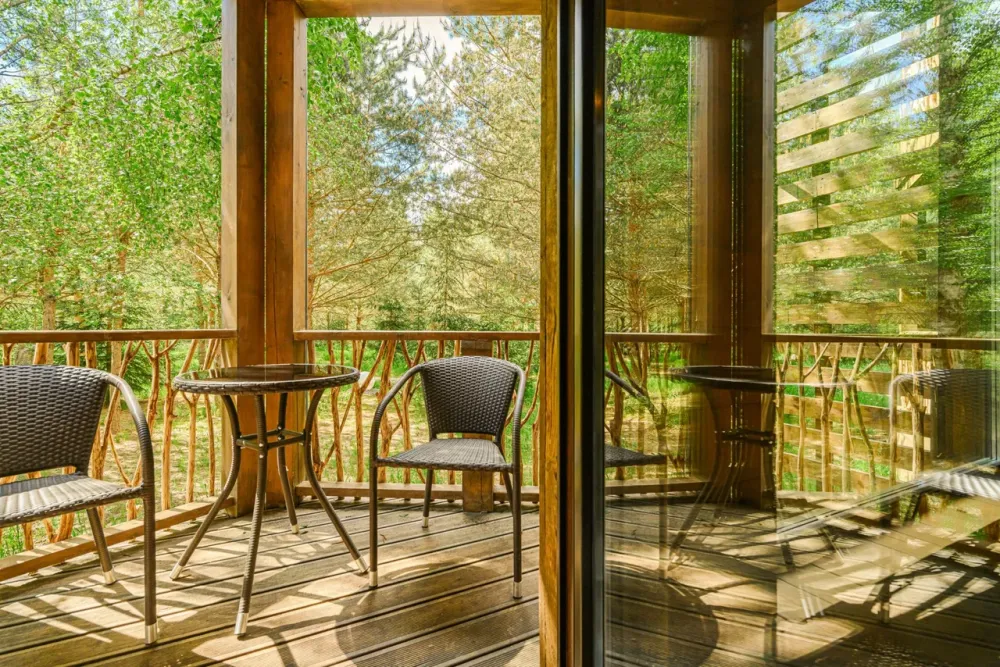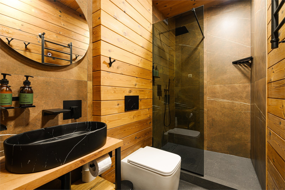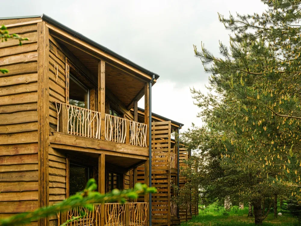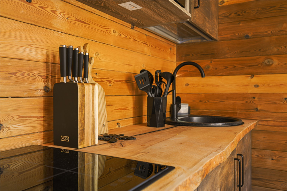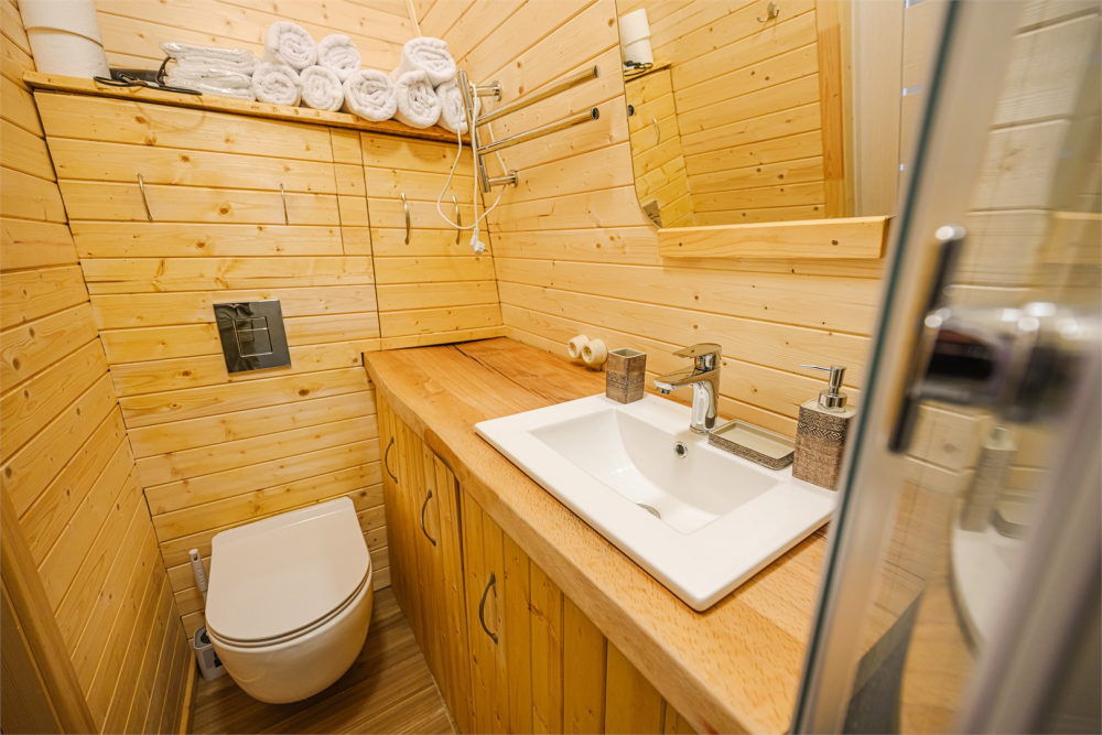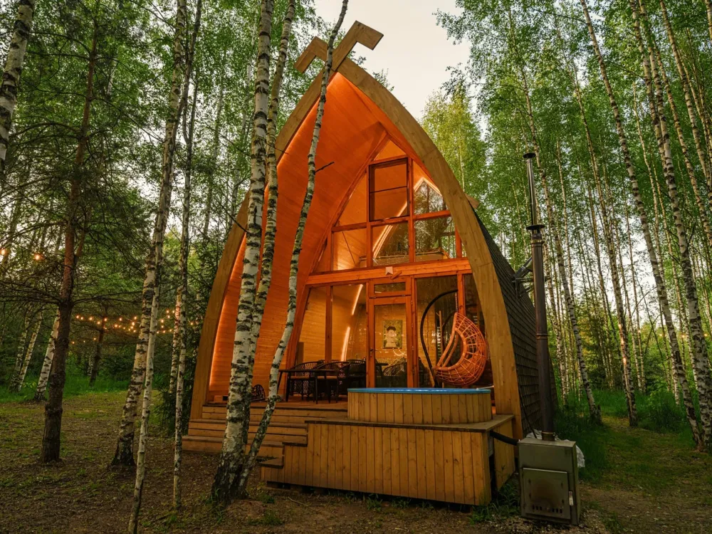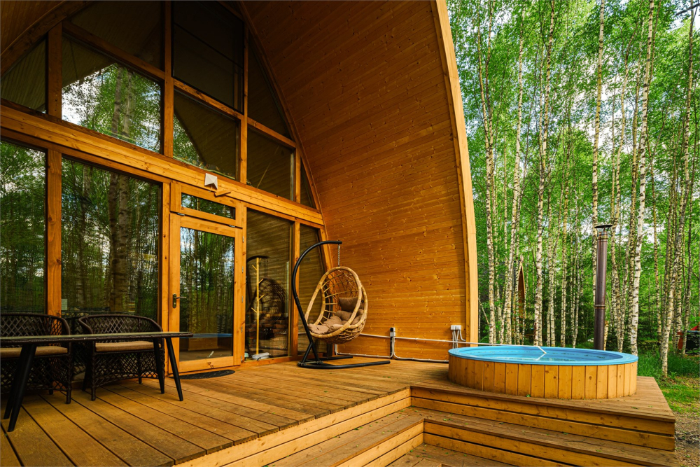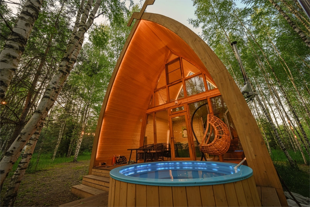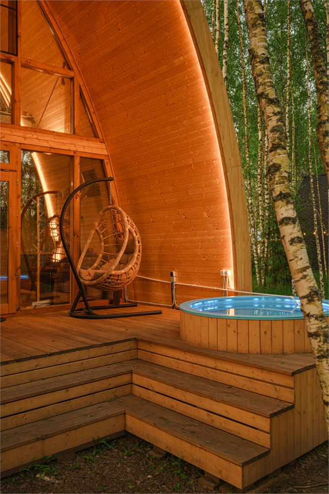 Горячий чан есть около домиков Панорамный эко-дом с горячей купелью.