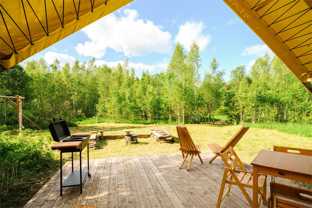 Мангальная зона есть около домиков Панорамный эко-дом с горячей купелью, Белл-тент.