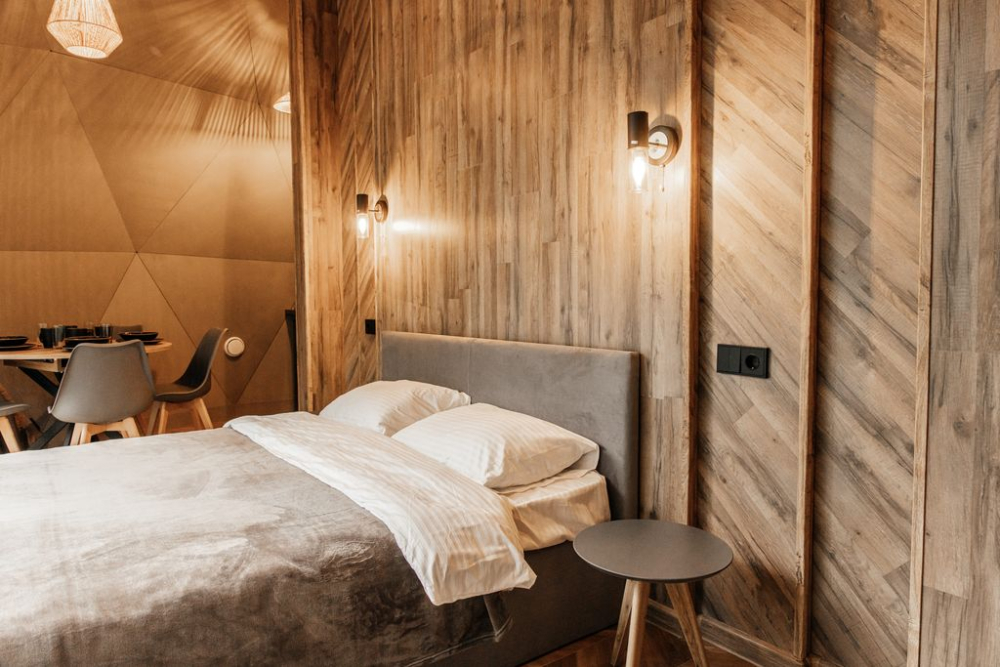 Премиум-модульный дом на двоих: улучшенные условия, большая двуспальная кровать и уютная терраса.
