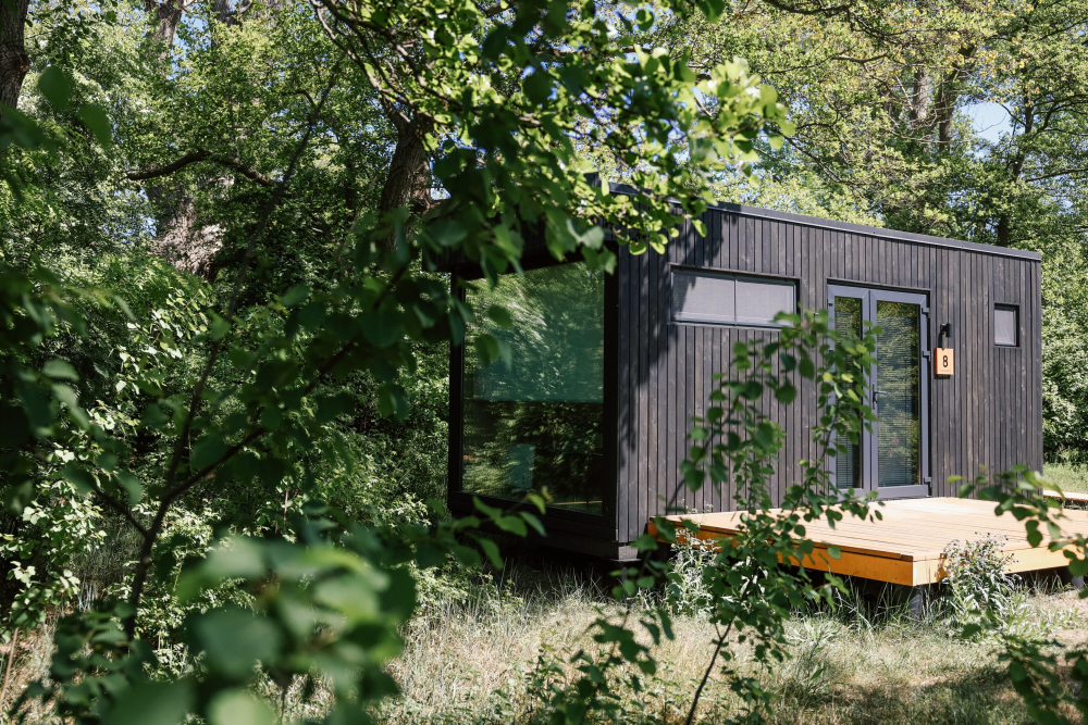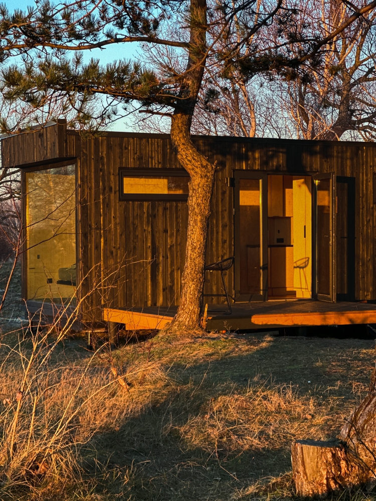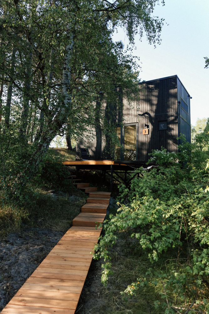 Девять домиков-хитте в скандинавском стиле на пустынном пляже бережно вписаны в ландшафт Балтийской косы.