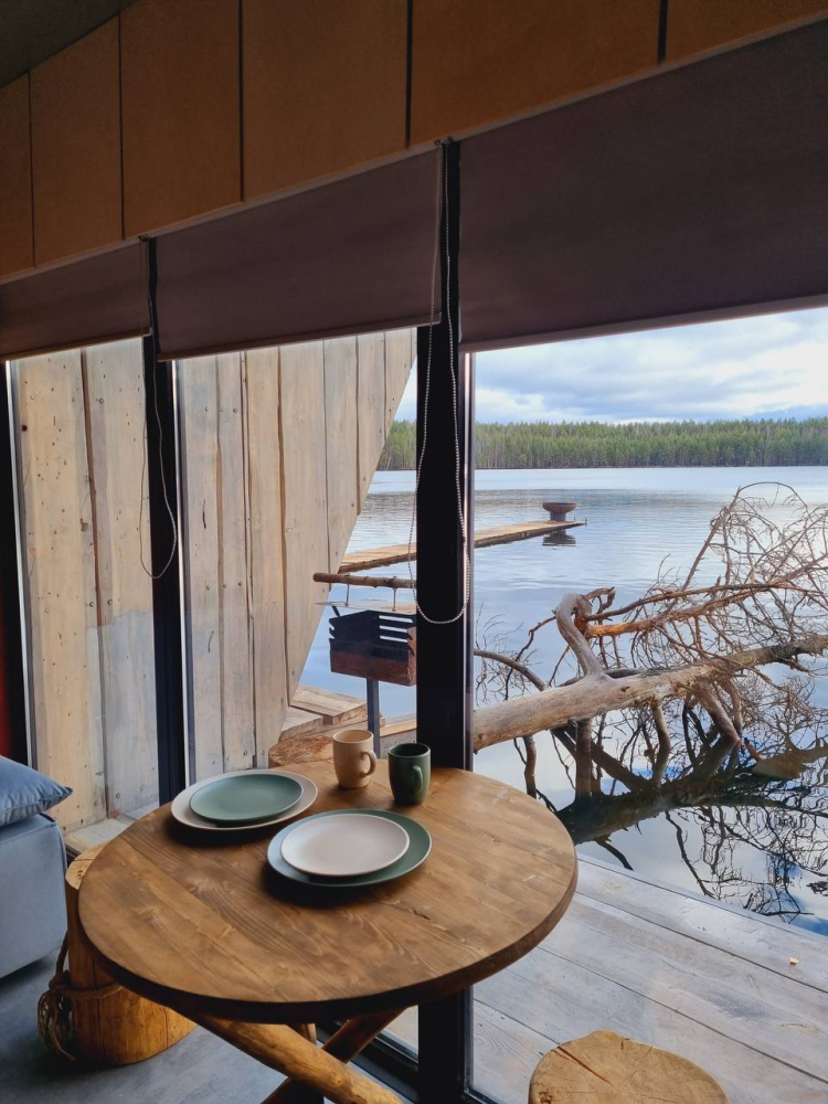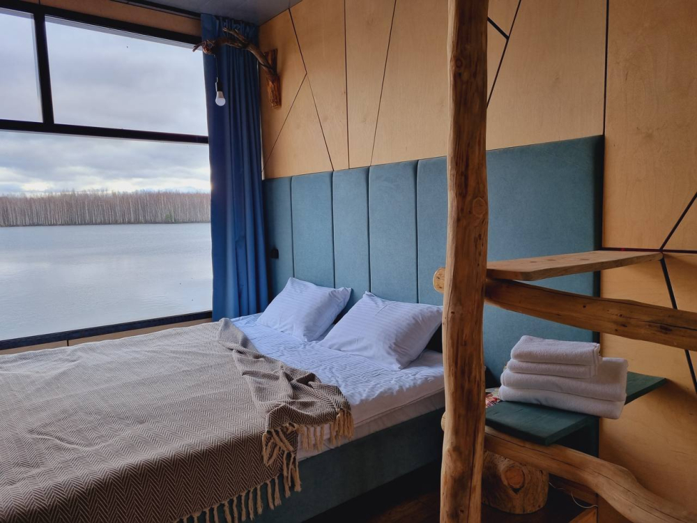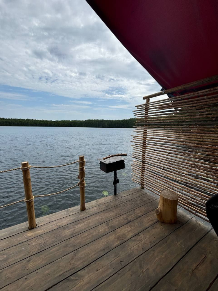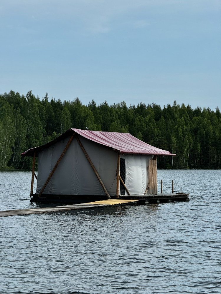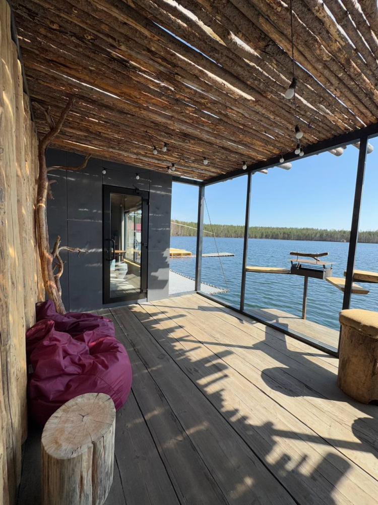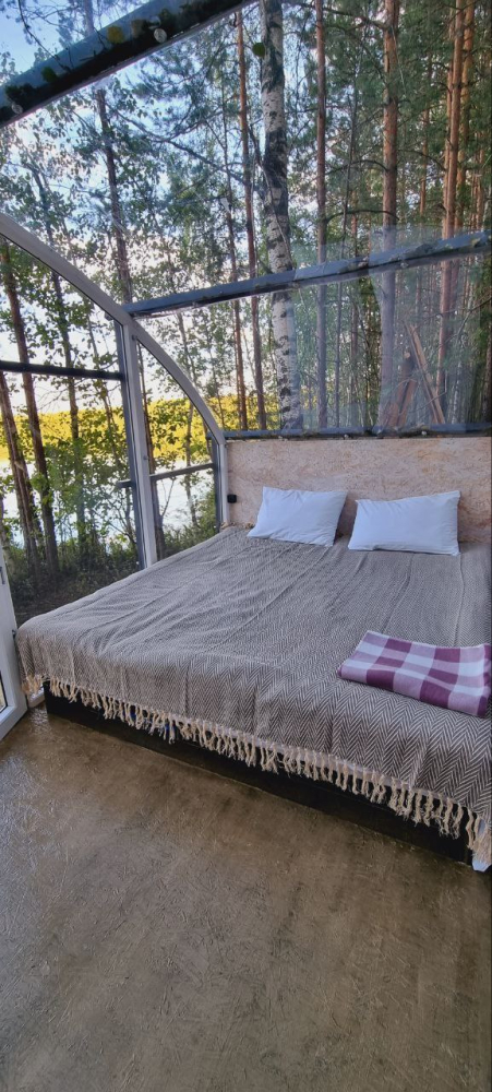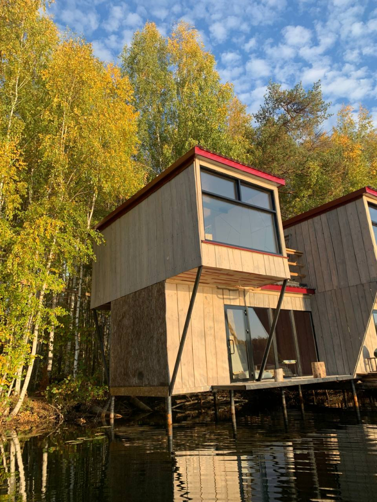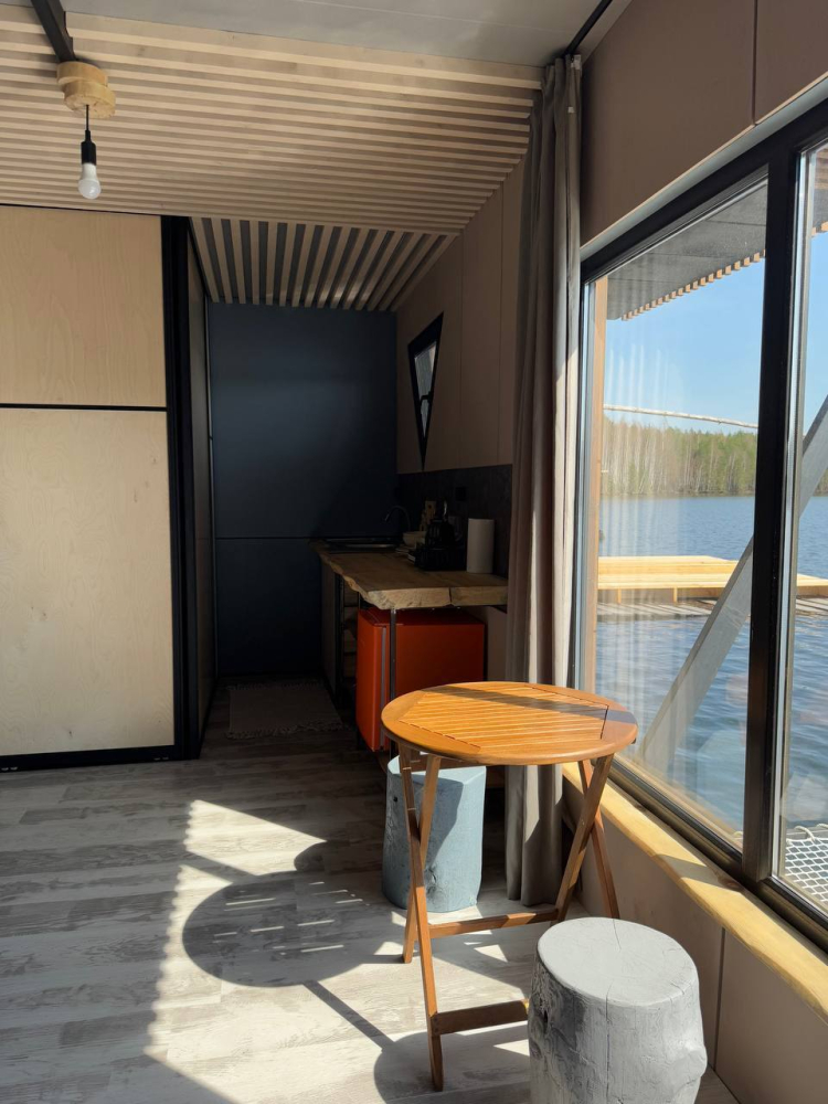 Двухэтажный домик с панорамными окнами находится прямо на ВОДЕ. Площадь комнат 35 м² + 2 балкона, площадью 15 м². Каждый домик отапливается и оборудован всем необходимым для комфортного отдыха на природе (двуспальная кровать с белоснежным, гипоаллергенным бельем, полотенца, кухонная зона с газовой плиткой, чайник, кастрюля, сковорода, чашки, тарелки и столовые приборы, сейф, шкаф/гардероб, санузел с БИО-туалетом, москитная сетка, терраса с мангалом и спуском в воду).