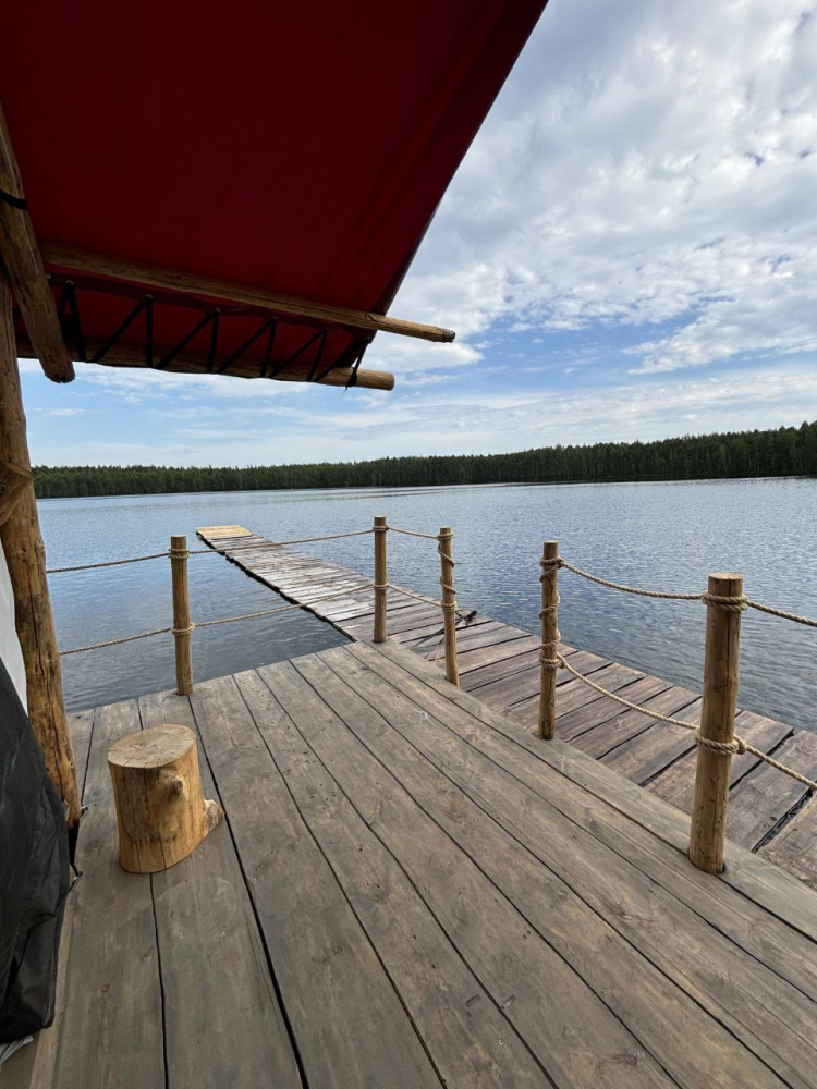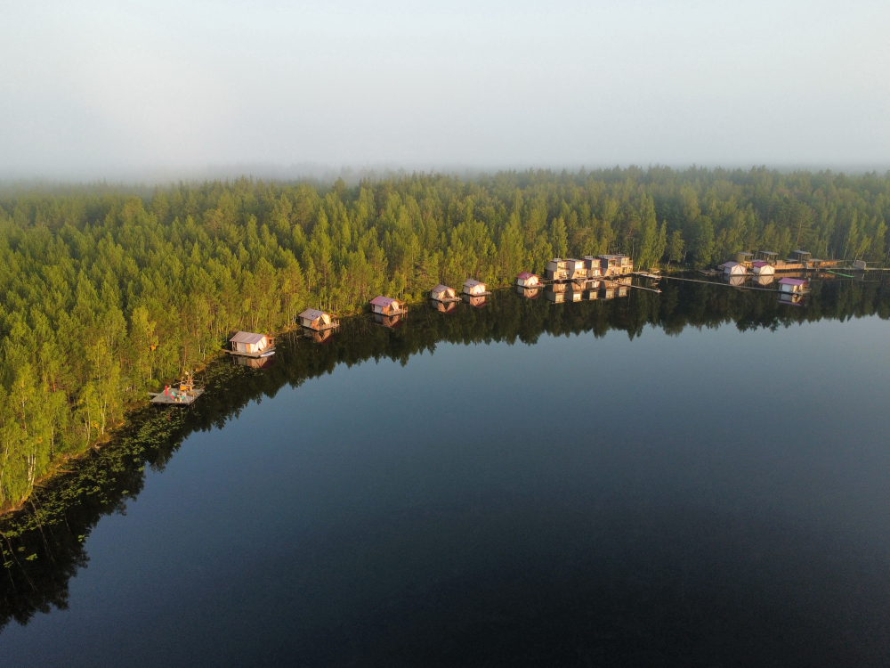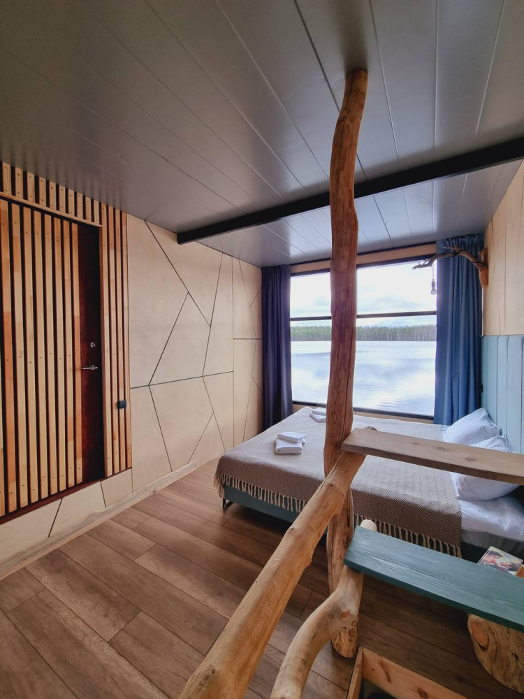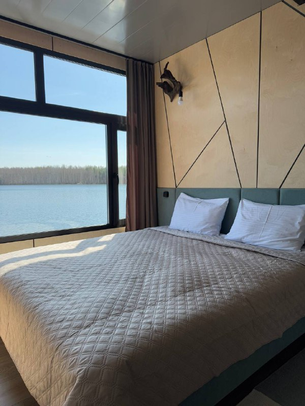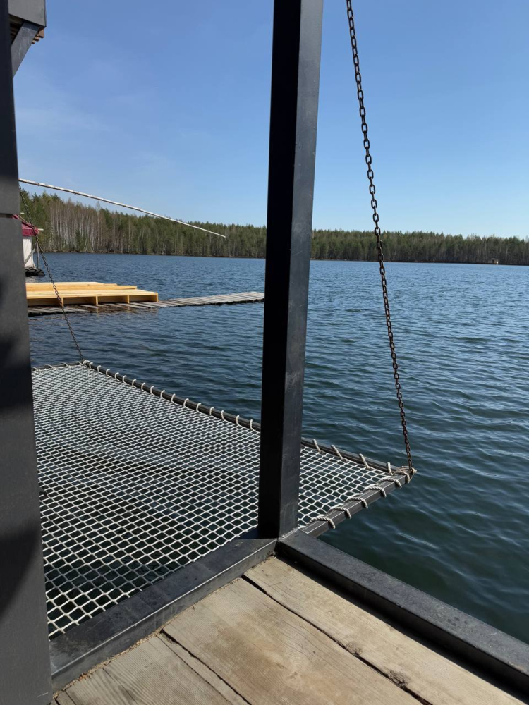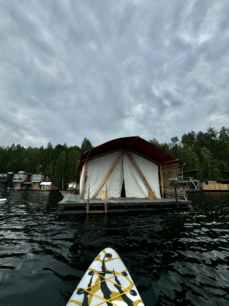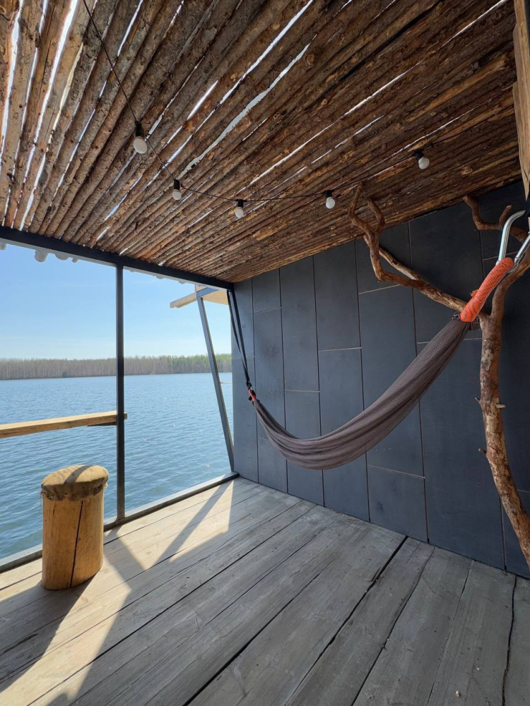Двухэтажный домик с панорамными окнами находится прямо на ВОДЕ. Площадь комнат 35 м² + 2 балкона, площадью 15 м². Каждый домик отапливается и оборудован всем необходимым для комфортного отдыха на природе (двуспальная кровать с белоснежным, гипоаллергенным бельем, полотенца, кухонная зона с газовой плиткой, чайник, кастрюля, сковорода, чашки, тарелки и столовые приборы, сейф, шкаф/гардероб, санузел с БИО-туалетом, москитная сетка, терраса с мангалом и спуском в воду).