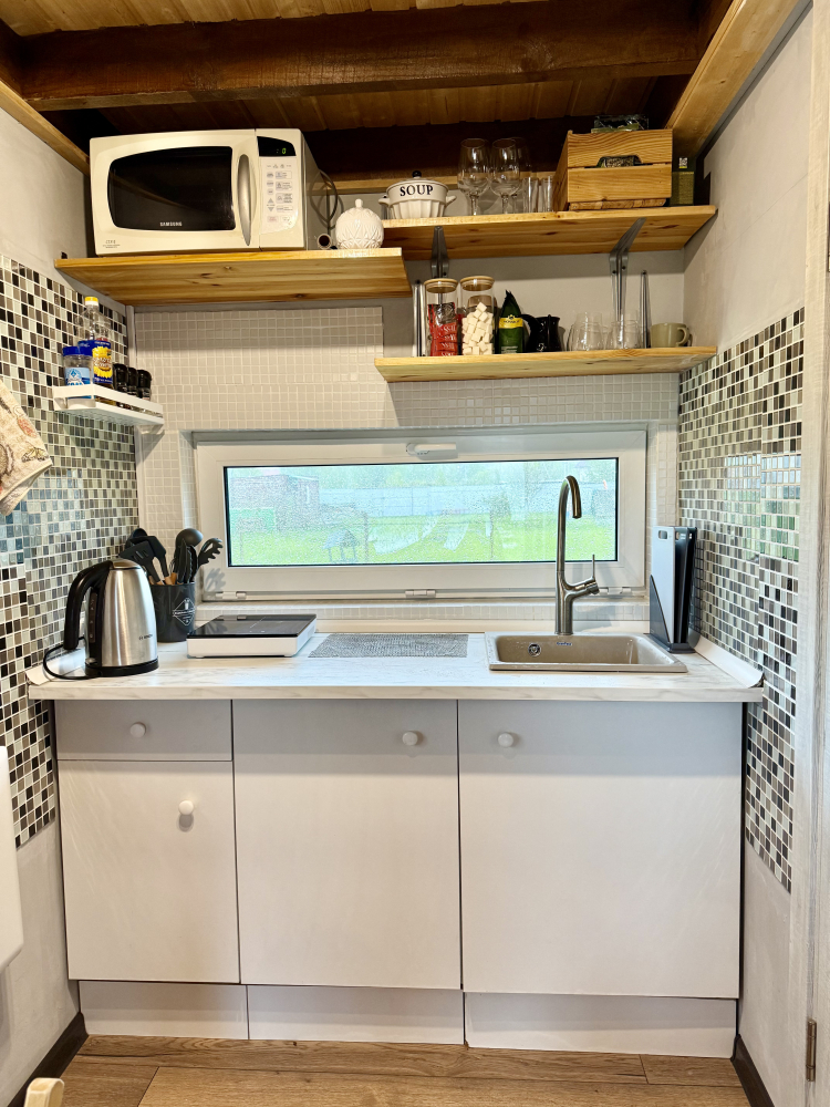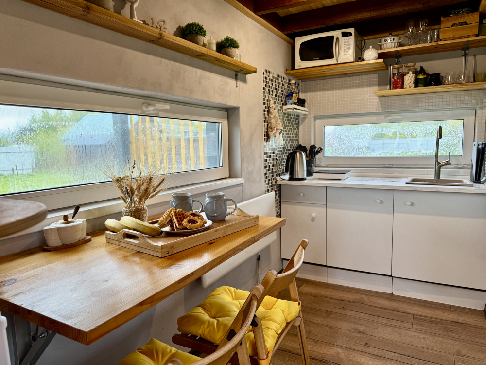 - Кухня: совмещена с гостиной, оснащена всей посудой и техникой для приготовления еды.