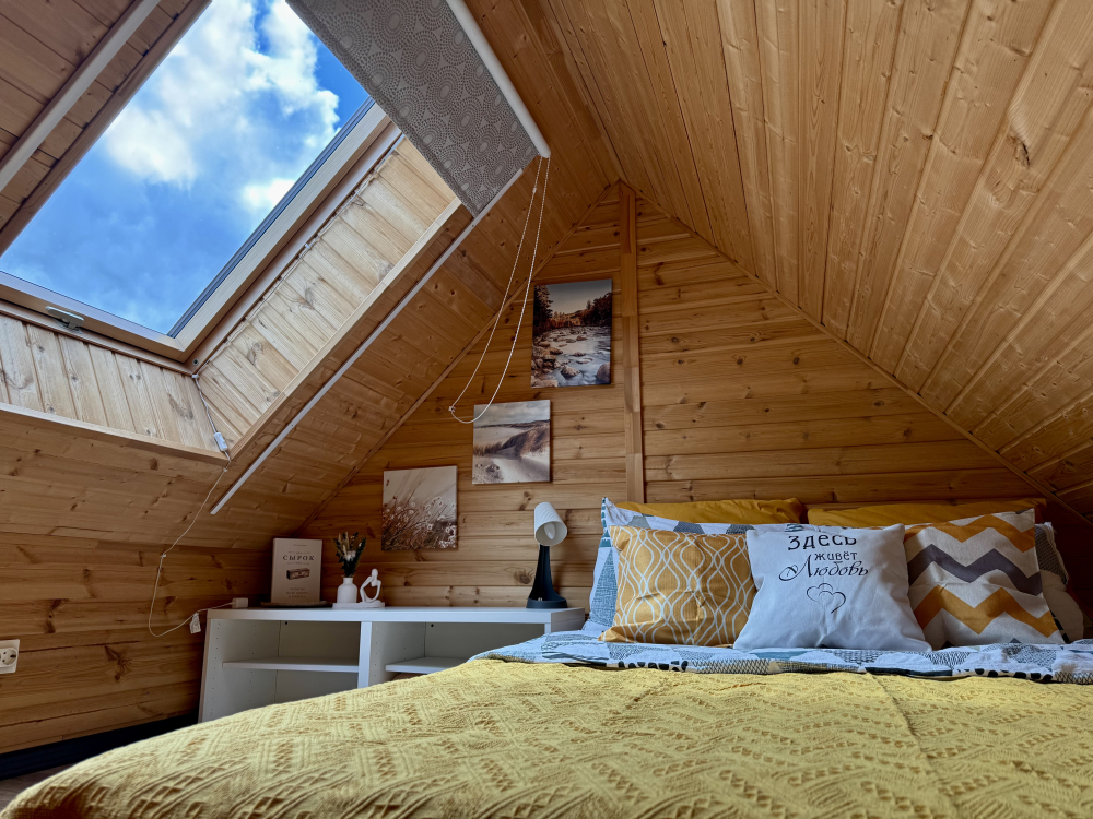 - Спальня: двуспальная кровать с ортопедическим матрасом на втором этаже.