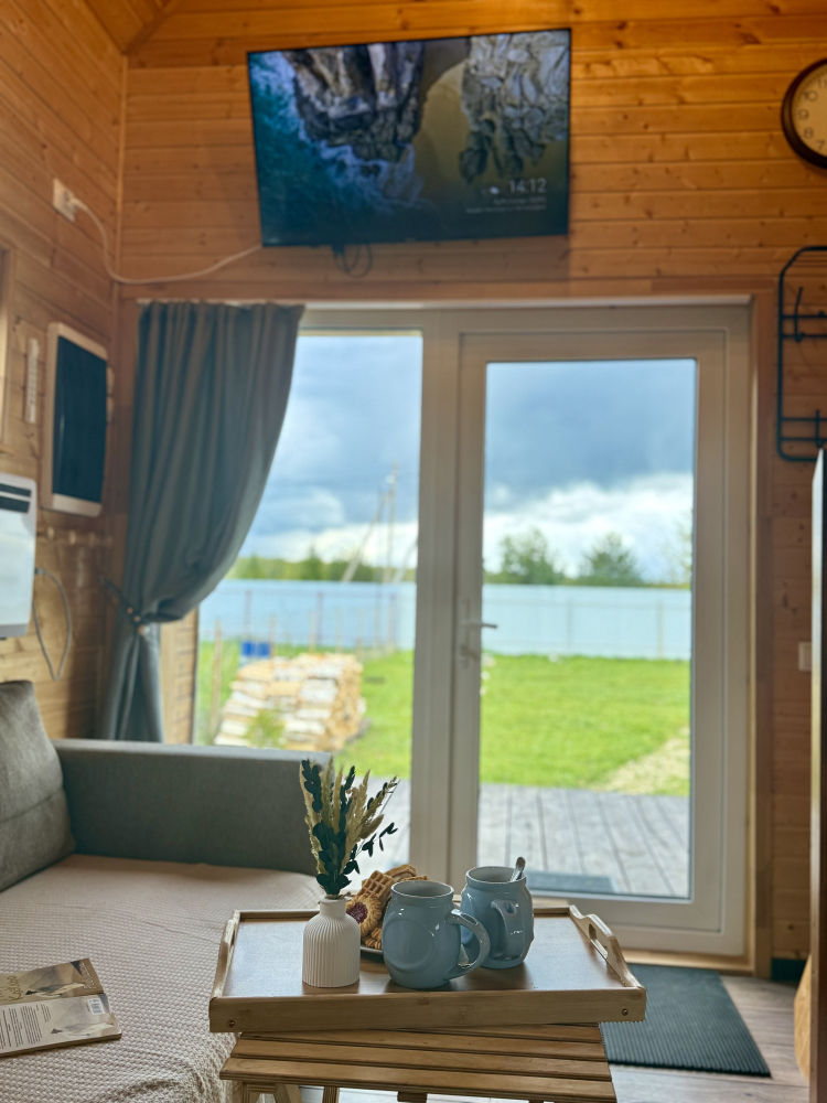 - Гостиная: раскладной двуспальный диван на первом этаже, Smart TV, панорамное окно, настольные игры.