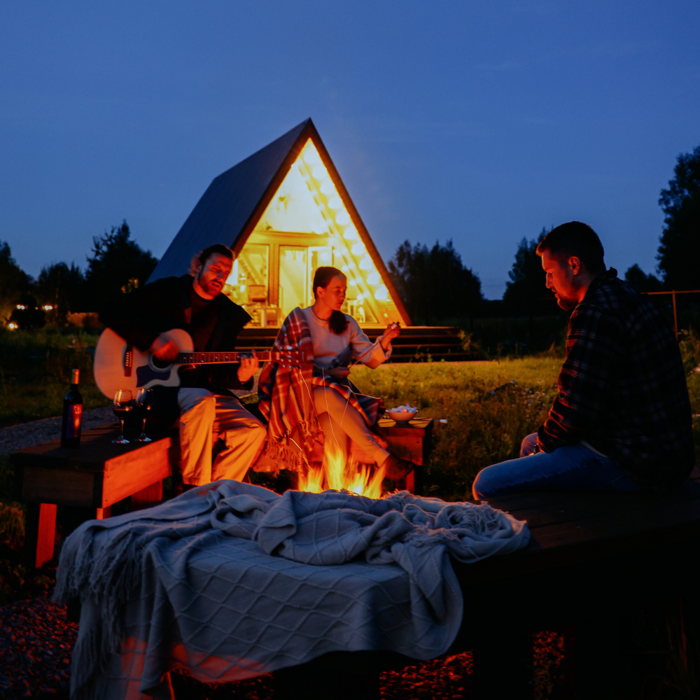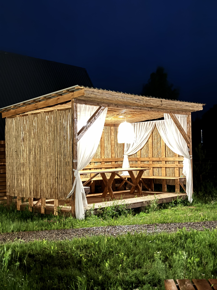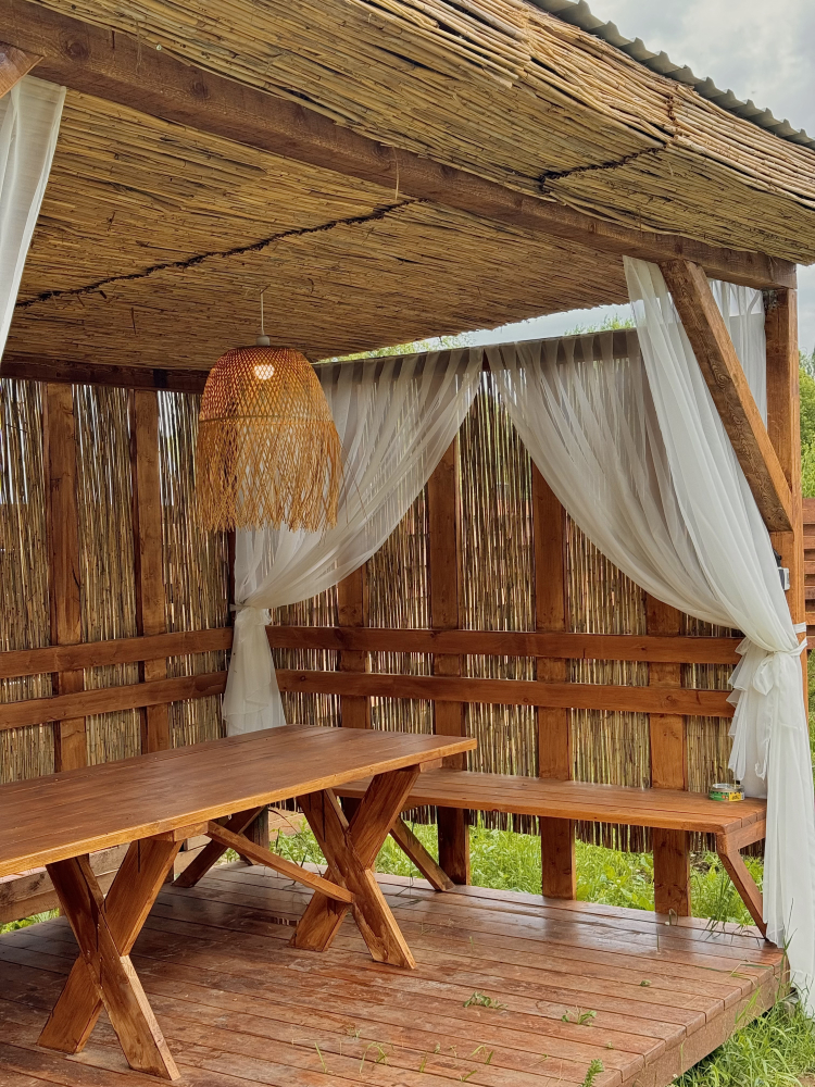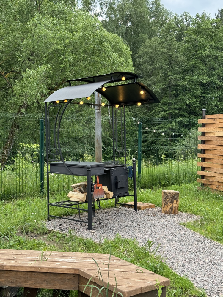 - Мангальная зона с шампурами, решеткой, подставкой под казан, дровами и средствами для розжига