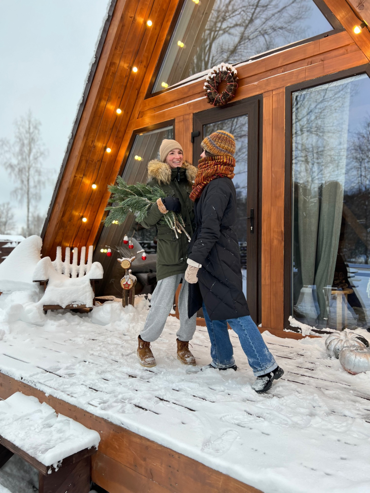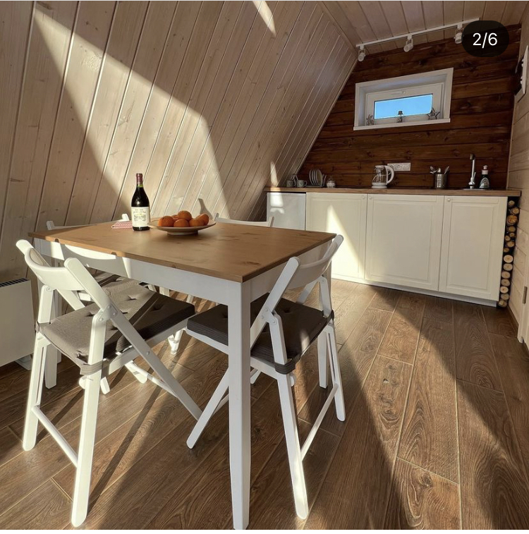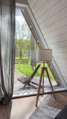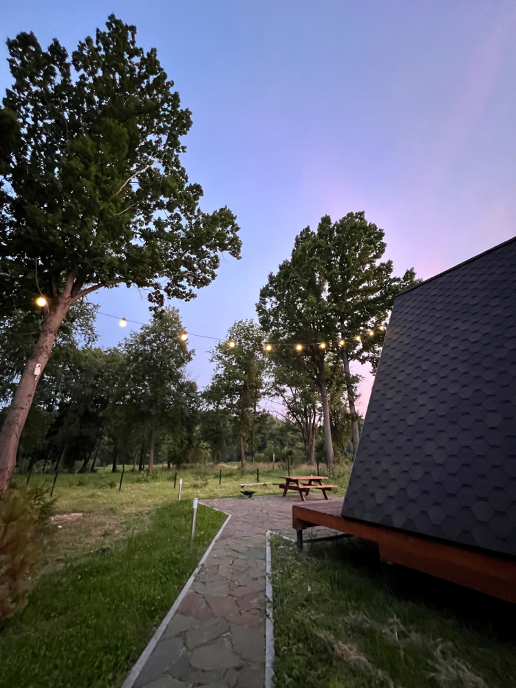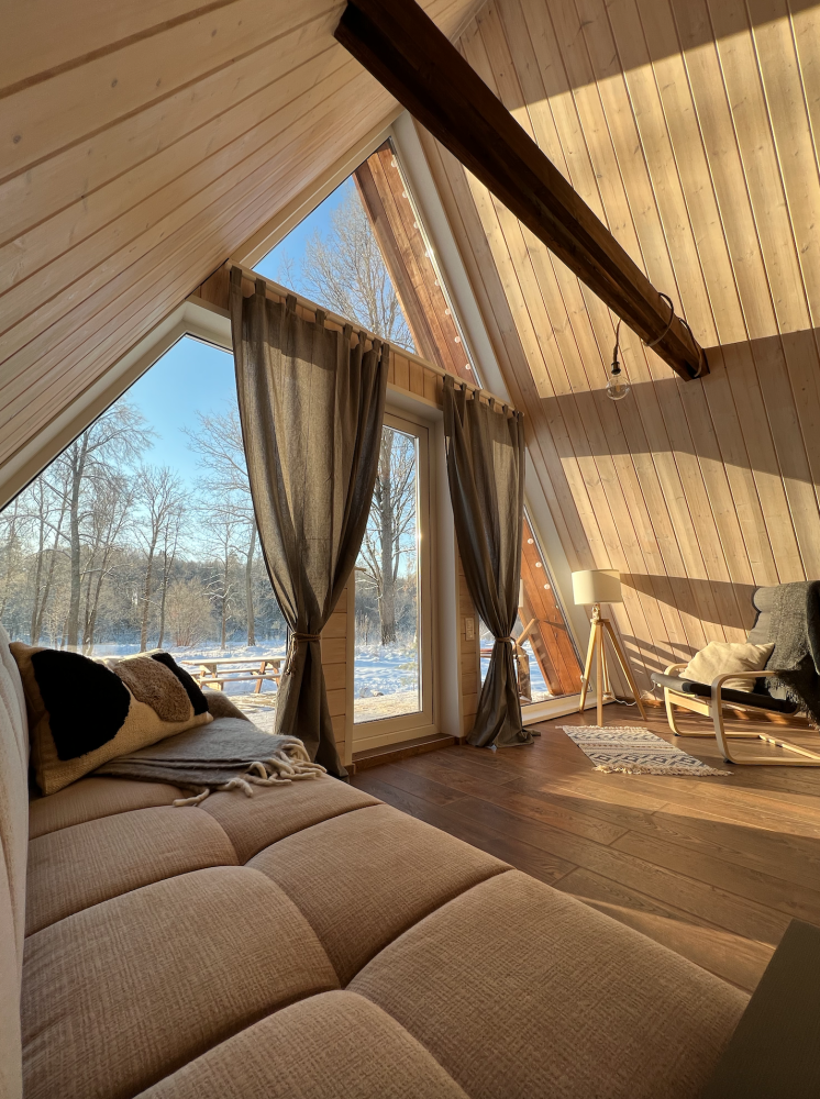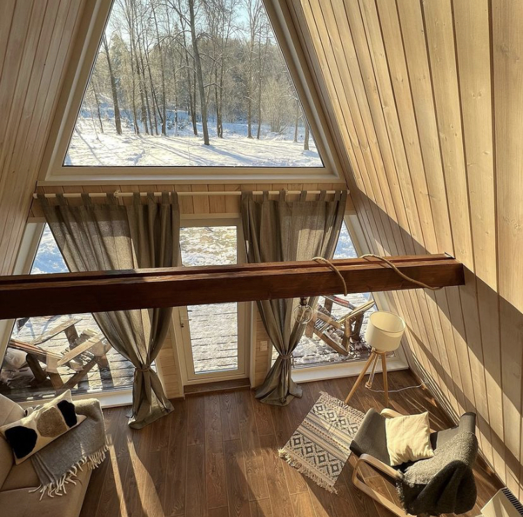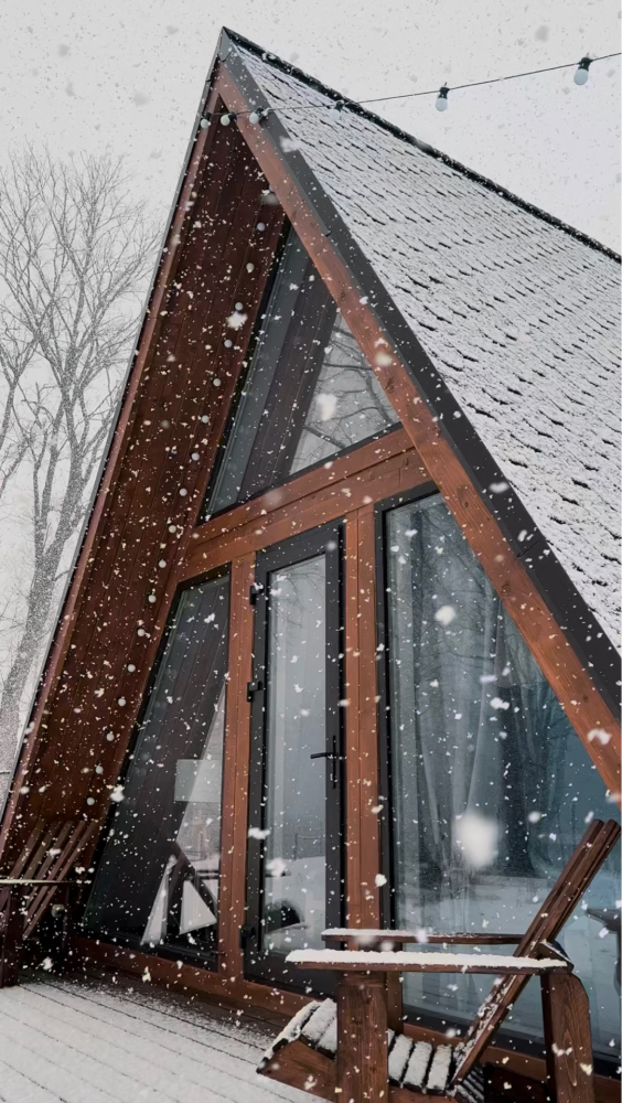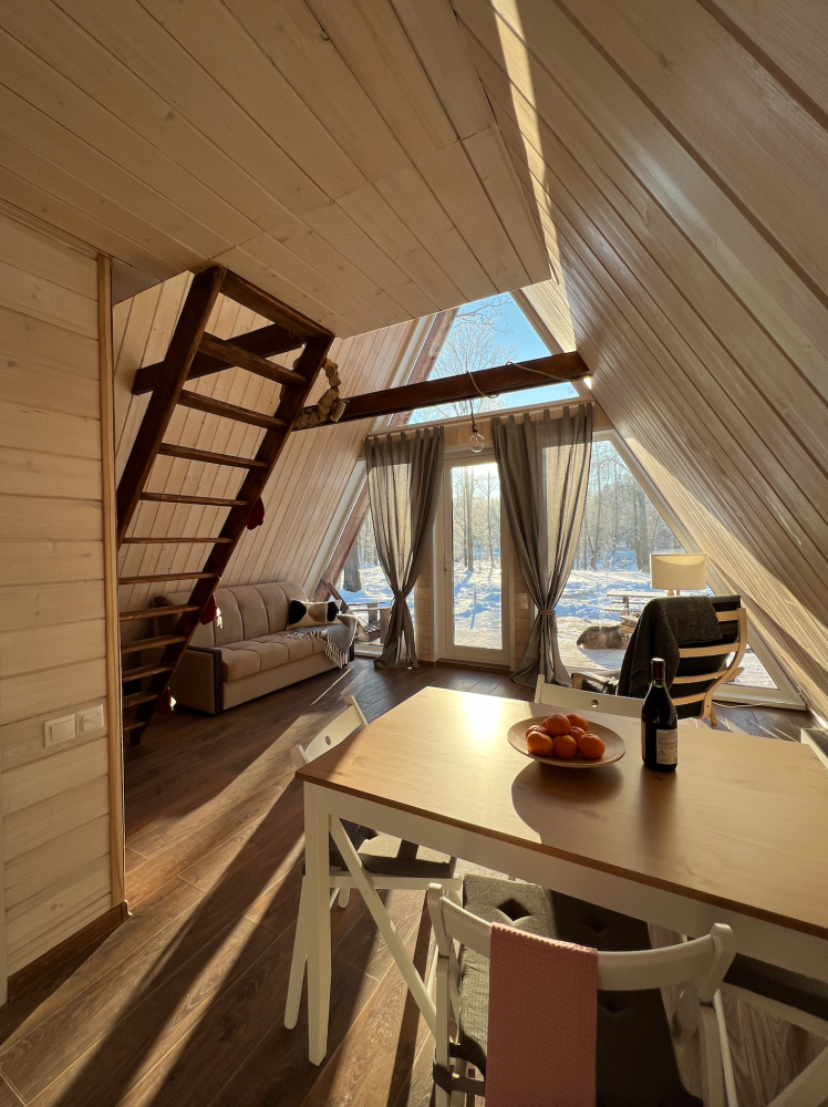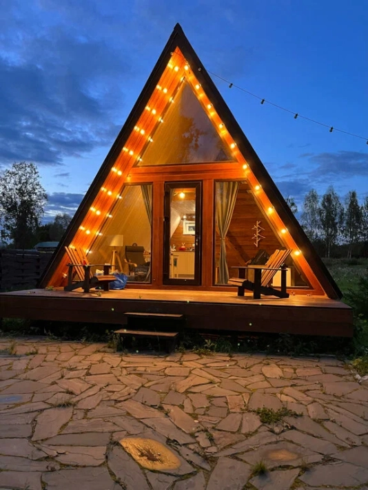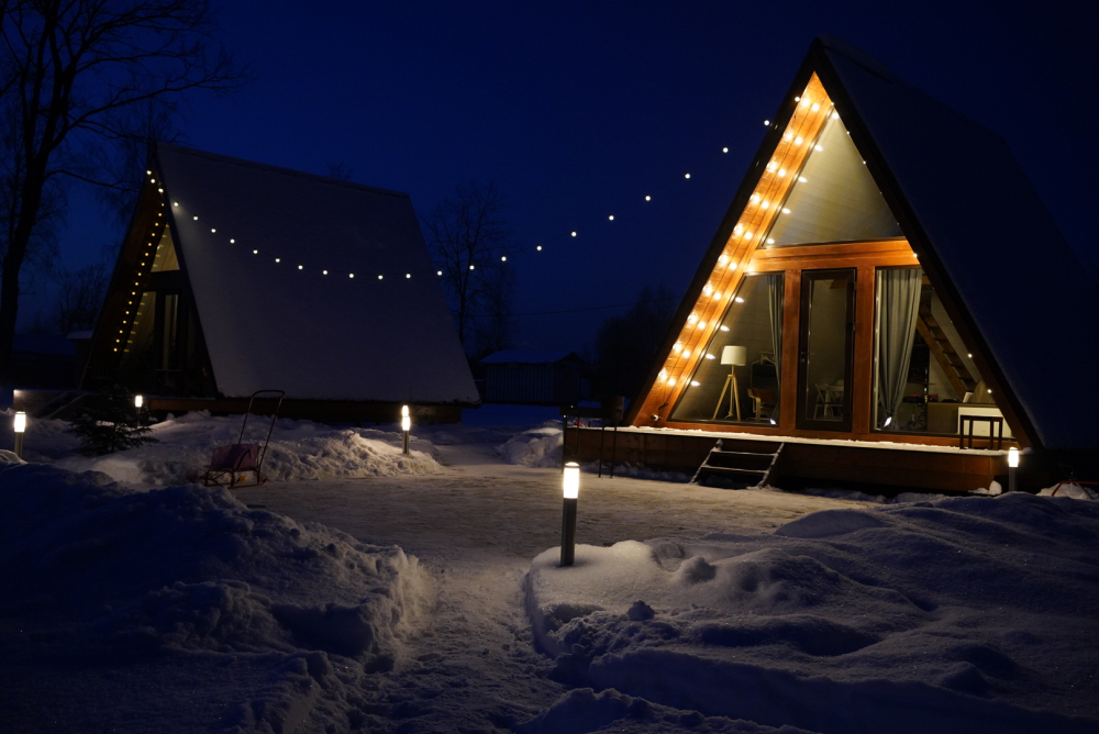 На территории расположено 2 треугольных домика c панорамным остеклением, каждый из которых полностью оборудован для комфортного проживания в любое время года.