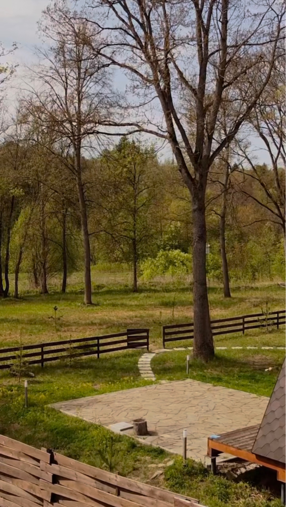 Домики «смотрят» на густой лес и реку, которая находится всего в 50 метрах. Вокруг много места для прогулок и уединения.