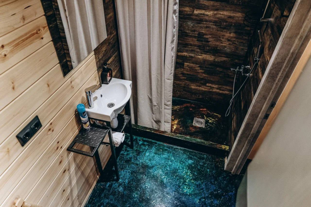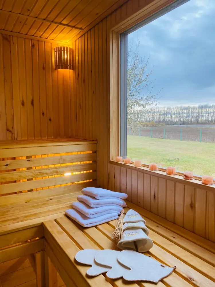 Финская баня с панорамным окном и видом на реку, комнатой отдыха, душевыми и банными принадлежностями.