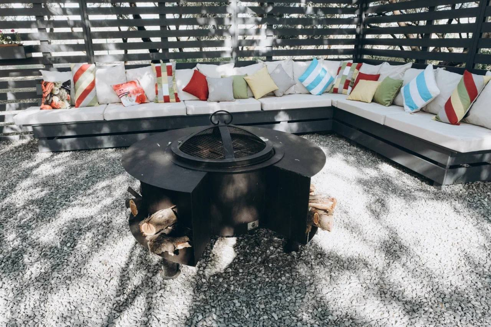 Костровая зона с освещенной беседкой, мягкими подушками и костровой чашей для гриля.