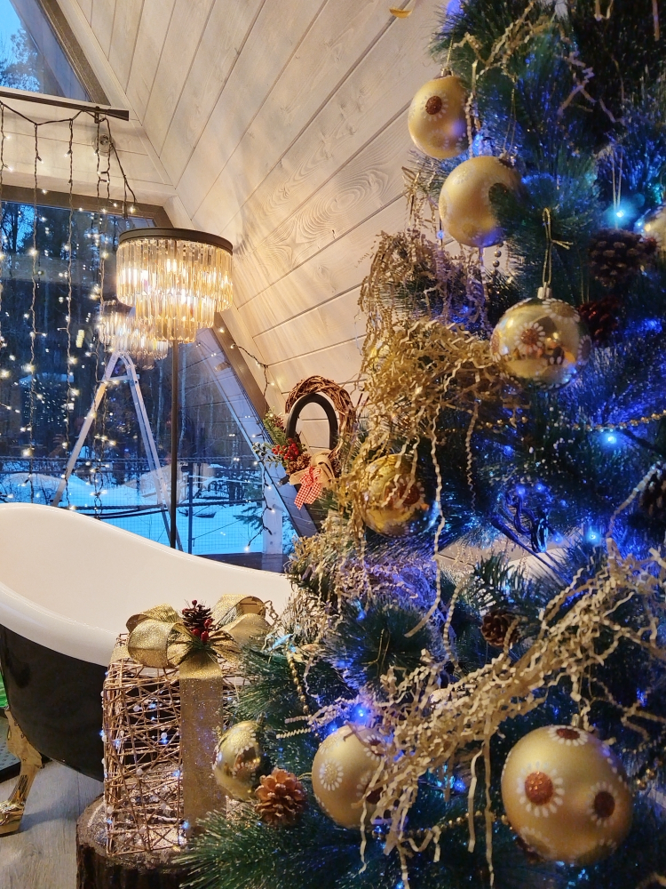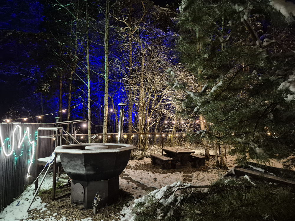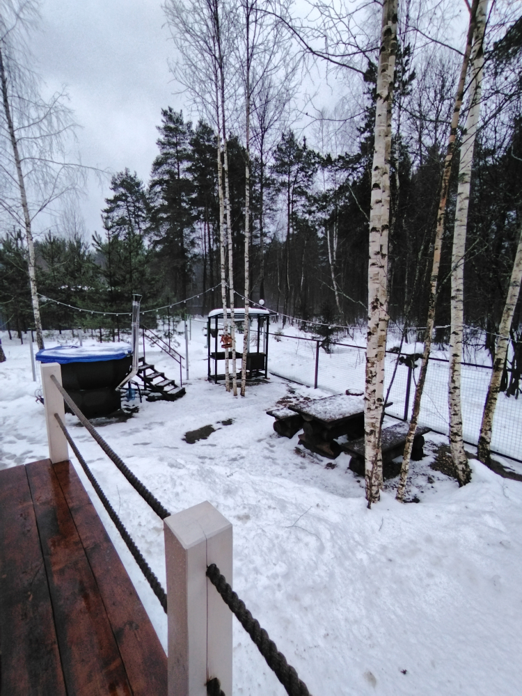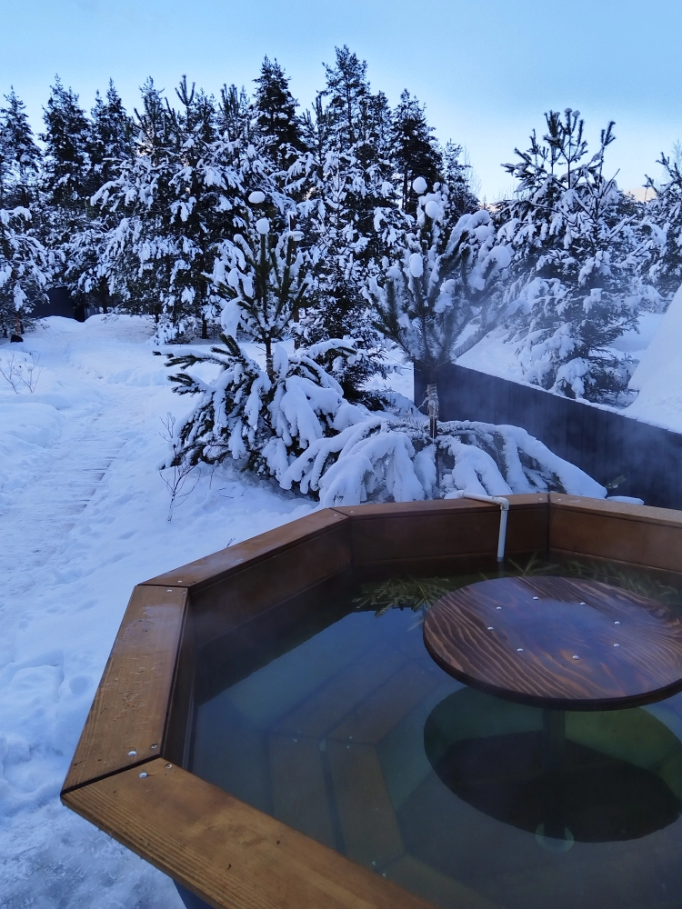 На территории каждого дома есть банный чан с потрясающим видом на лес. Для максимального релакса можно добавить еловые ветки, цитрусы и аромамасла.