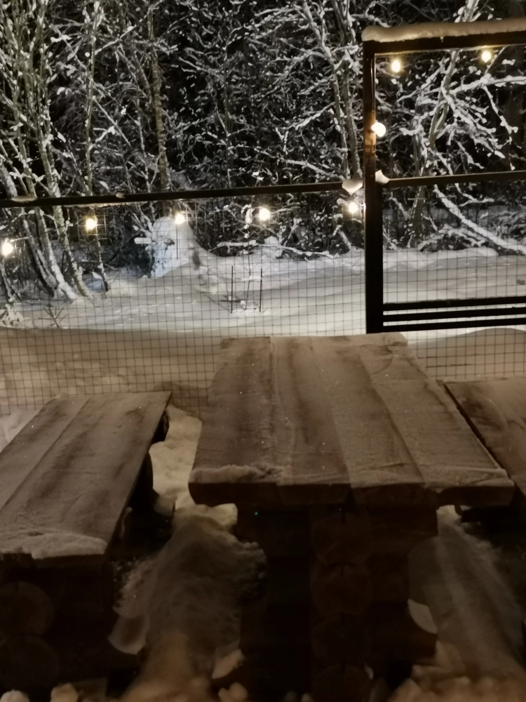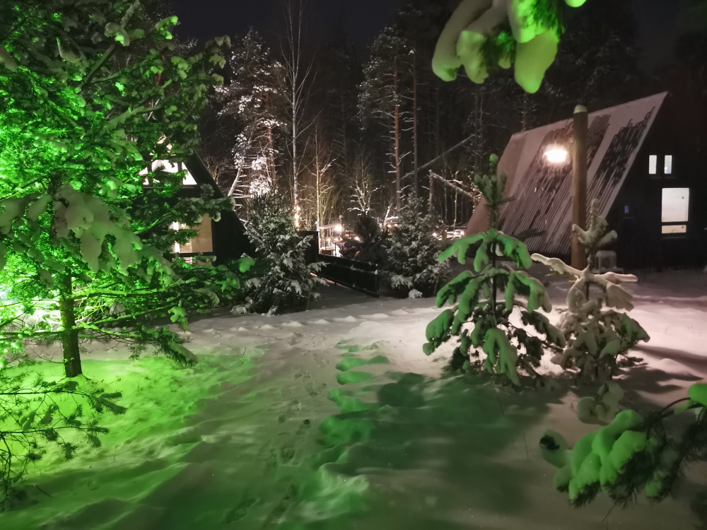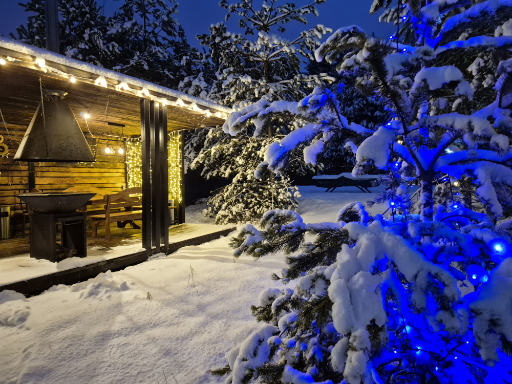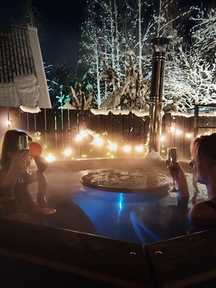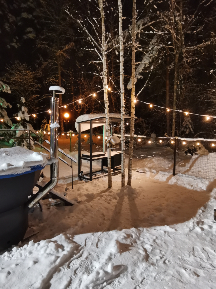 На территории каждого дома есть банный чан с потрясающим видом на лес. Для максимального релакса можно добавить еловые ветки, цитрусы и аромамасла.