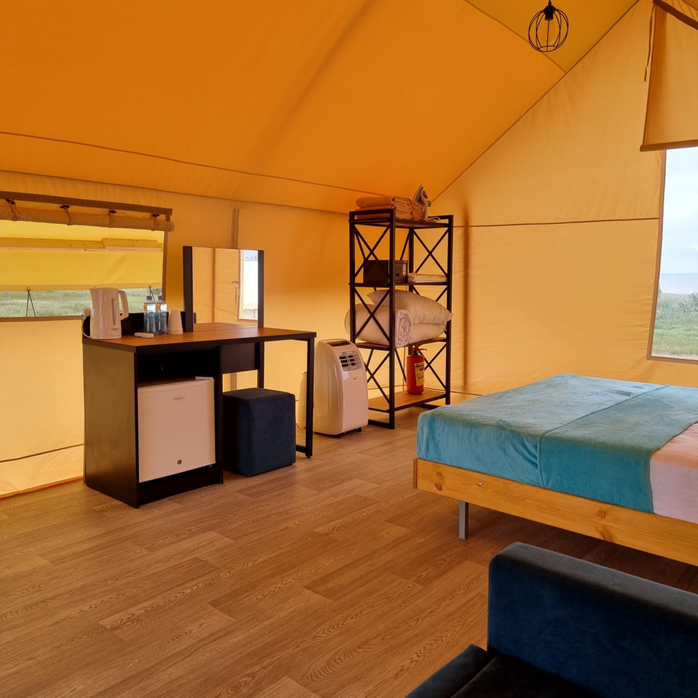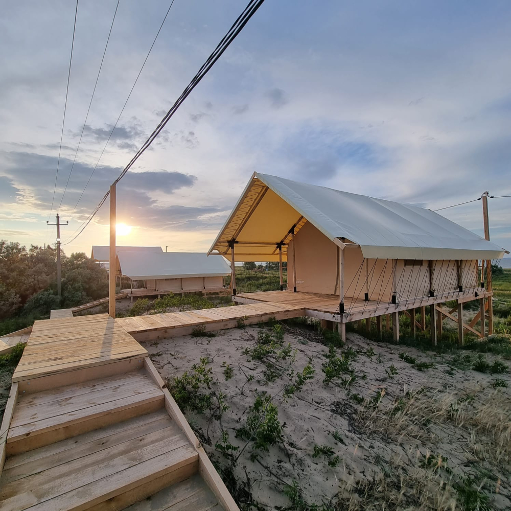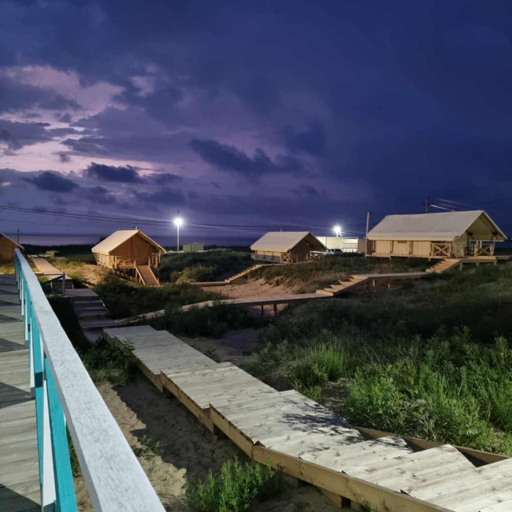 Доступны 31 уютное бунгало на берегу моря на Бугазской косе, каждое рассчитано на 4 человека. В бунгало предусмотрено: