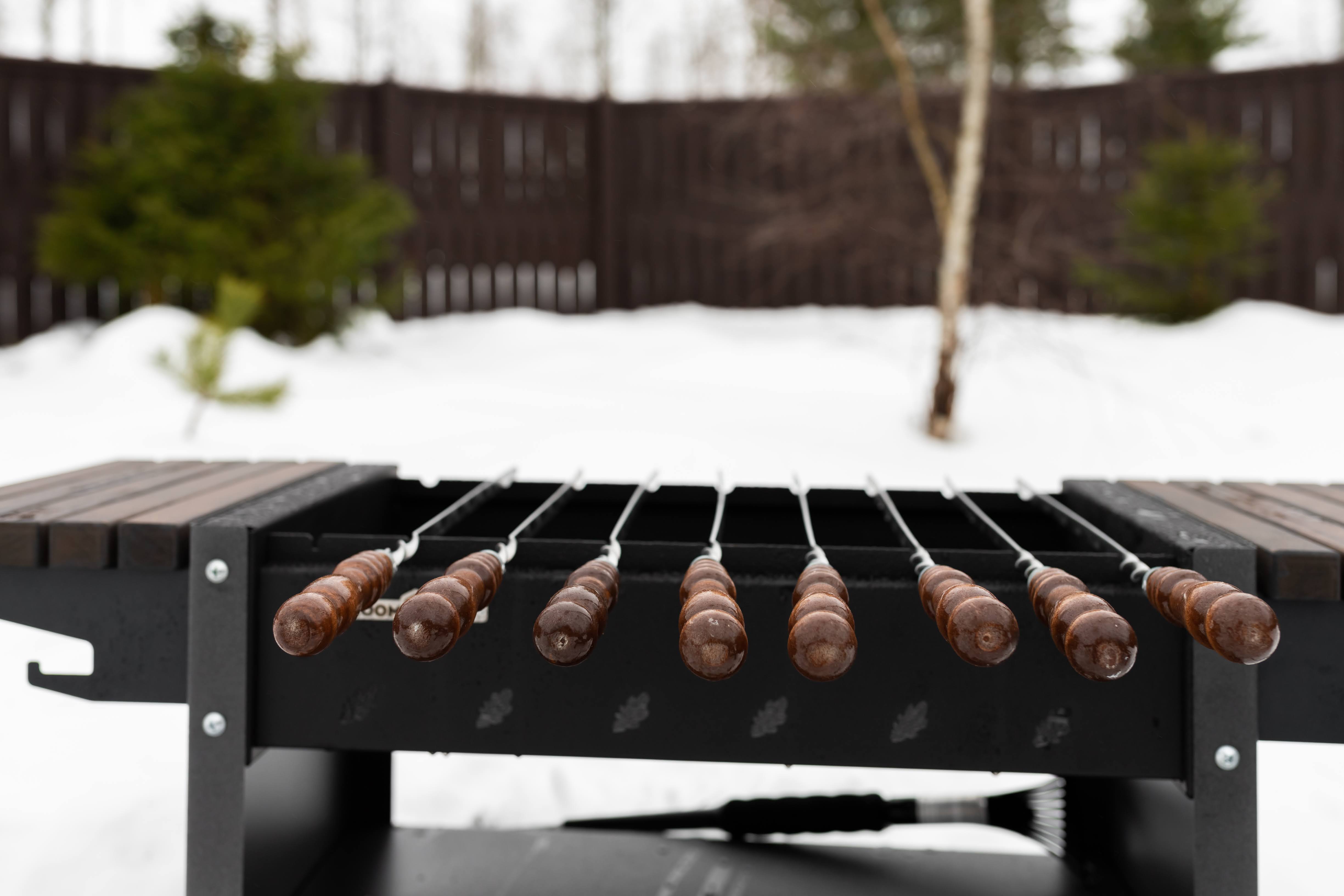Возле домика расположена уютная мангальная зона, где имеется всё необходимое для приготовления блюд на открытом воздухе: мангал, решётки и шампура. Гостям остаётся только взять с собой мясо, розжиг и угли, чтобы насладиться вкусным барбекю в приятной атмосфере.