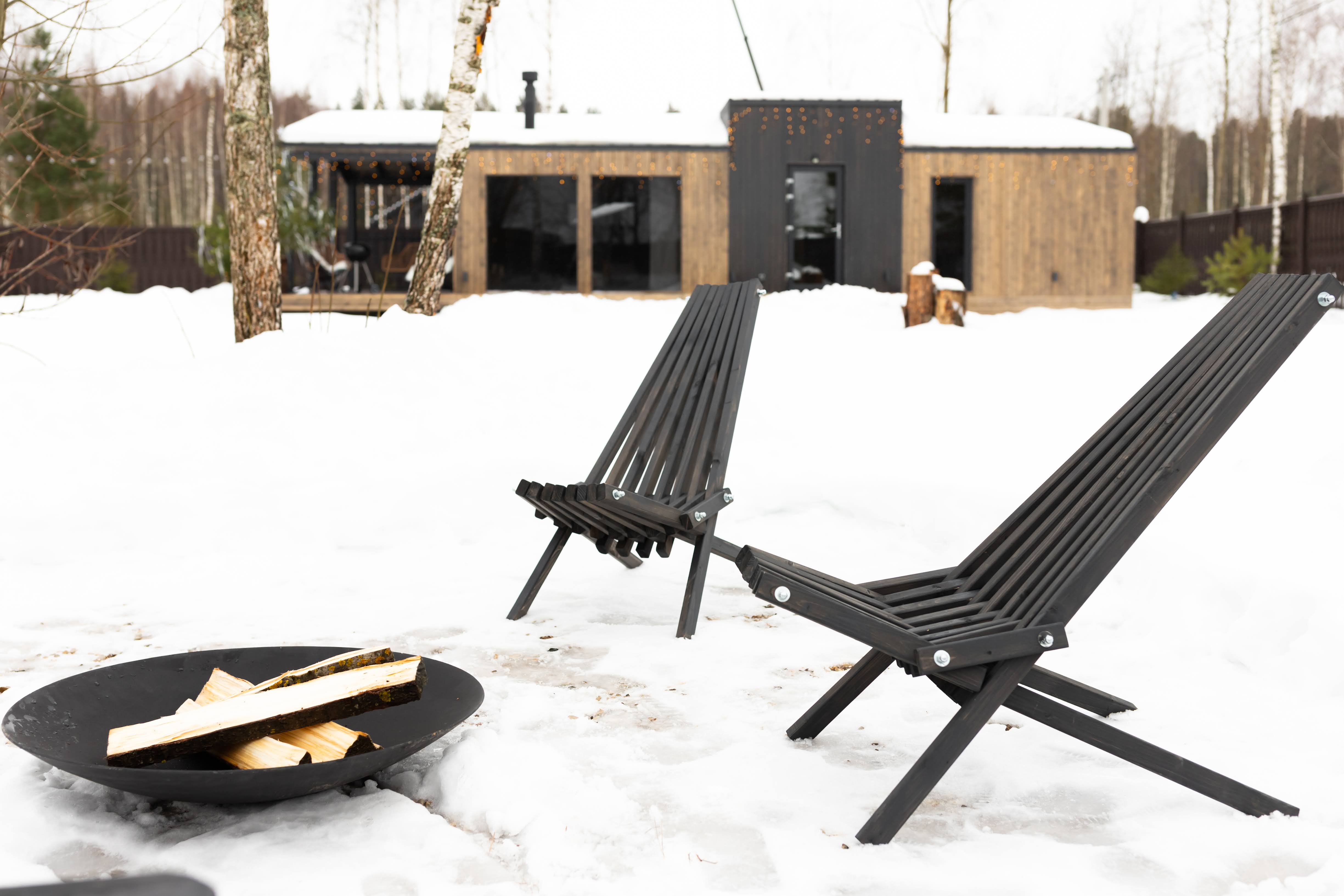 На территории домика обустроена костровая зона, где можно приятно провести время у огня. Для вашего удобства здесь также предусмотрены шезлонги, чтобы расслабиться и насладиться атмосферой природы.