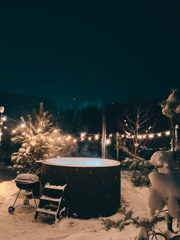 Уличное джакузи с гидромассажем и цветной подсветкой позволяет лежать в горячей воде под открытым небом, окруженным гирляндами огоньков; вмещает 6-8 человек. Стоимость сеанса — 10 000 рублей за 2 часа.