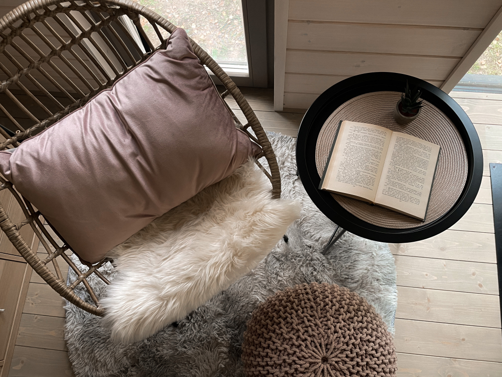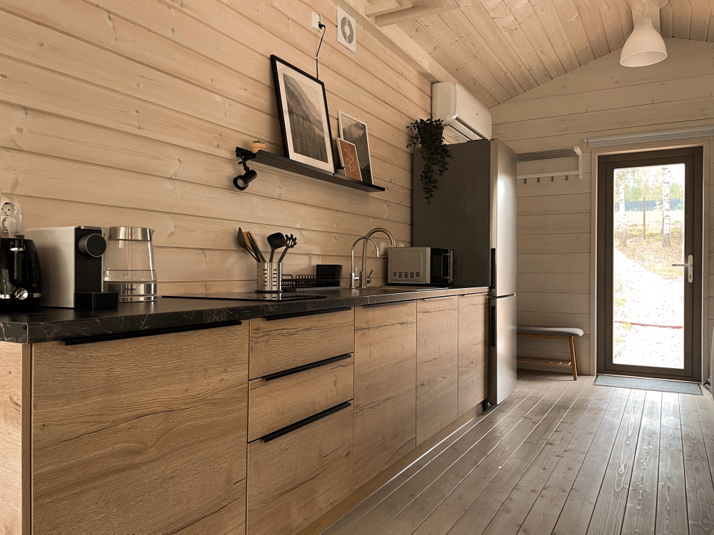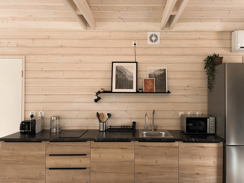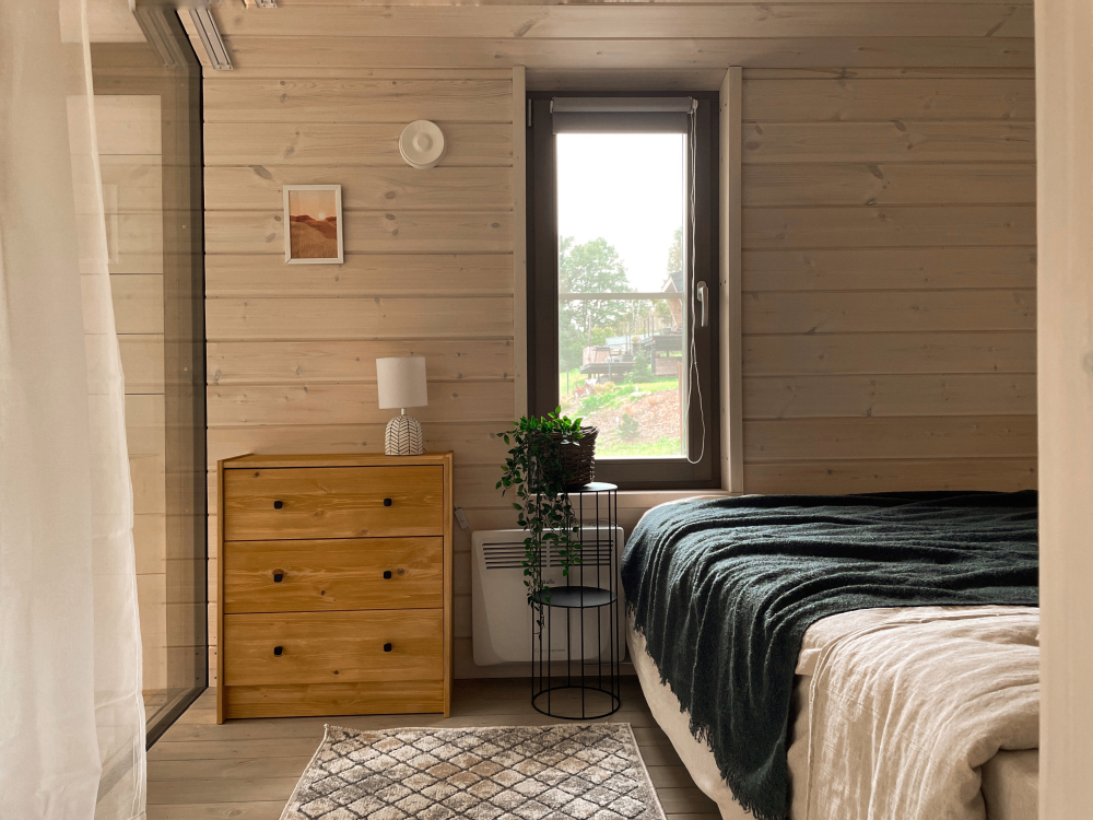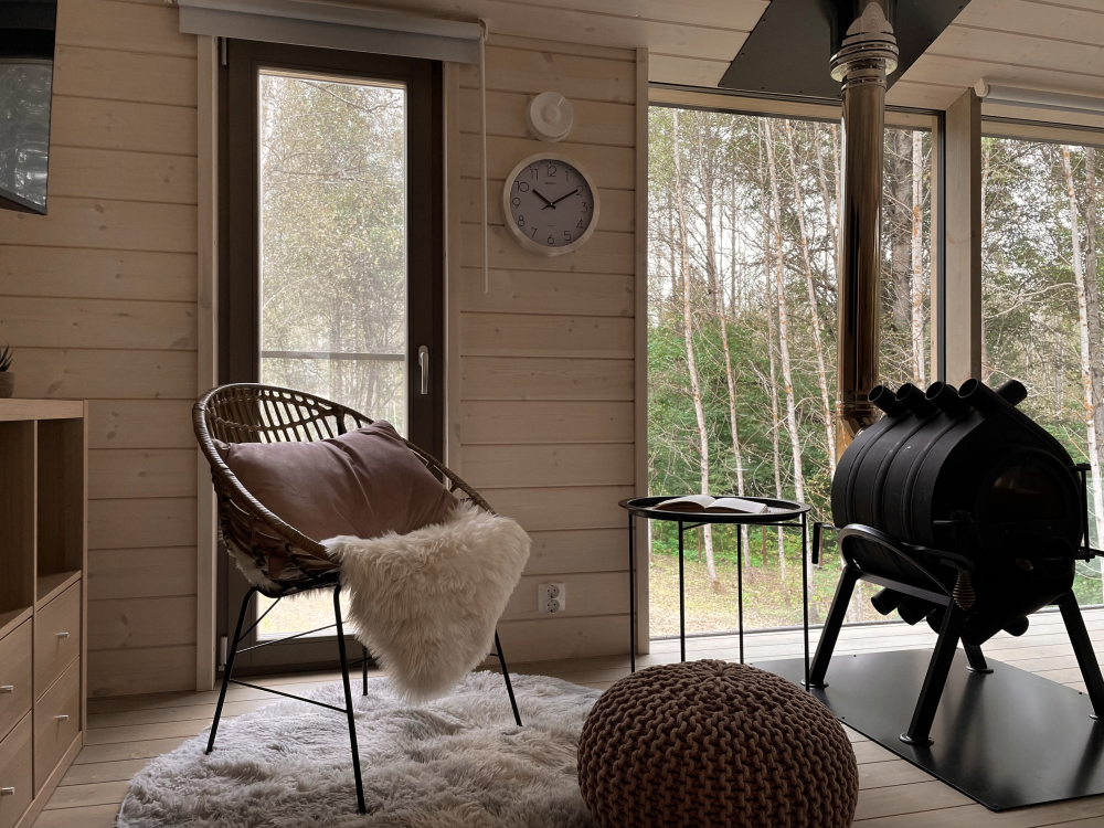 Удобно размещается до 4 человек, с просторной кухней-гостиной, панорамными окнами, раскладным диваном, креслом для чтения и печью-камином. Уютная спальня с двуспальной кроватью и ортопедическим матрасом. По запросу установим детскую люльку.