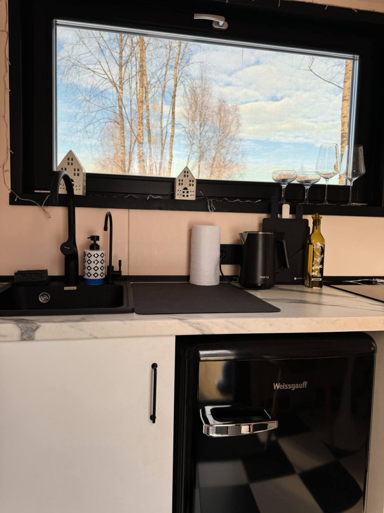 - Кухня: Небольшая кухня со столом, стульями, варочной панелью, холодильником, кофеваркой, чайником и набором посуды. Всегда есть кофе в зернах и кофемолка, чай, сахар, соль и растительное масло.