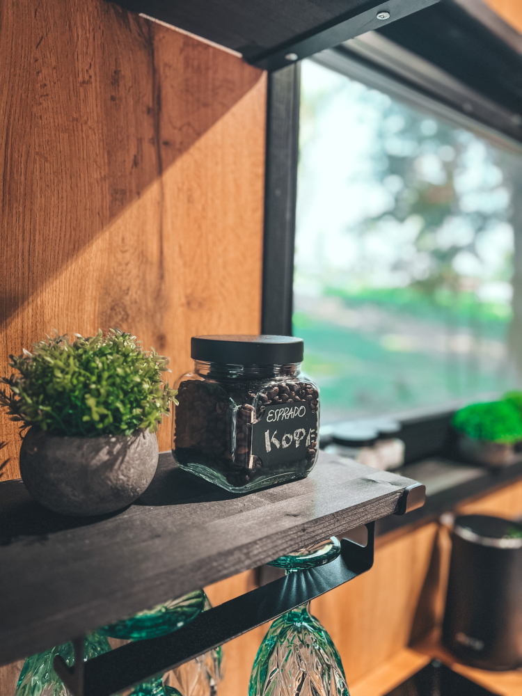 - Дизайнерская посуда, кофе в зернах и кофемолка, чай, сахар, соль и растительное масло.