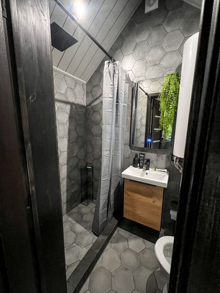 Современный санузел с душевой, феном и необходимыми средствами гигиены.