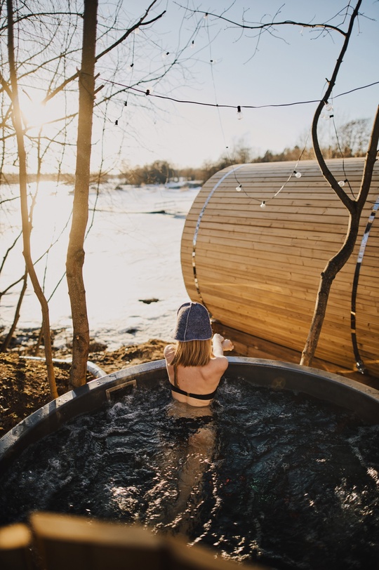 Финская сауна и тёплая купель фурако прямо на берегу.
