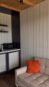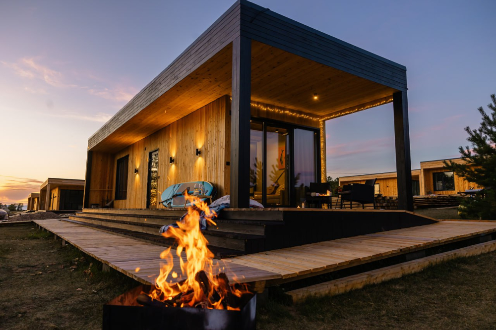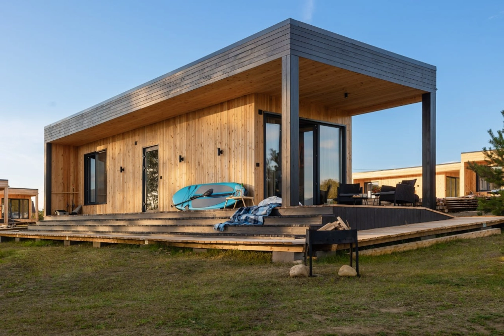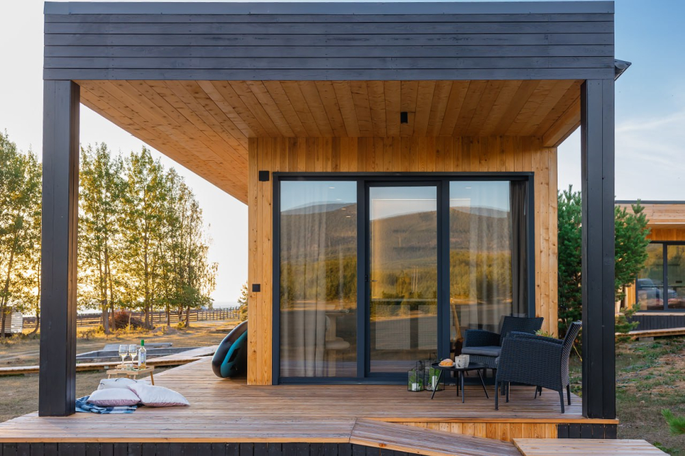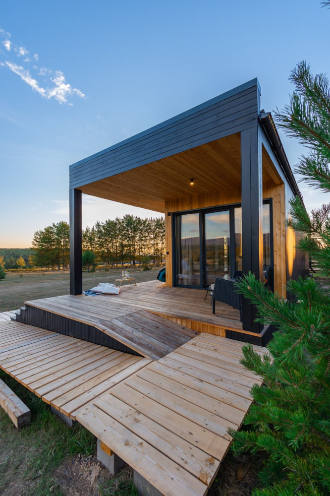 Модульный дом: 28 кв. м, с панорамным окном и террасой.