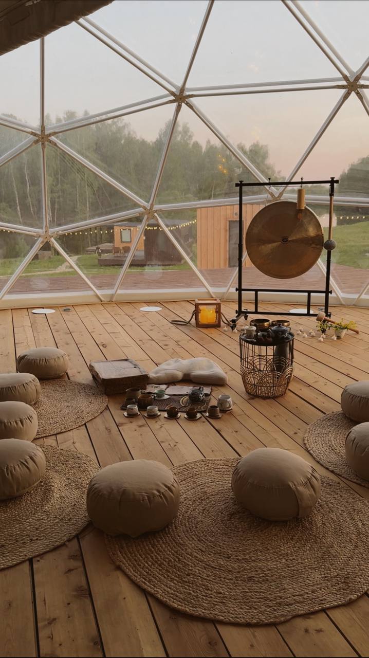 Уют и комфорт: Все домики сделаны из дерева и подходят для проживания круглый год. На территории предусмотрены площадки для пикника и барбекю, а также просторная терраса, идеально подходящая для занятий йогой и проведения йога-ретритов.