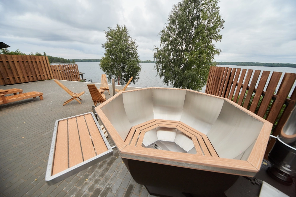 Дровяная баня и банный чан (на 2-4 человека) с комнатой отдыха, душем и террасой с видом на озеро (за доп. плату)