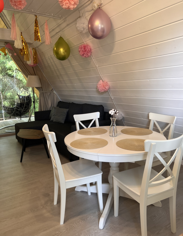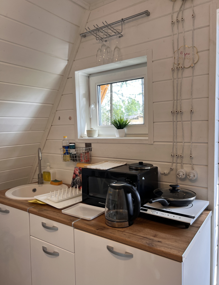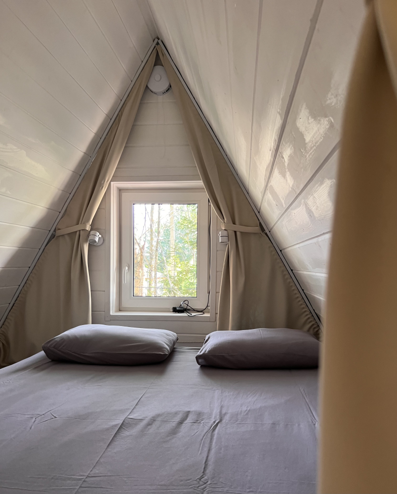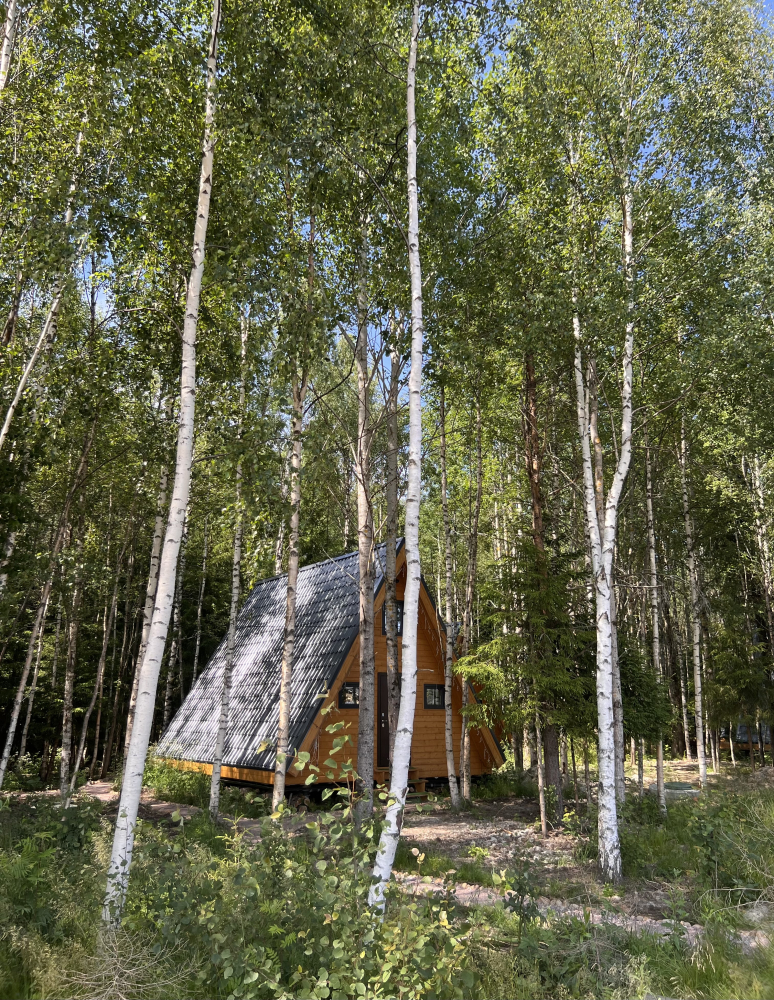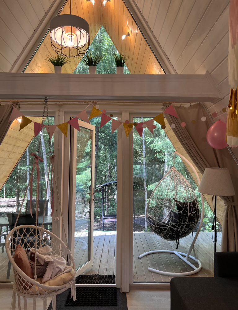 8 домиков A-frame , каждый из которых рассчитан на проживание 2-4 человек , имеют свою террасу с мангалом и зоной отдыха.