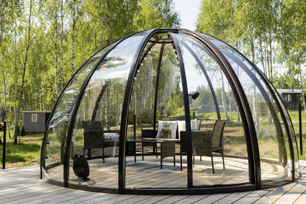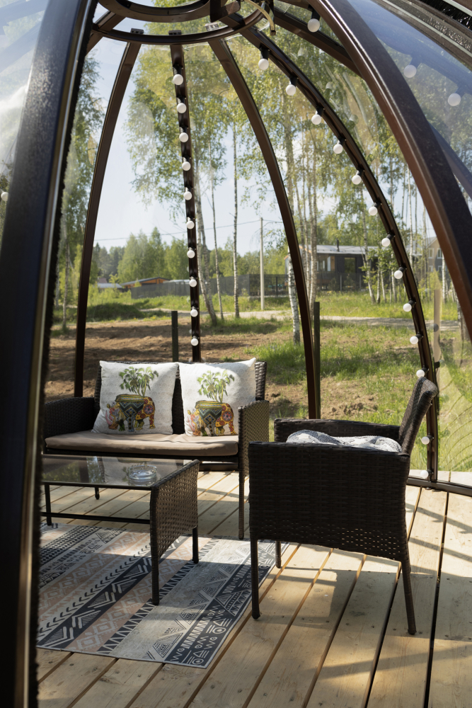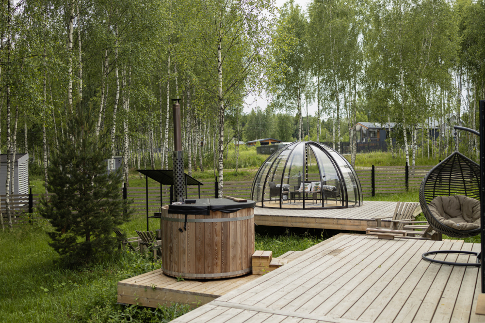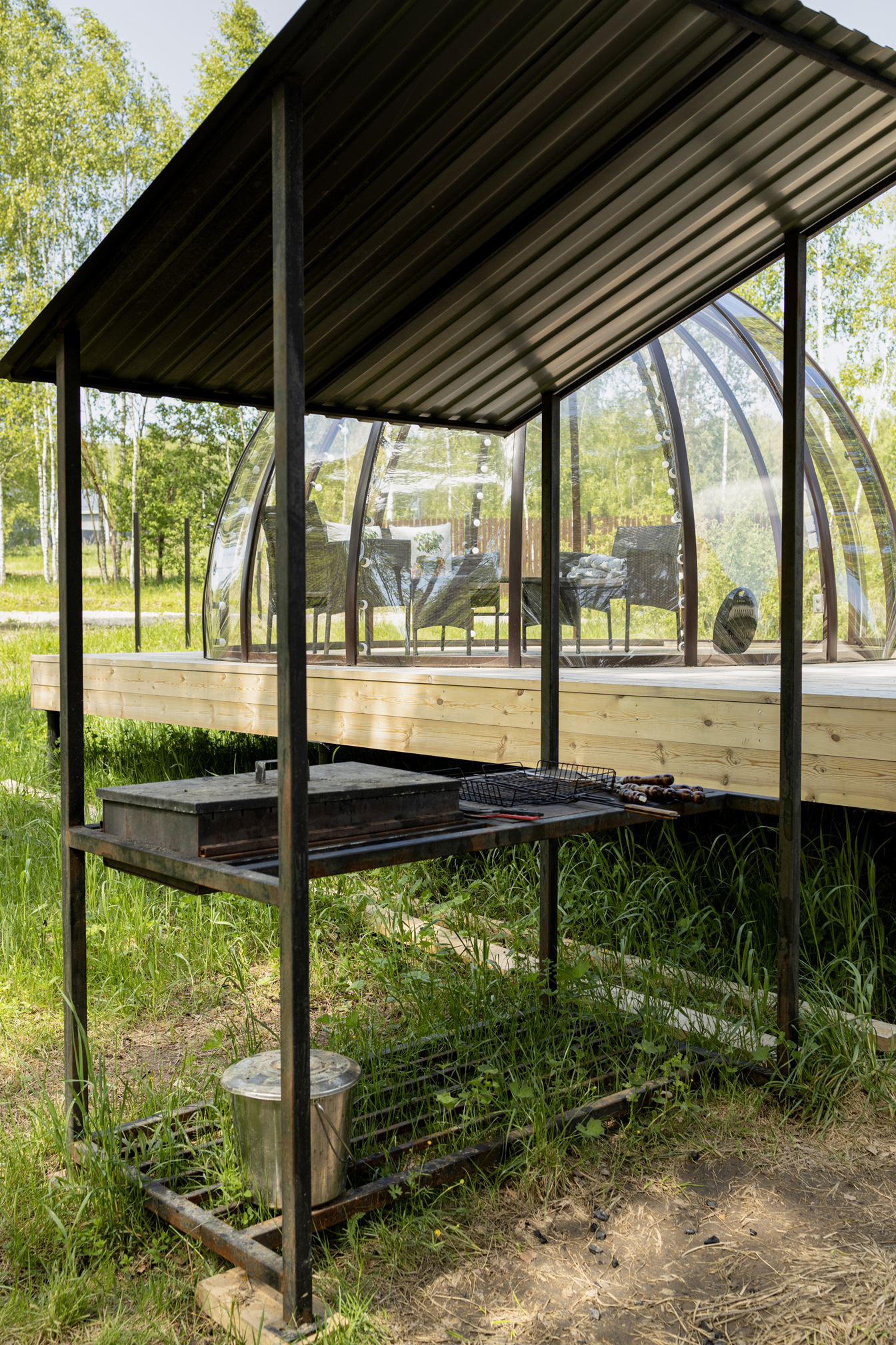 На открытой веранде оборудована зона для отдыха, где дружно вписались в обстановку необычная беседка-иглу и бочка-фурако, из которой бесконечно долго можно смотреть, как другие жарят что-нибудь вкусненькое на гриле или мангале, а еще за звездами, невероятным количеством звезд (у нас их много, обещаем).