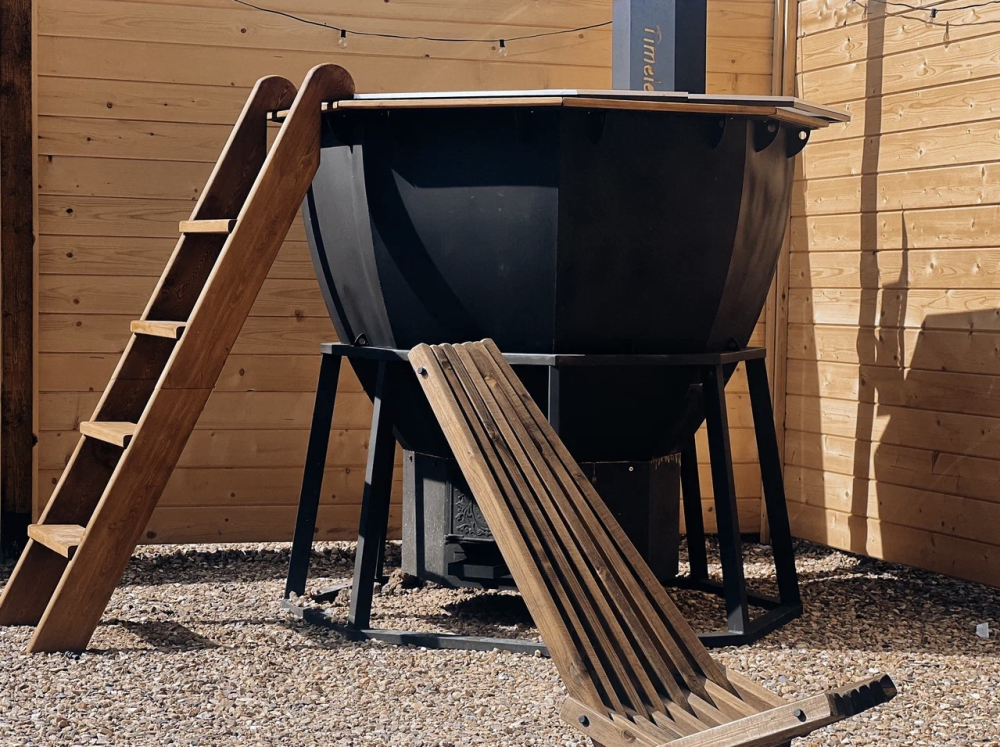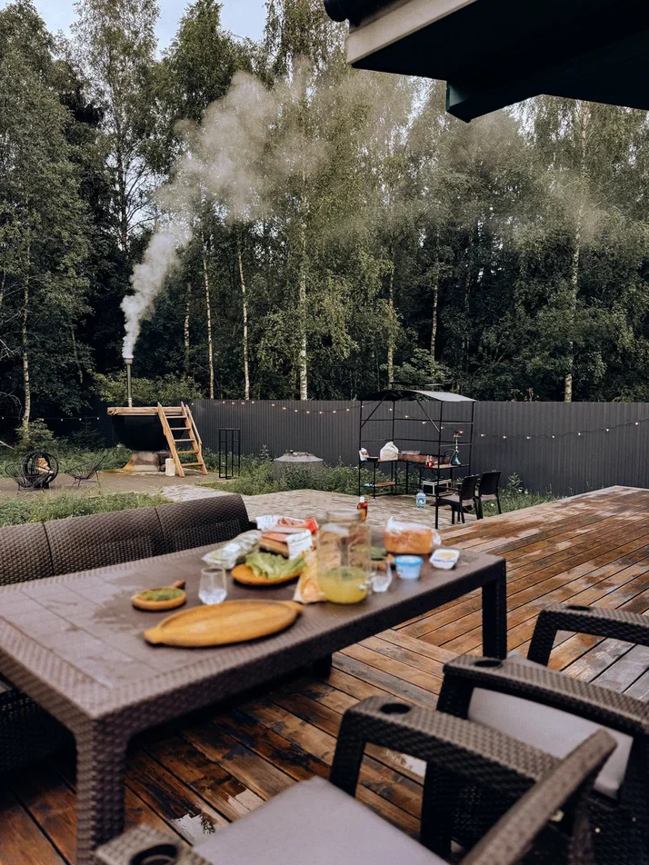 со своей индивидуальной территорией где стоит мангал, кострище, зона для загара, терраса и купель.