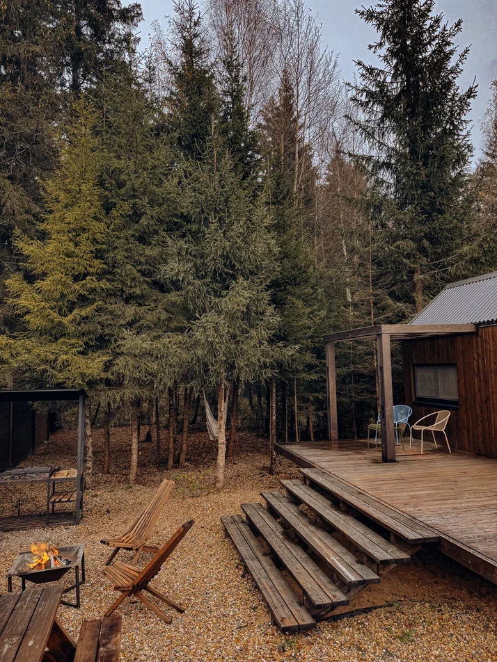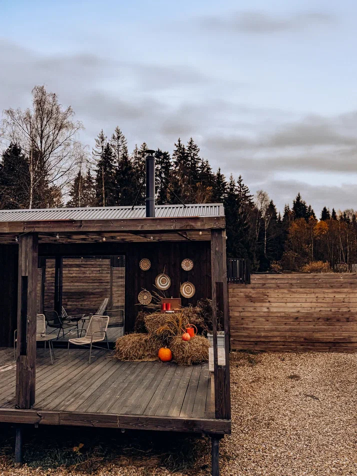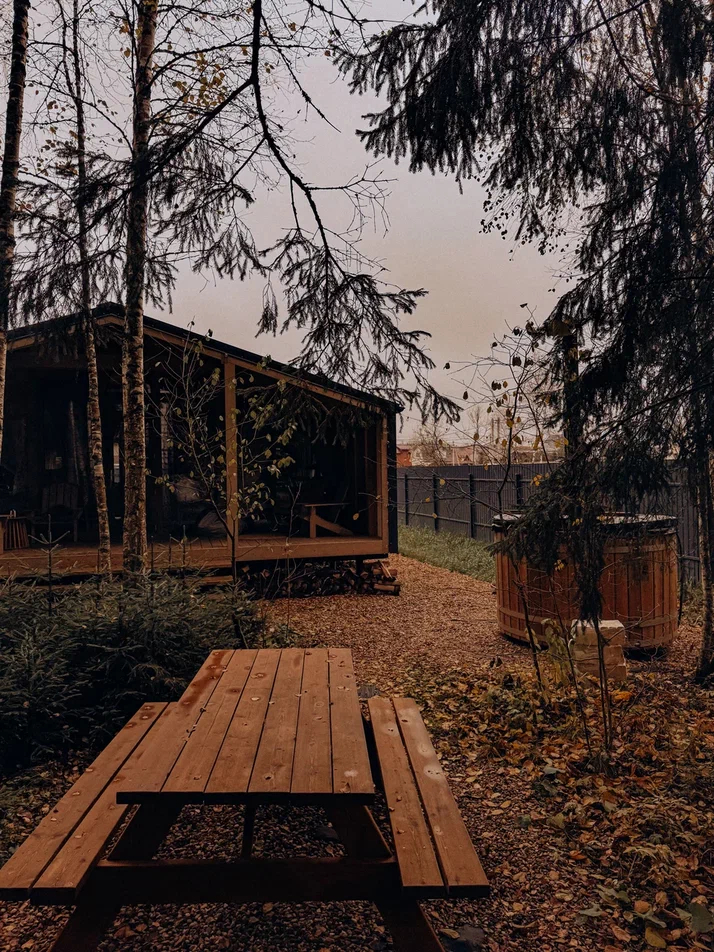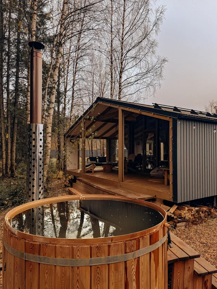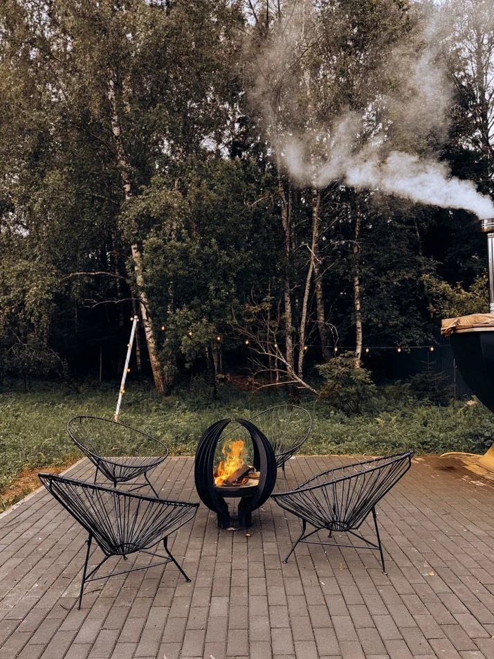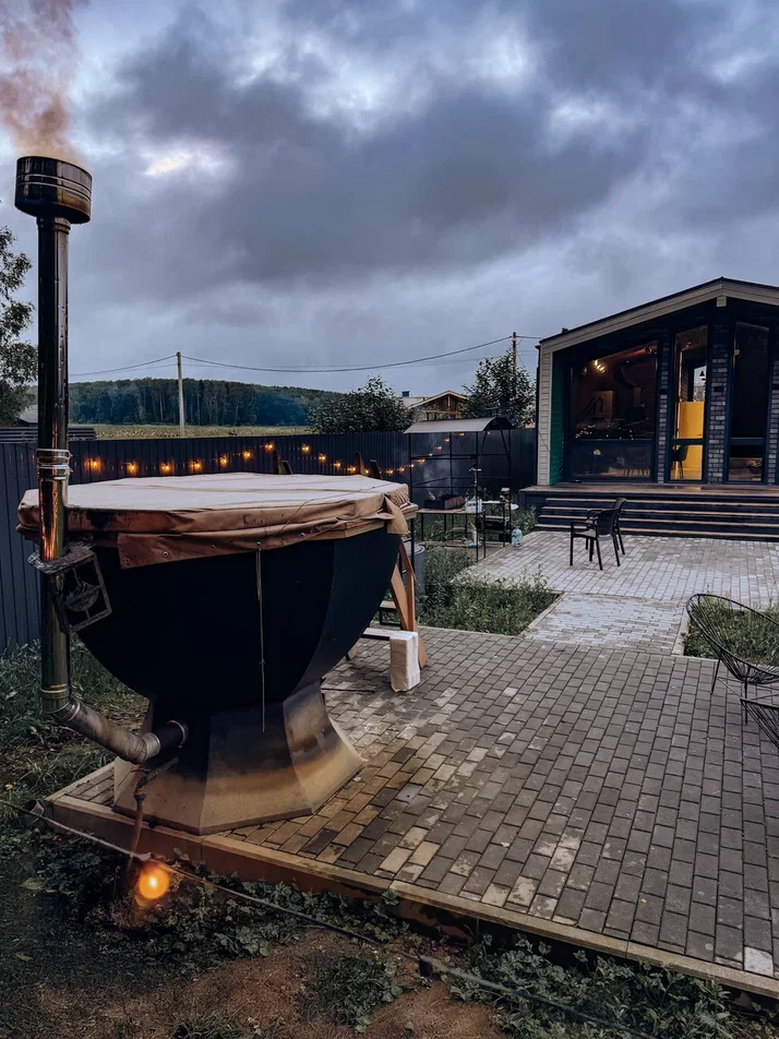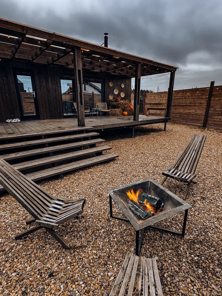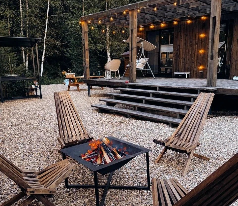 с уютным дизайном внутри со своей индивидуальной территорией, где стоит мангал, кострище, зона отдыха, терраса и купель.