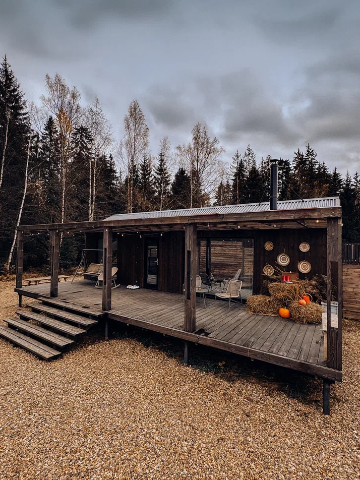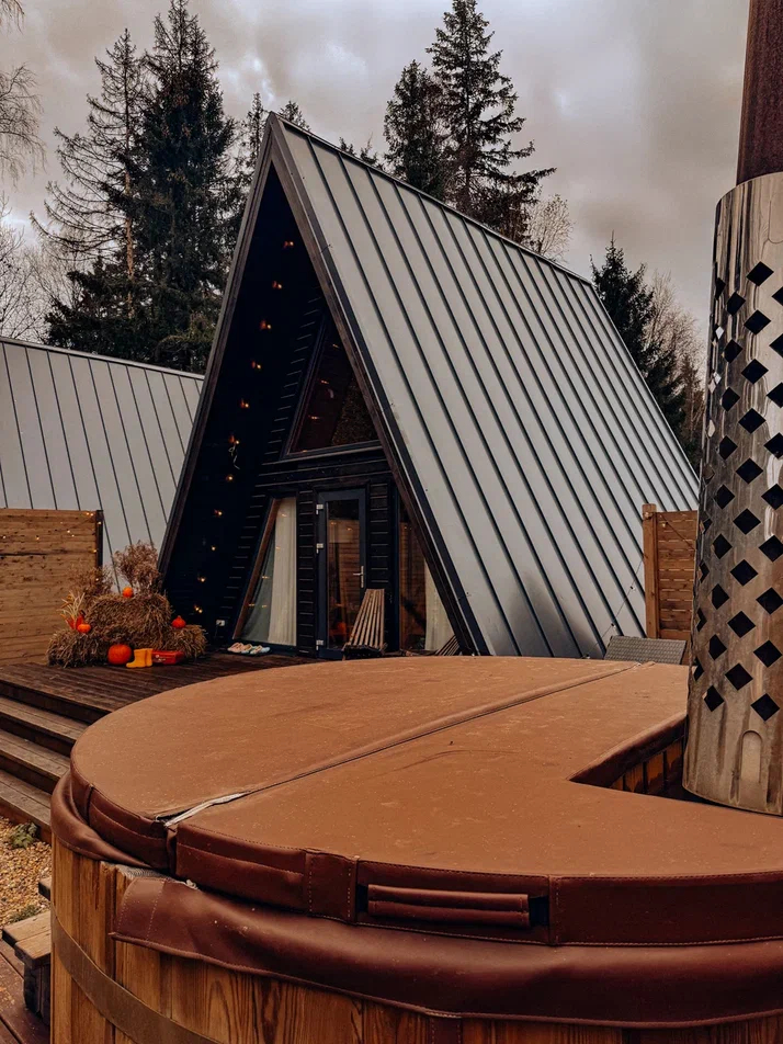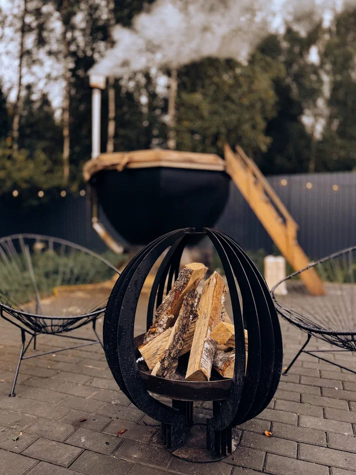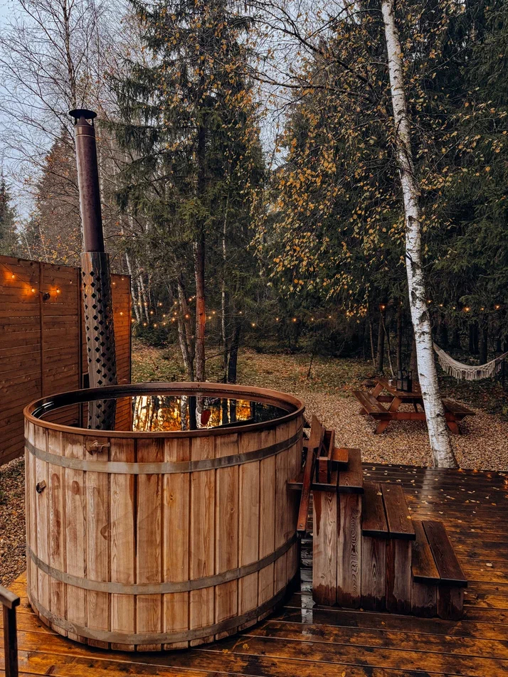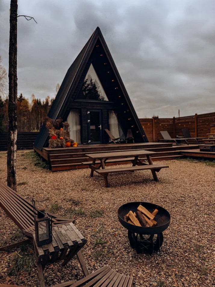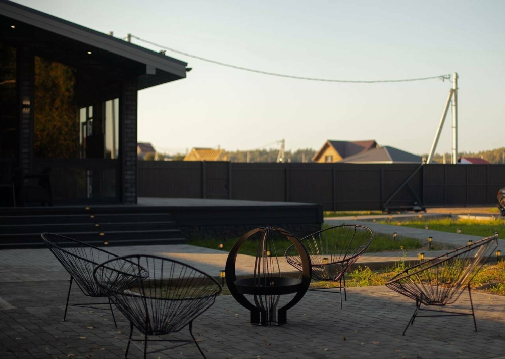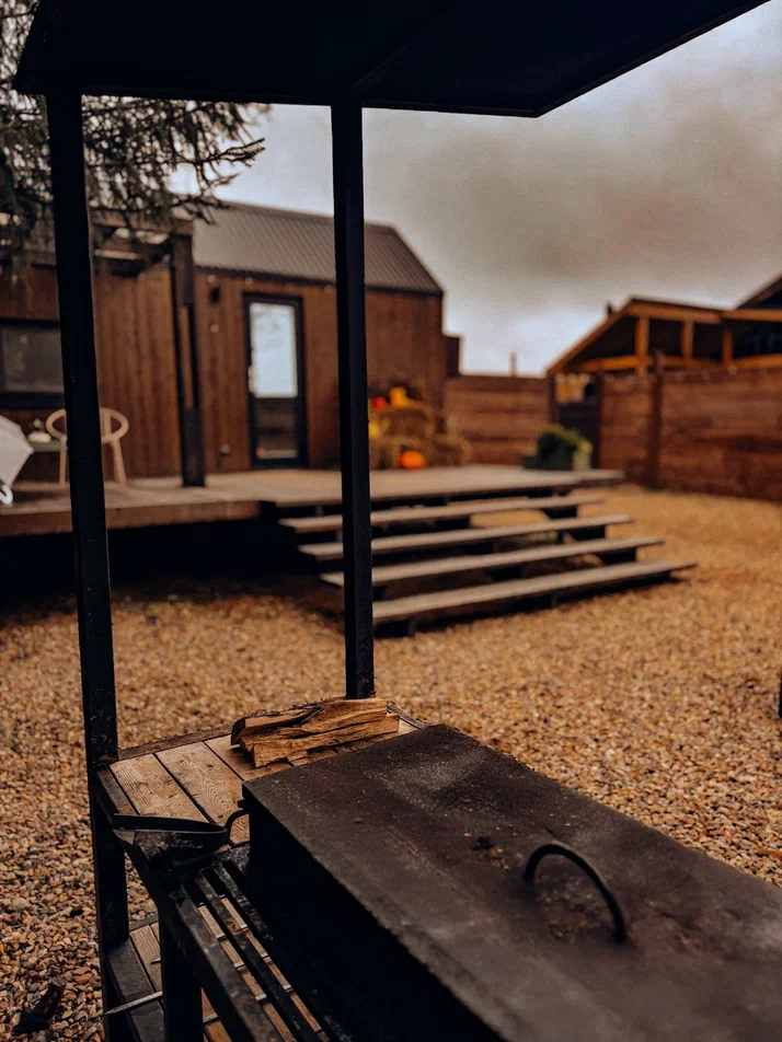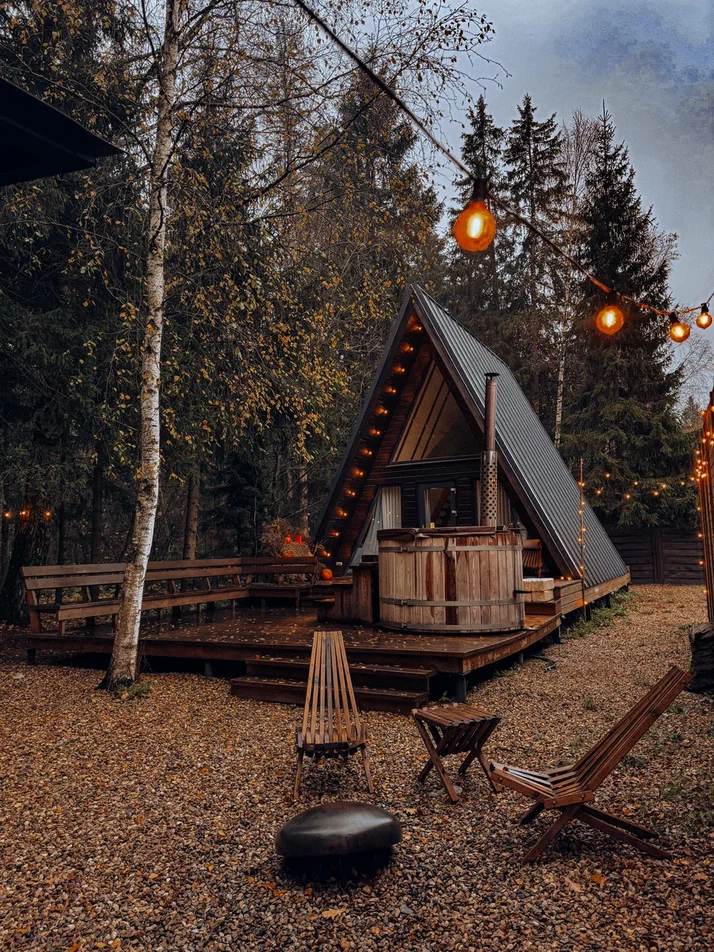 с уютным дизайном внутри со своей индивидуальной территорией, где стоит мангал, кострище, зона отдыха, терраса и купель.