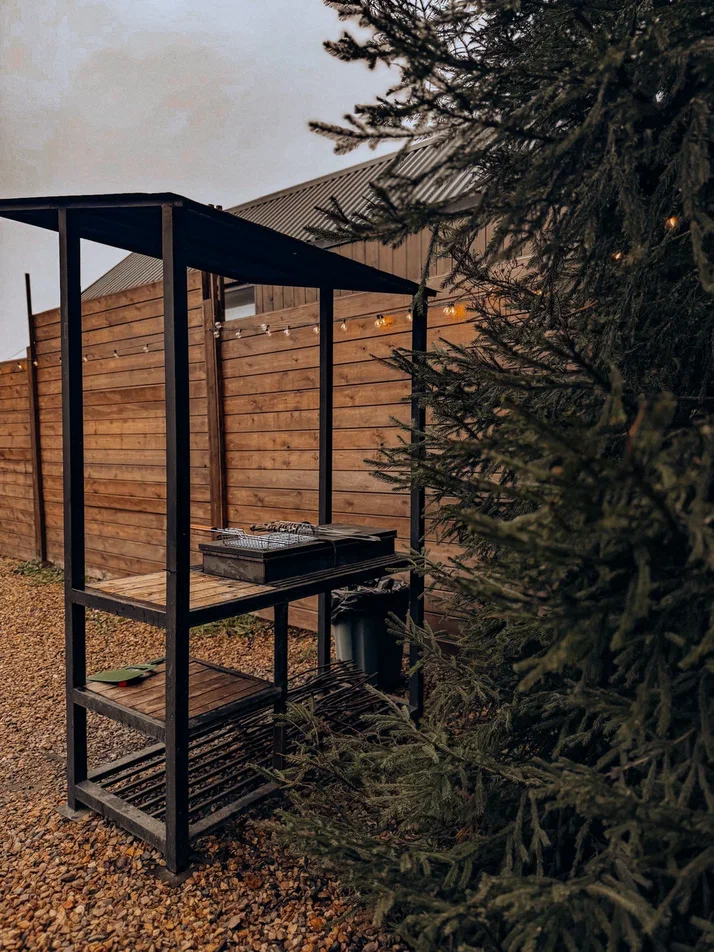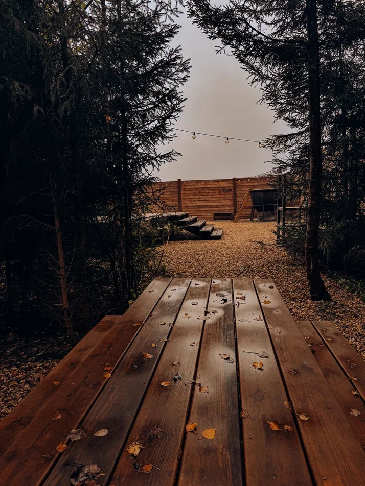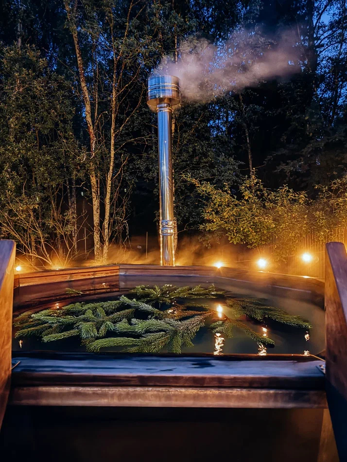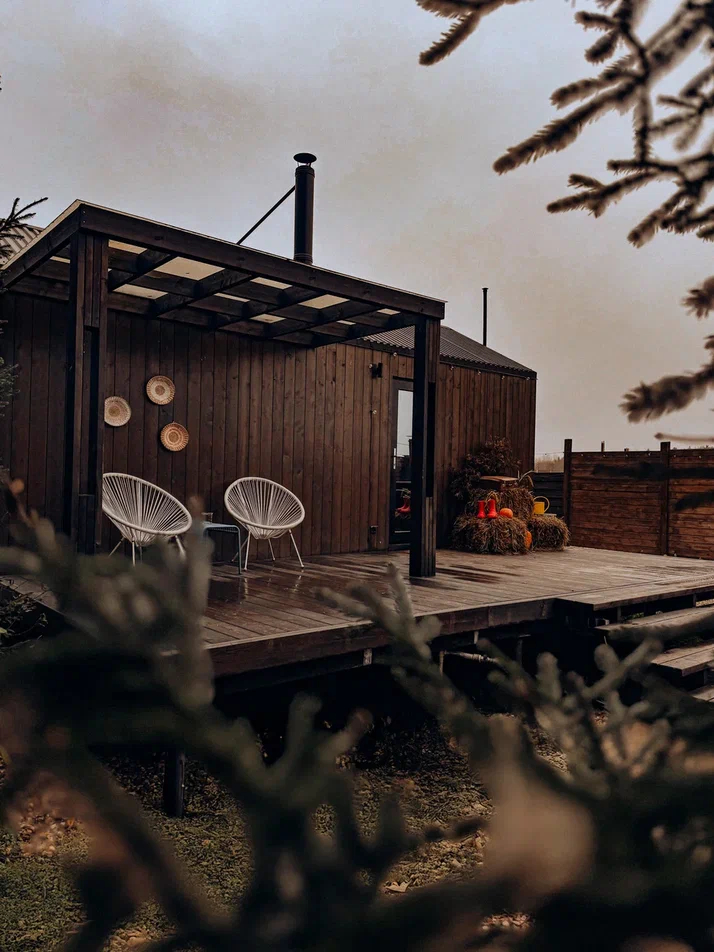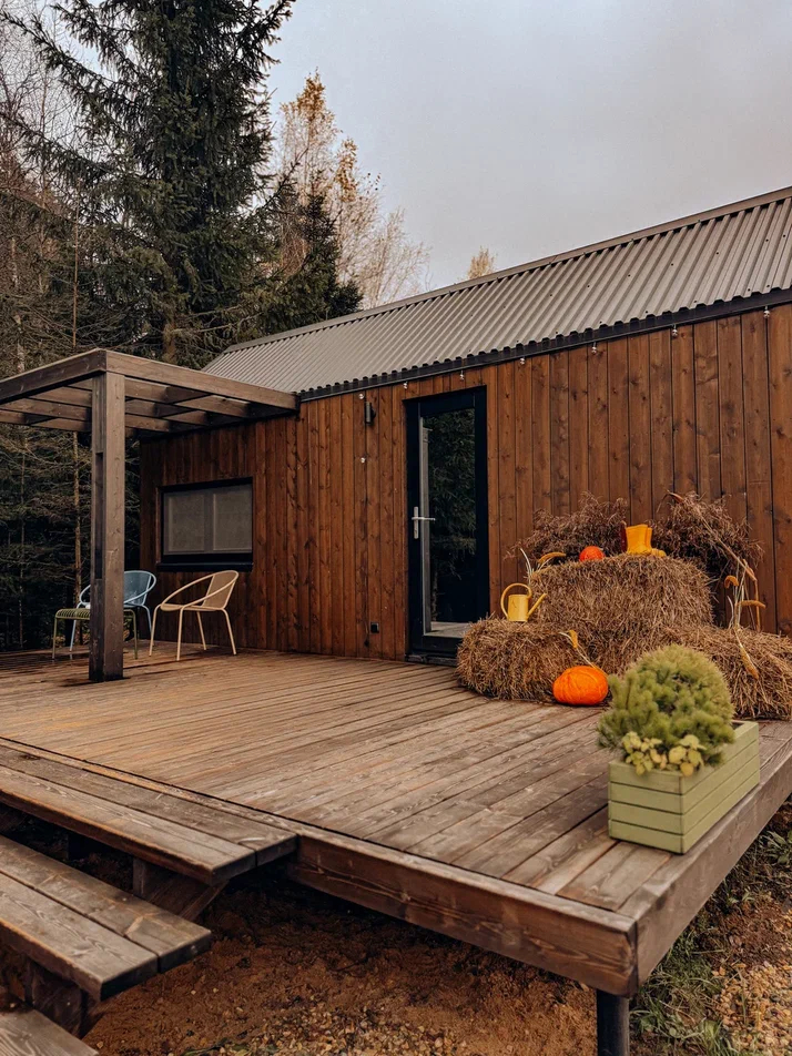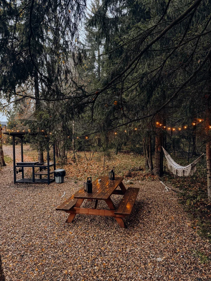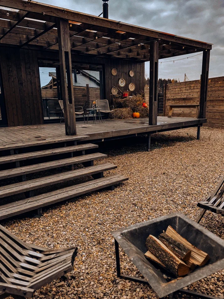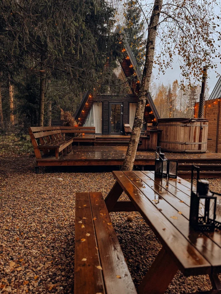 с уютным дизайном внутри со своей индивидуальной территорией, где стоит мангал, кострище, зона отдыха, терраса и купель.