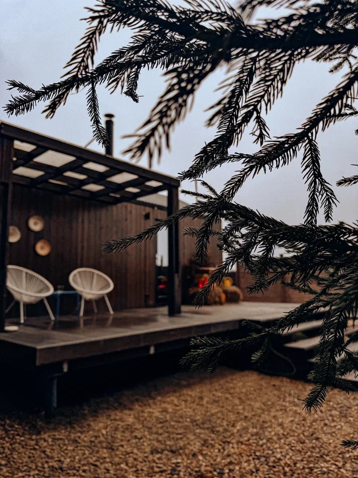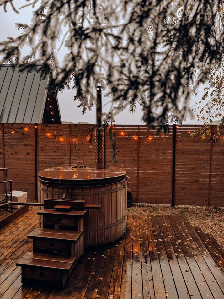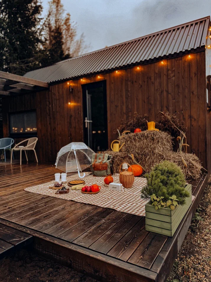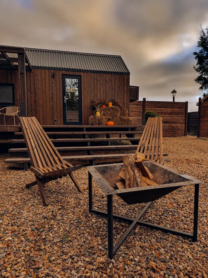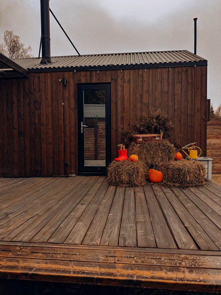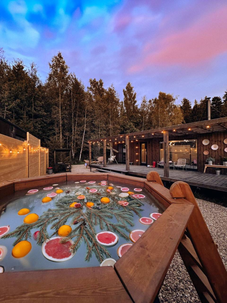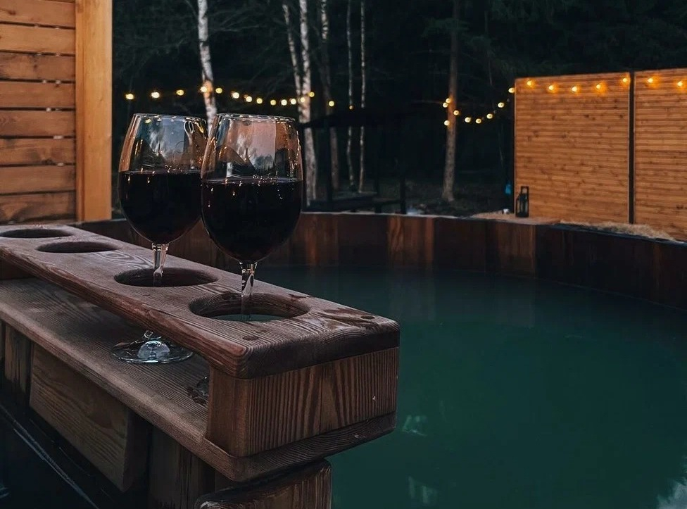 с уютным дизайном внутри со своей индивидуальной территорией, где стоит мангал, кострище, зона отдыха, терраса и купель.