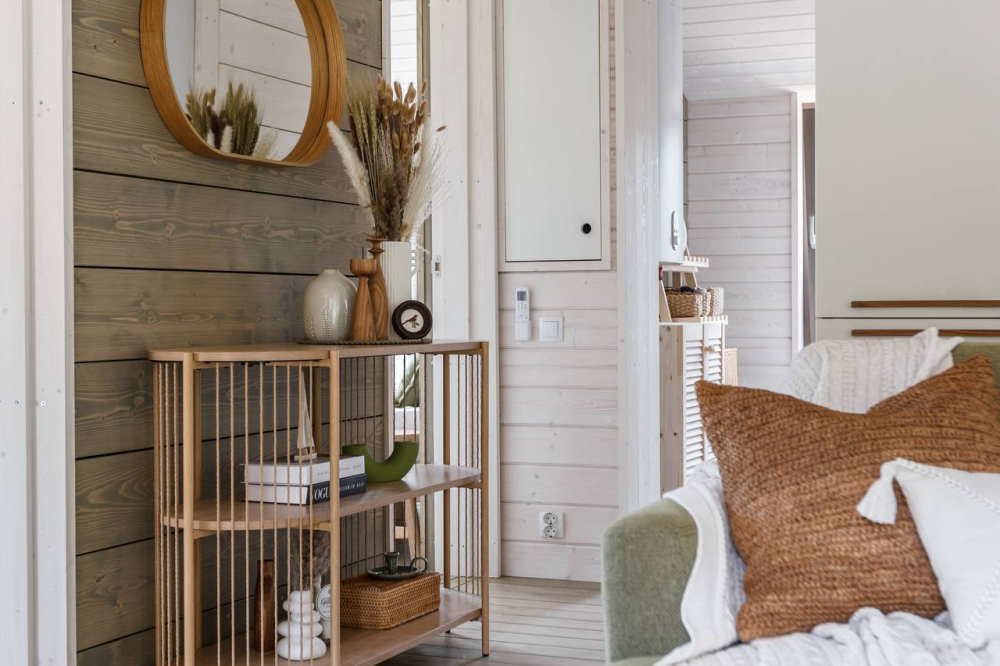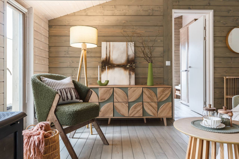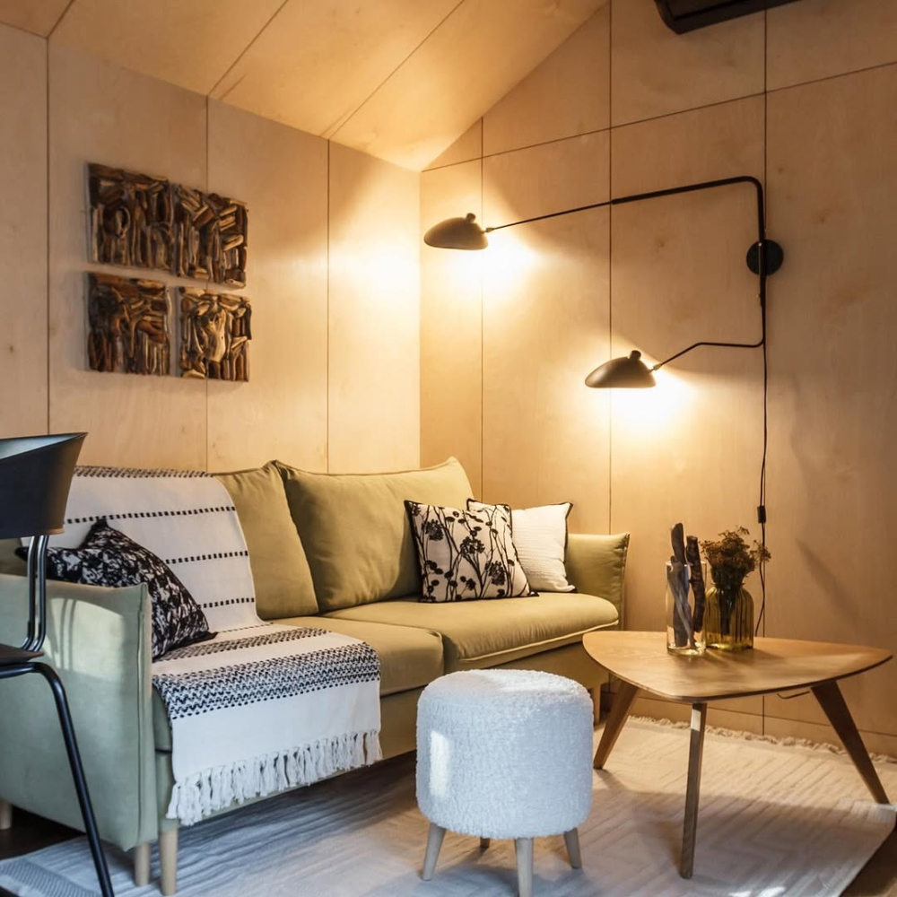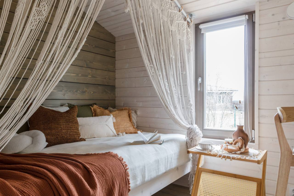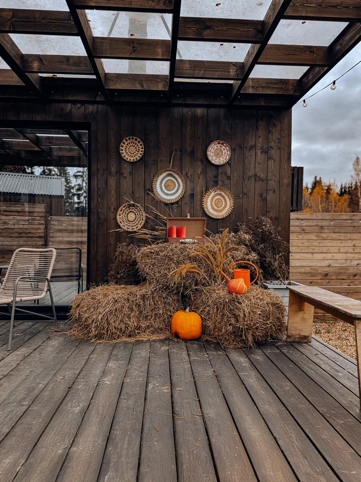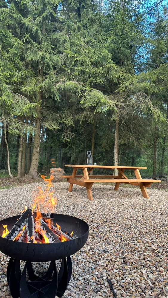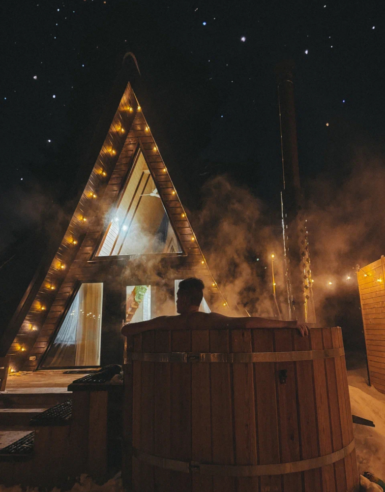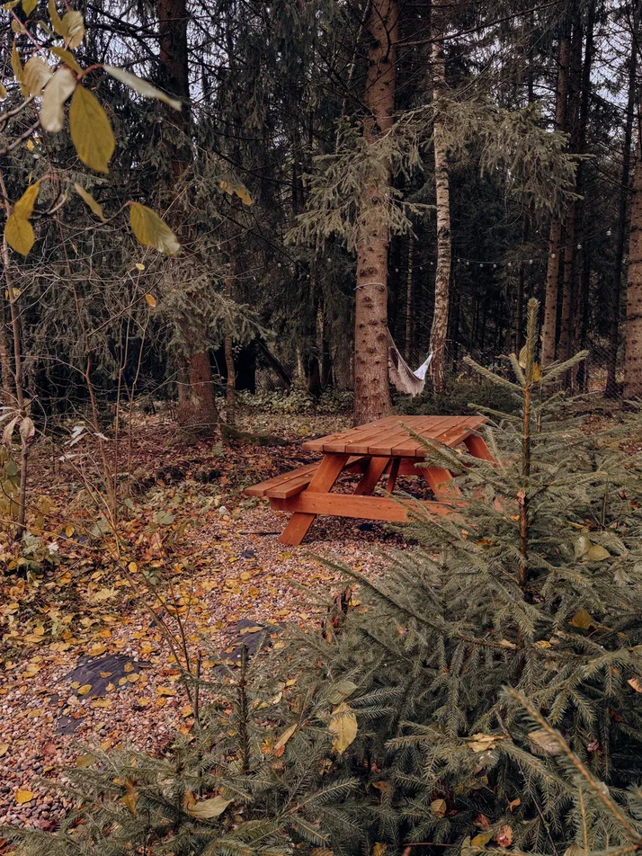 с уютным дизайном внутри со своей индивидуальной территорией, где стоит мангал, кострище, зона отдыха, терраса и купель.
