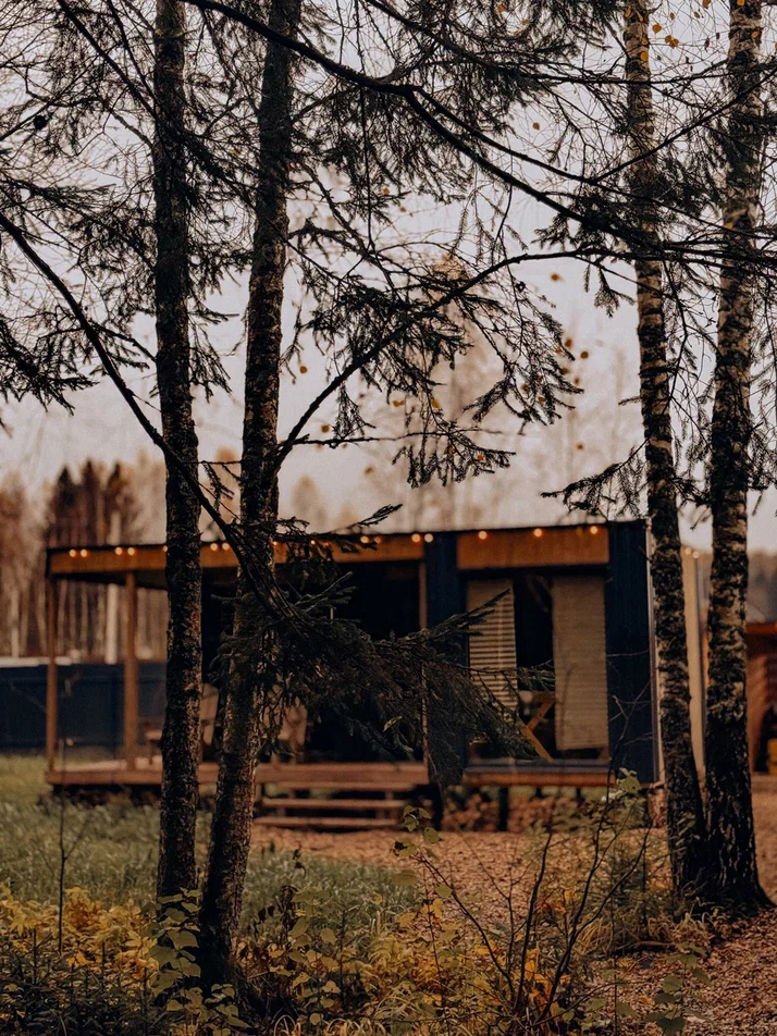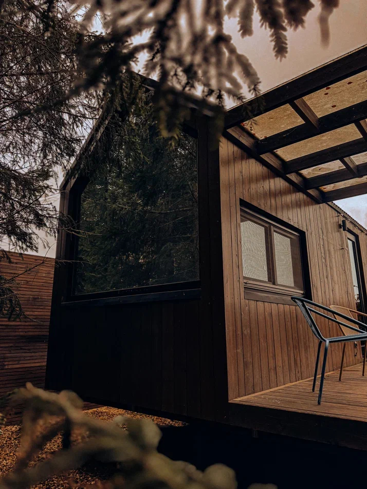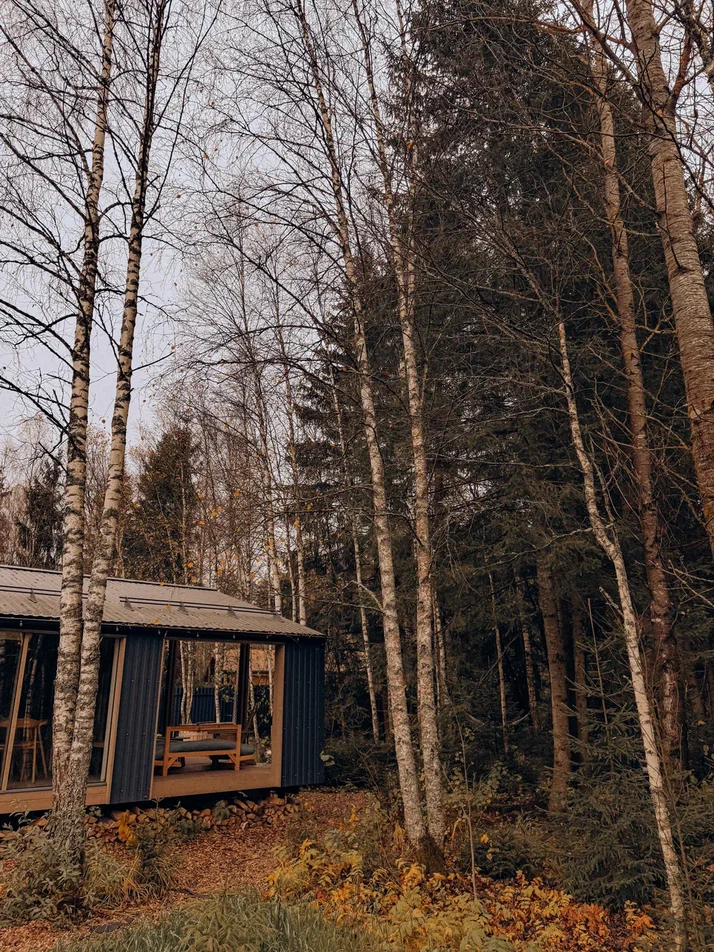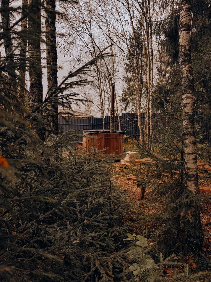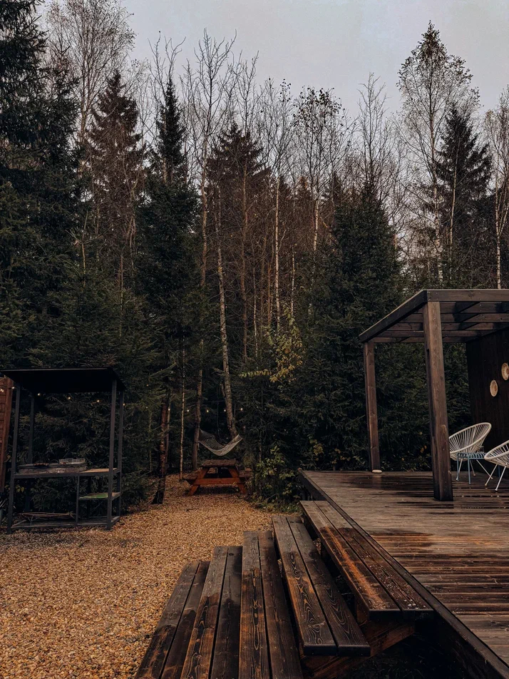 Большой дом "Форест"-отдельный участок Большой дом в стиле лофт, вмещающий до 6 спальных мест, с собственной закрытой территорией, где есть мангал, кострище, зона отдыха, терраса и купель. Все это с видом на дикий лес.