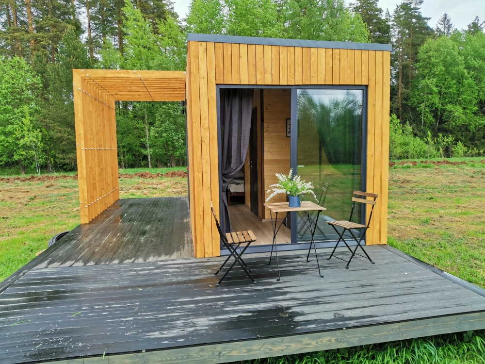 Уютные деревянные дома с двуспальной кроватью, креслом-кроватью, санузлом, душем с горячей водой и освещением.