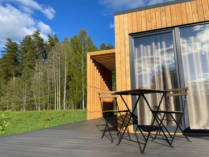 4 деревянных дома в минималистичном современном стиле, выполненные из экологически чистых материалов, каждый с панорамными окнами и просторной террасой.