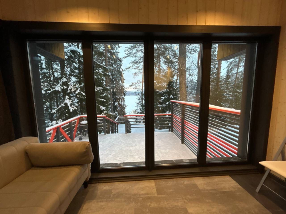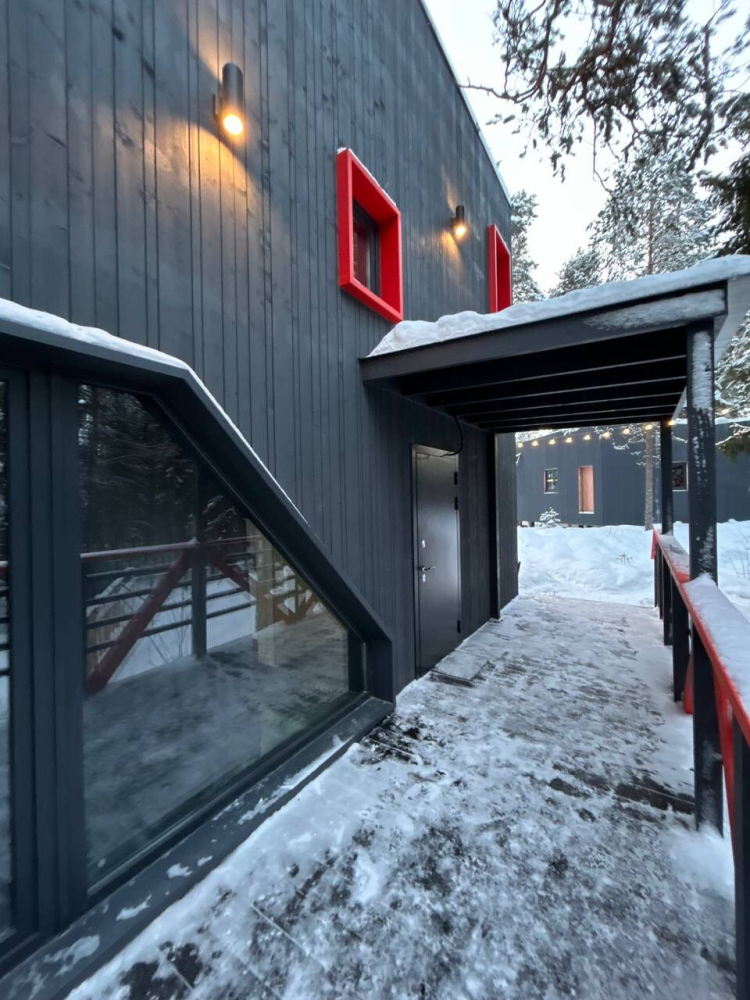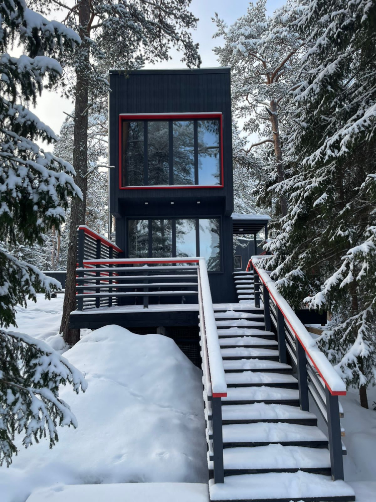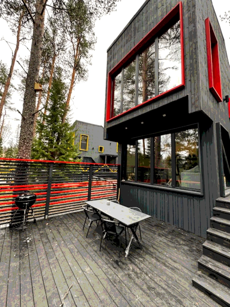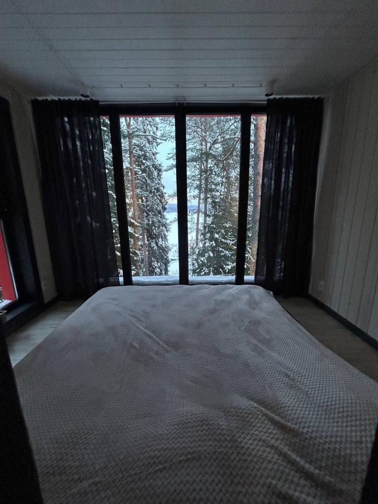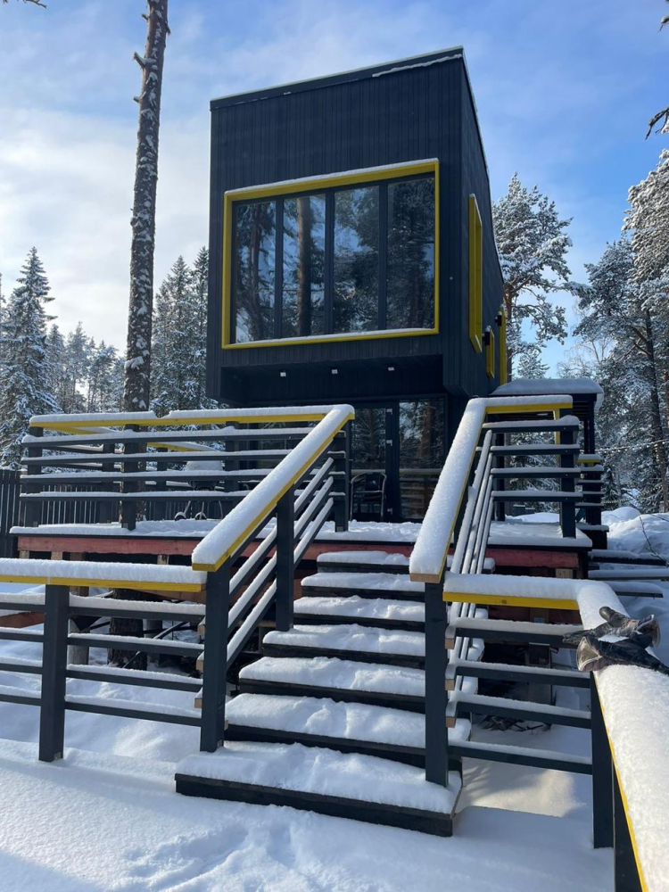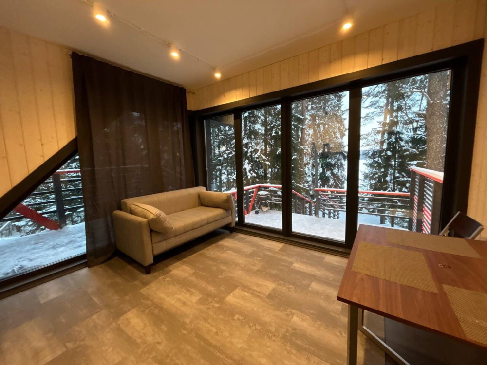 В современном объекте размещения на берегу Ладожского озера предоставляются стильные двухэтажные дома площадью 46 м² с панорамным остеклением. Каждый дом оснащён удобной мебелью, санузлом с душем, кондиционерами на каждом этаже и системой тёплого пола. Кухня с камином укомплектована всем необходимым для приготовления пищи, а двухуровневые террасы предоставляют великолепный вид на озеро и природу, а также собственную зону для барбекю. Расположен в тихом месте среди хвойного леса, в 15 минутах пешком от центра Лахденпохья, где находятся магазины, рестораны и другие объекты инфраструктуры. Дома рассчитаны на комфортное размещение 4 взрослых. Парковка входит в стоимость аренды.