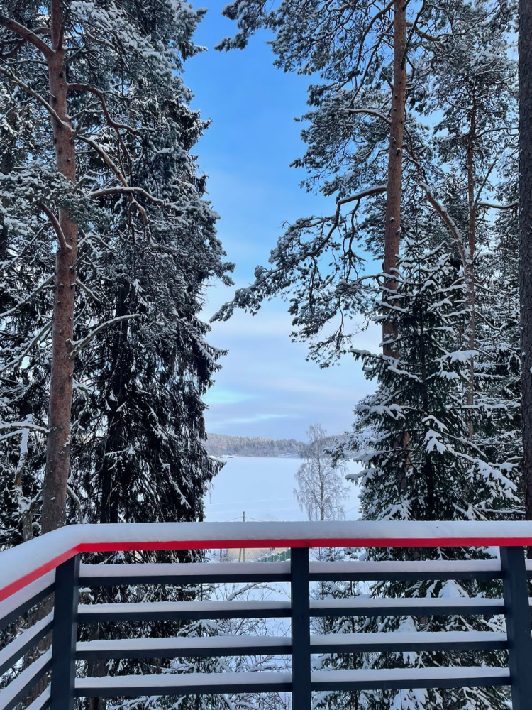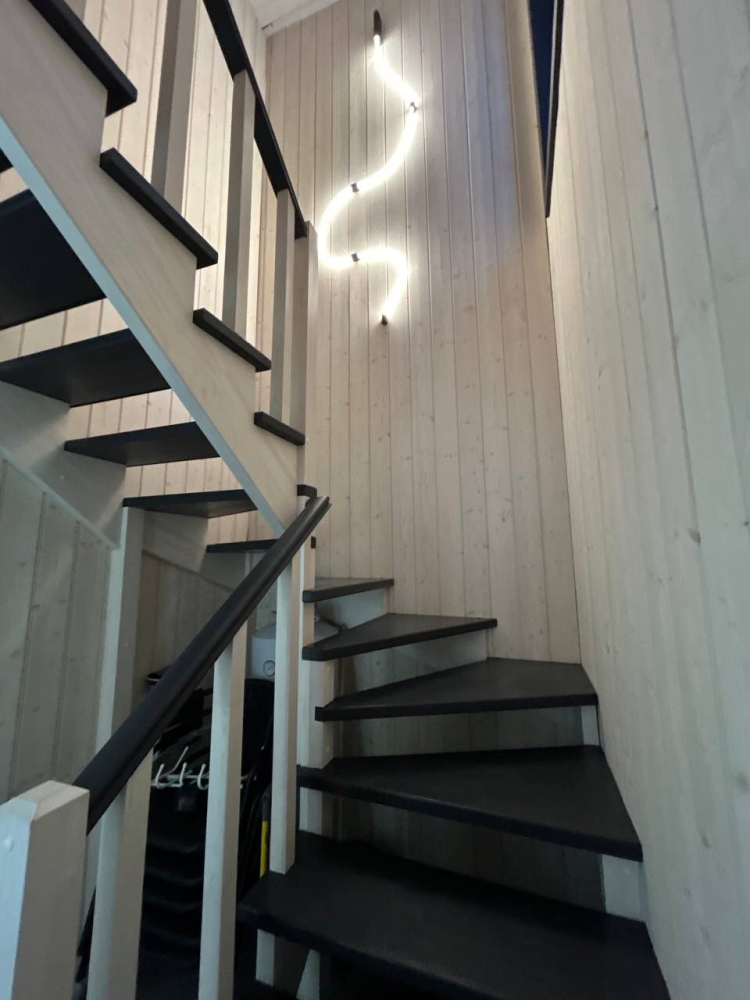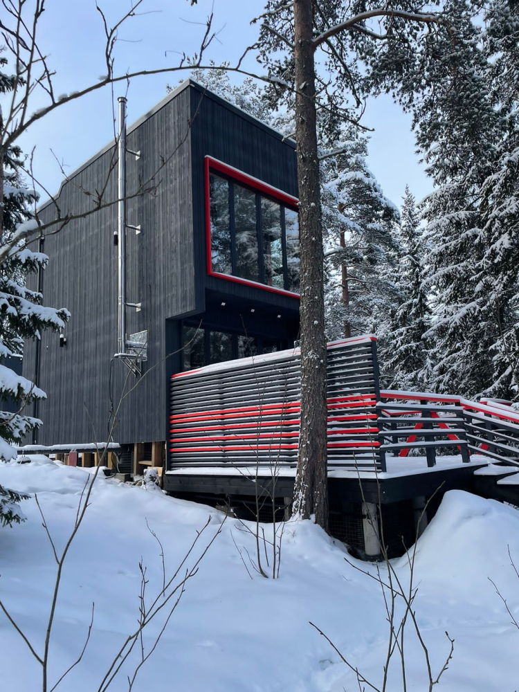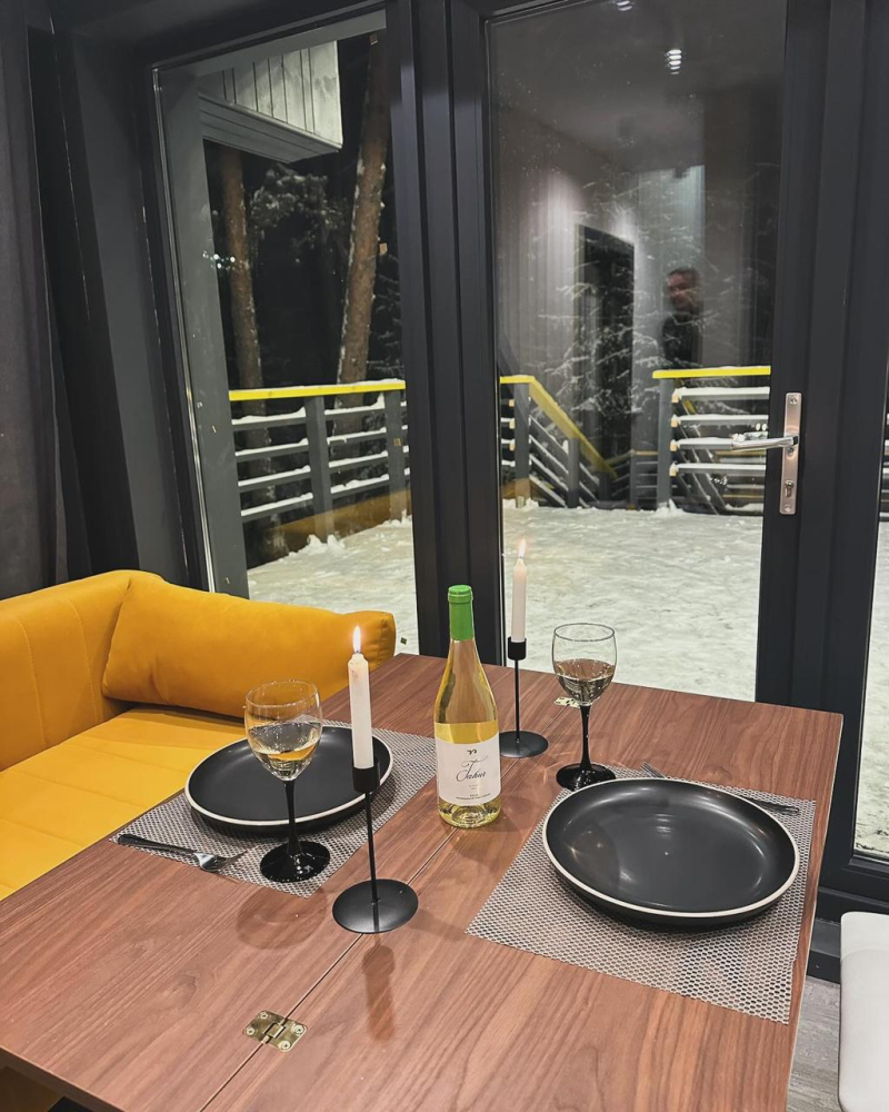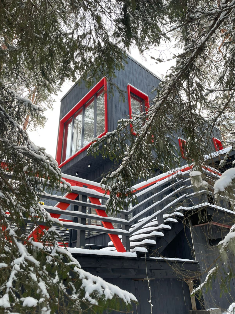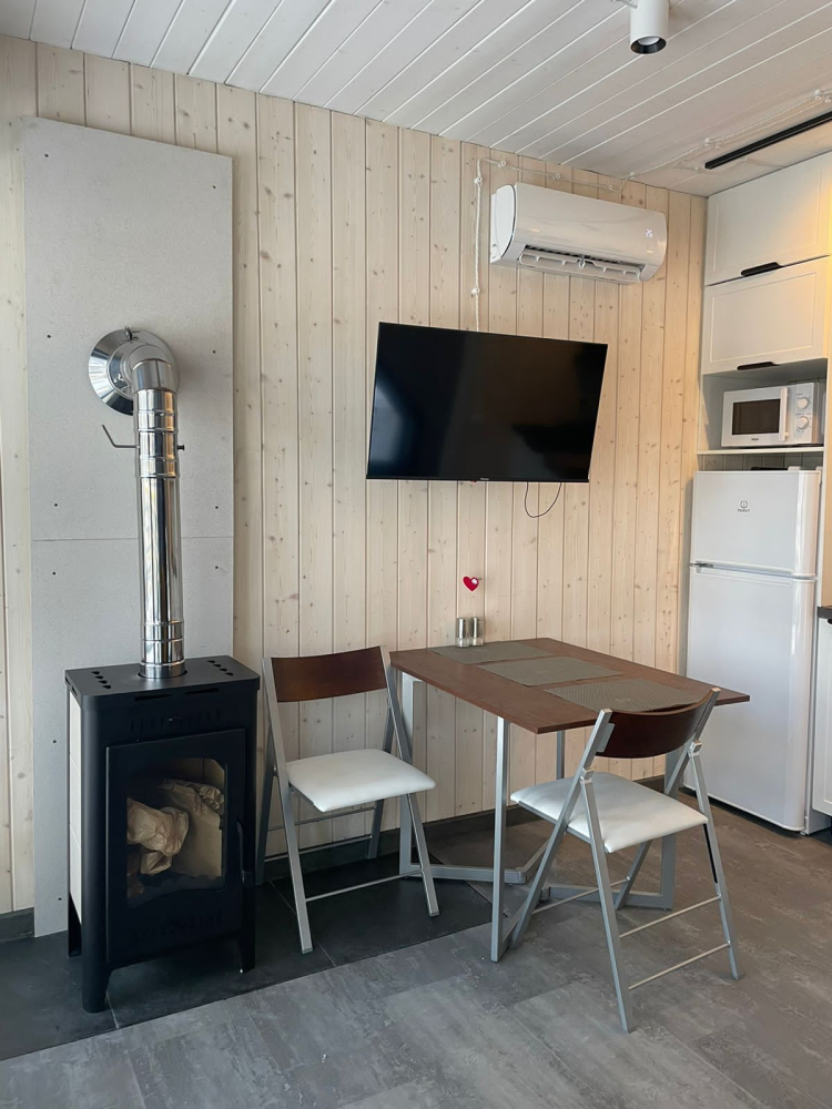 В современном объекте размещения на берегу Ладожского озера предоставляются стильные двухэтажные дома площадью 46 м² с панорамным остеклением. Каждый дом оснащён удобной мебелью, санузлом с душем, кондиционерами на каждом этаже и системой тёплого пола. Кухня с камином укомплектована всем необходимым для приготовления пищи, а двухуровневые террасы предоставляют великолепный вид на озеро и природу, а также собственную зону для барбекю. Расположен в тихом месте среди хвойного леса, в 15 минутах пешком от центра Лахденпохья, где находятся магазины, рестораны и другие объекты инфраструктуры. Дома рассчитаны на комфортное размещение 4 взрослых. Парковка входит в стоимость аренды.