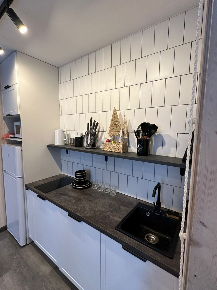 Оборудованная кухня с необходимой посудой.