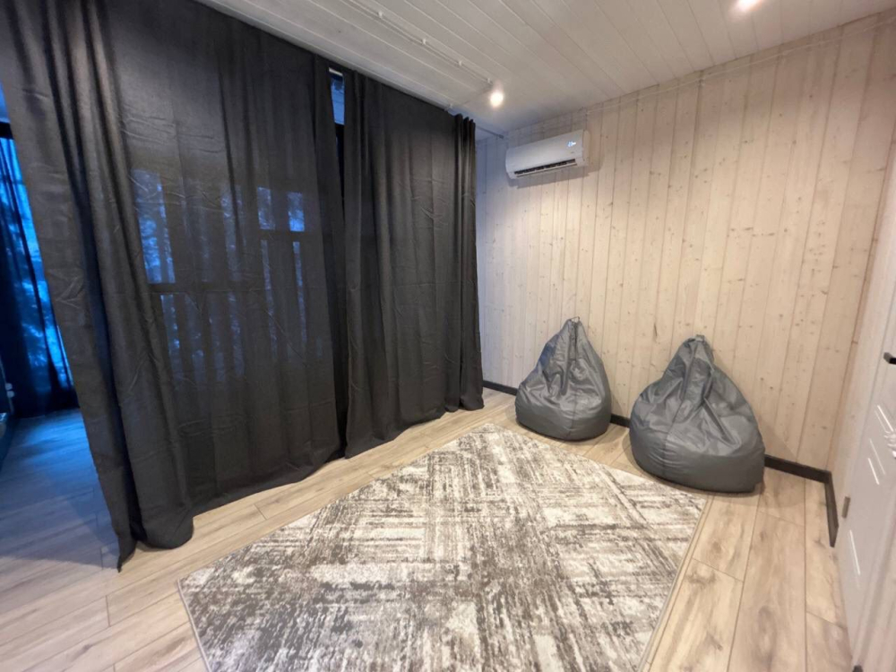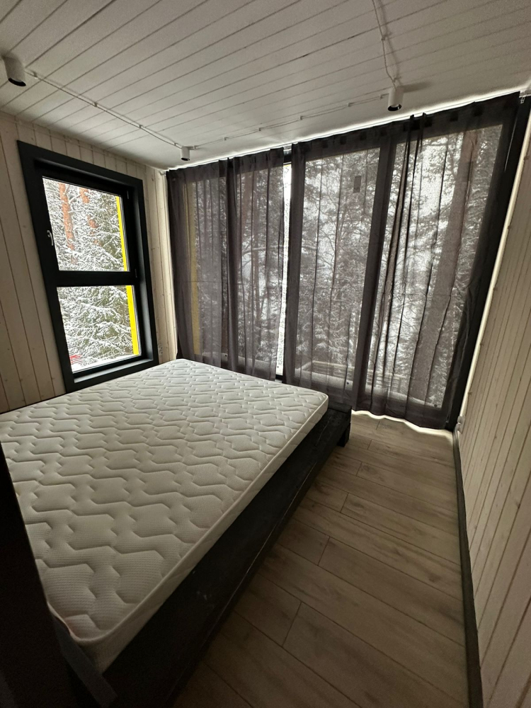 На первом этаже находятся кухня-гостиная с телевизором, раскладной диван на 2 человек, тёплый пол, кондиционер, а также санузел с душем. На втором этаже расположена большая двуспальная кровать с панорамным видом на озеро, зона для хобби, гардероб и кондиционер с функцией обогрева.
