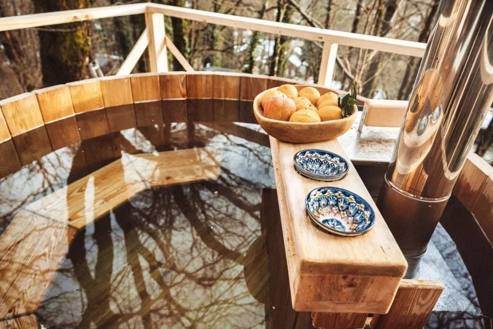 Королевский шатёр на дереве: Шатёр с террасой, купелью, рабочим местом и уютной атмосферой для компании до 6 человек.