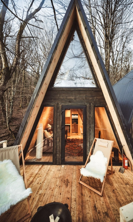 Двухэтажный А-Фрейм: Дом с панорамными окнами, камином, Wi-Fi, купелью на террасе и современным отоплением, рассчитанный на размещение до 6 человек.