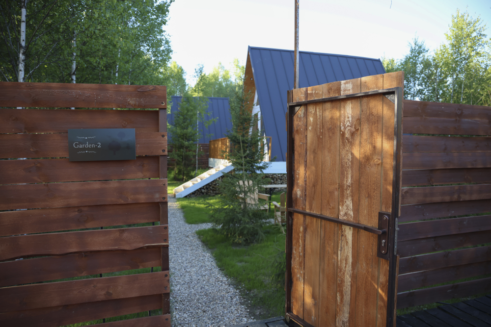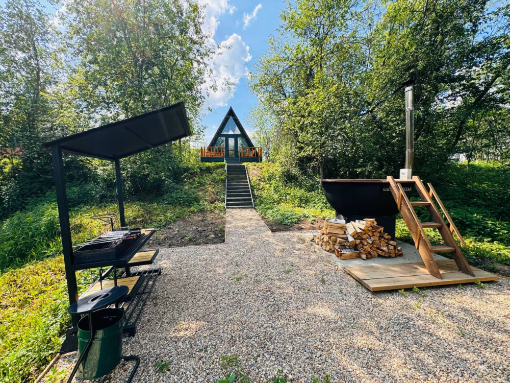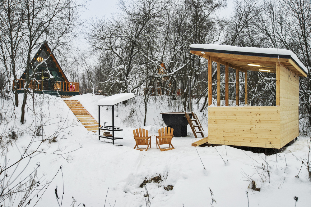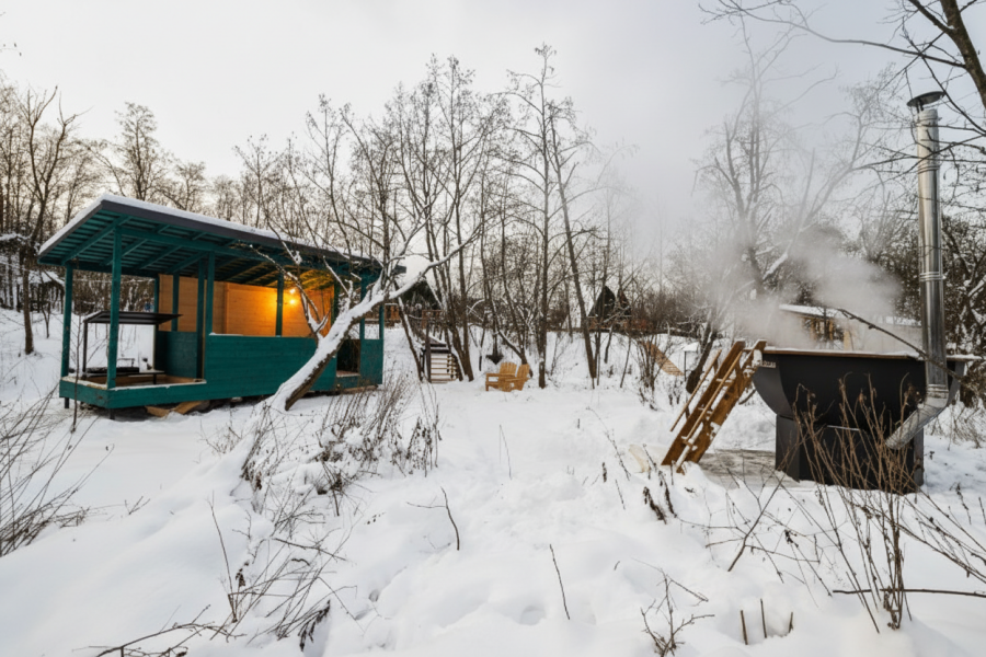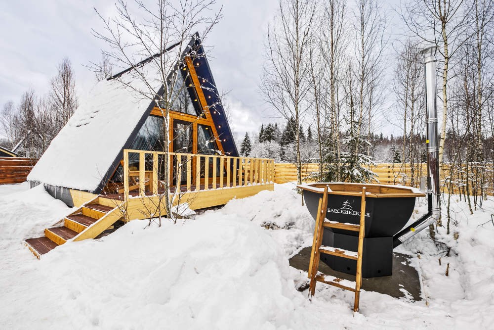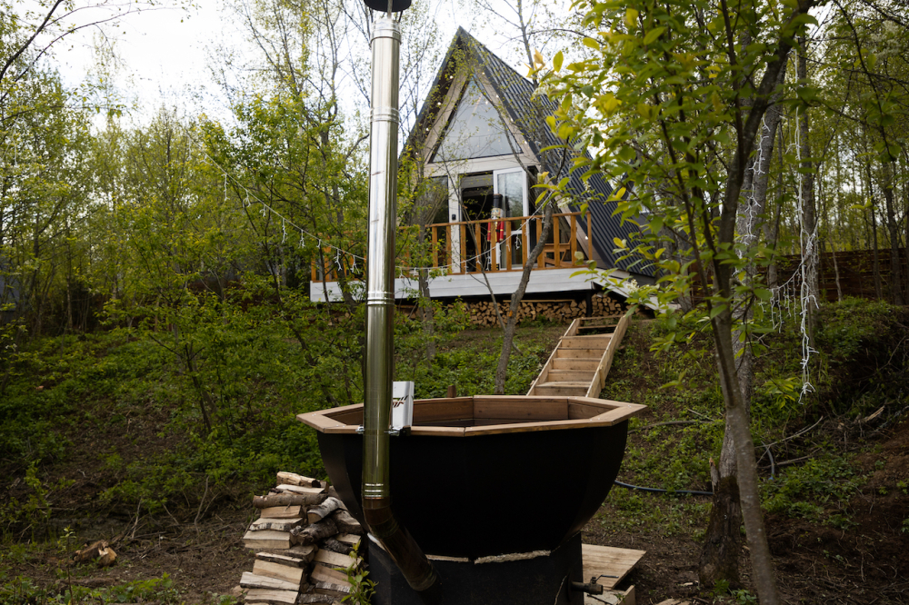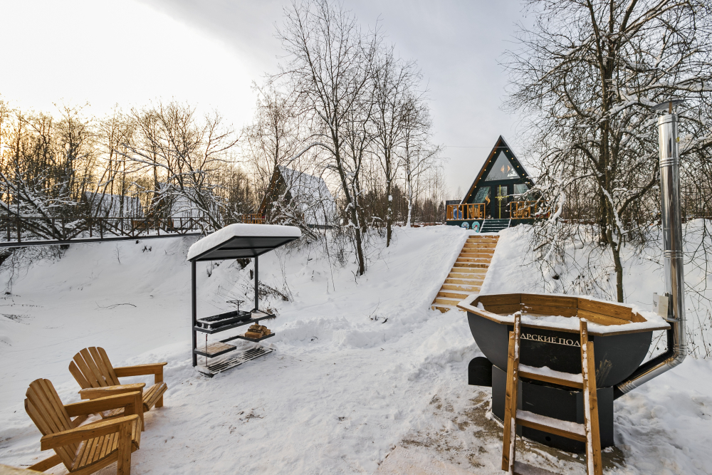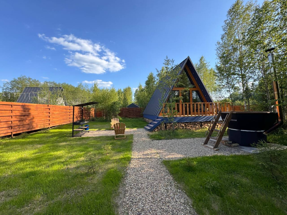 - 14 домов A-frame , каждый со своей территорией, а у многих — свой банный чан или баня*.