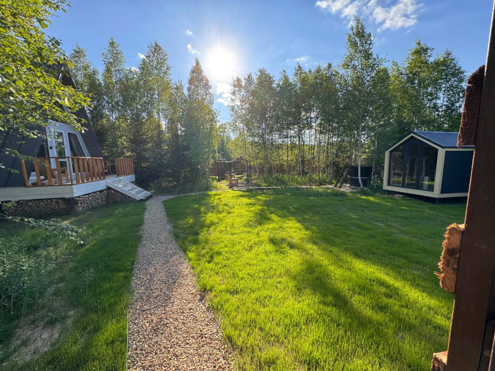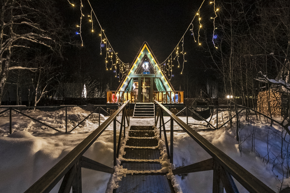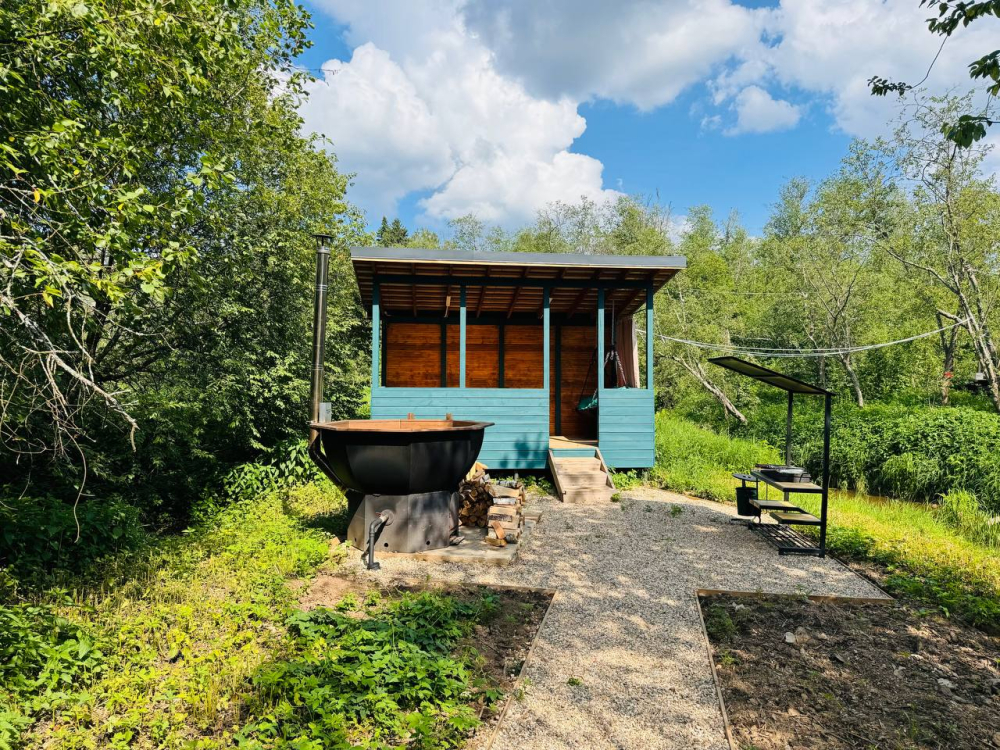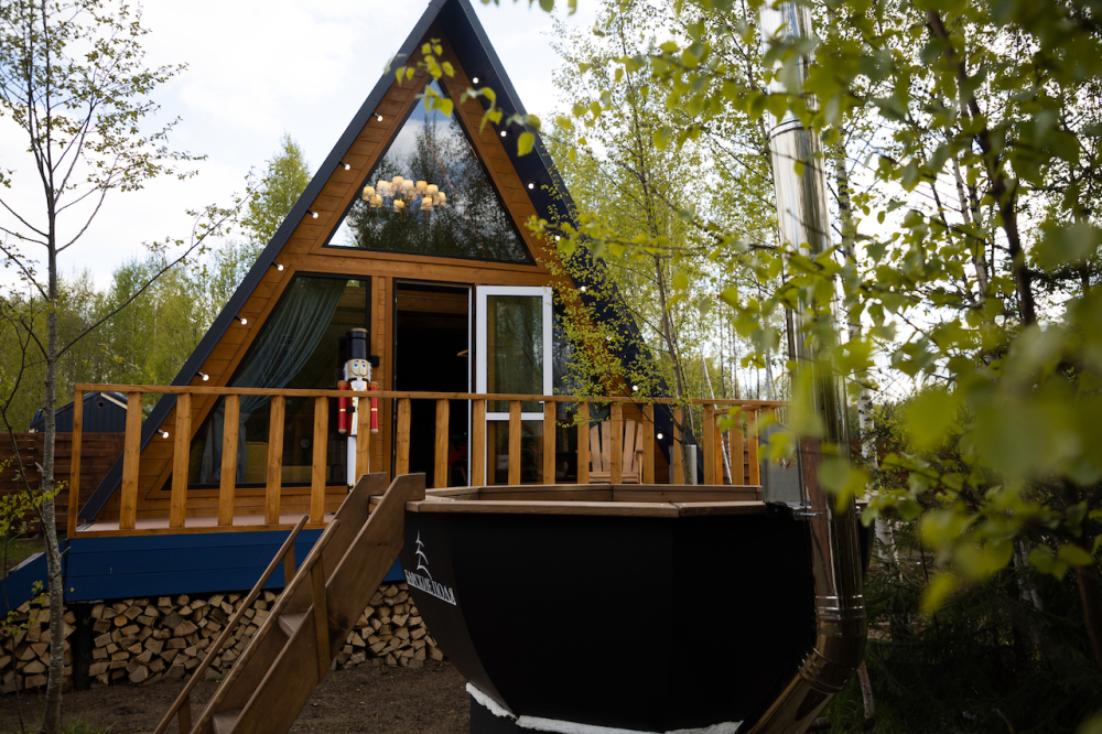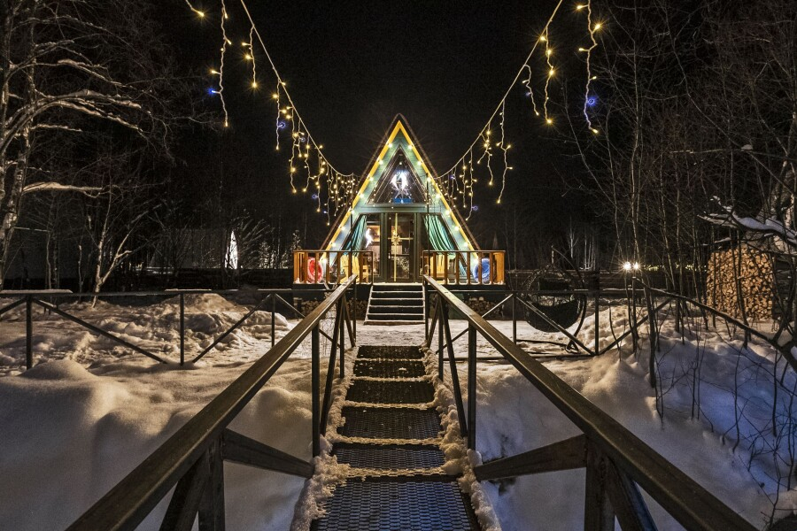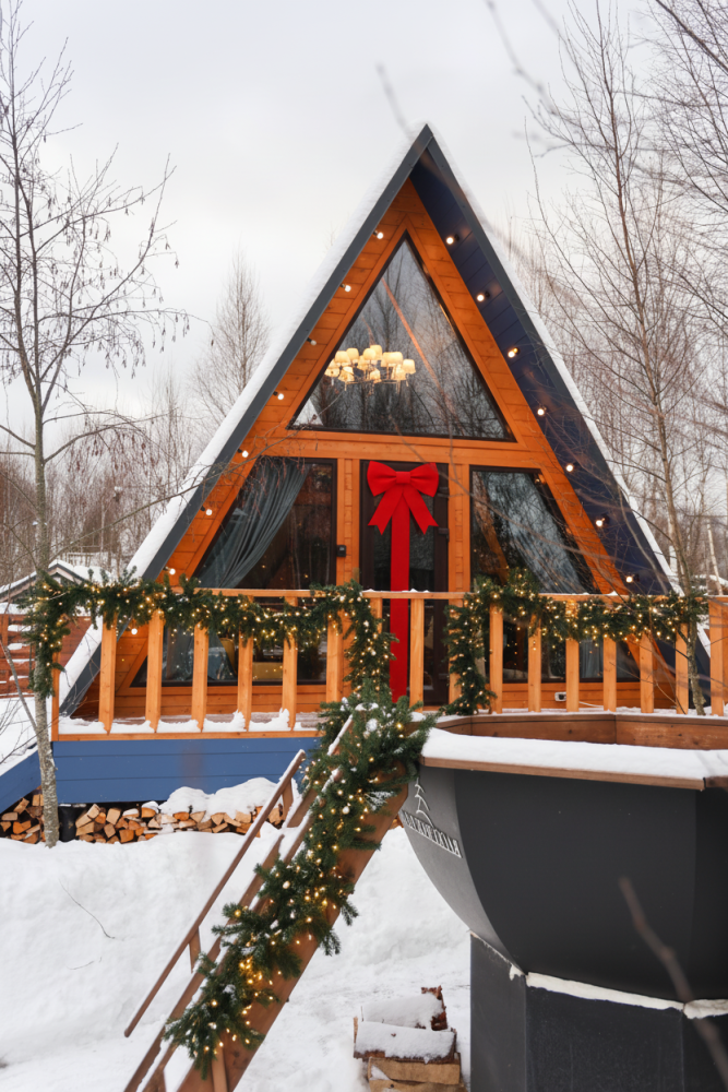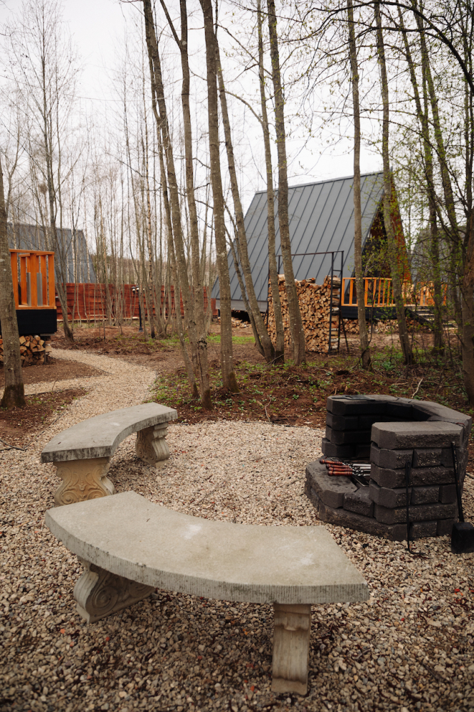 - 14 домов A-frame , каждый со своей территорией, а у многих — свой банный чан или баня*.