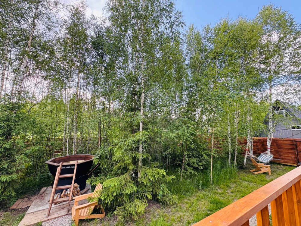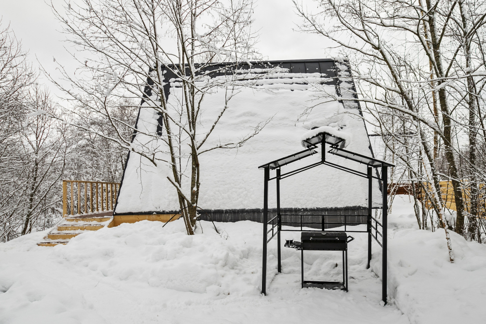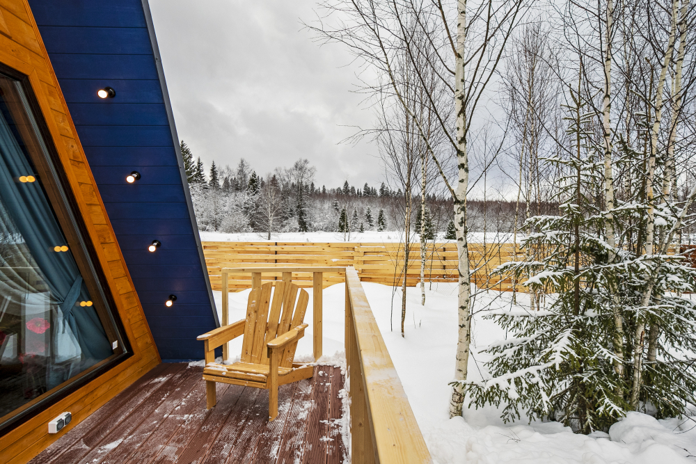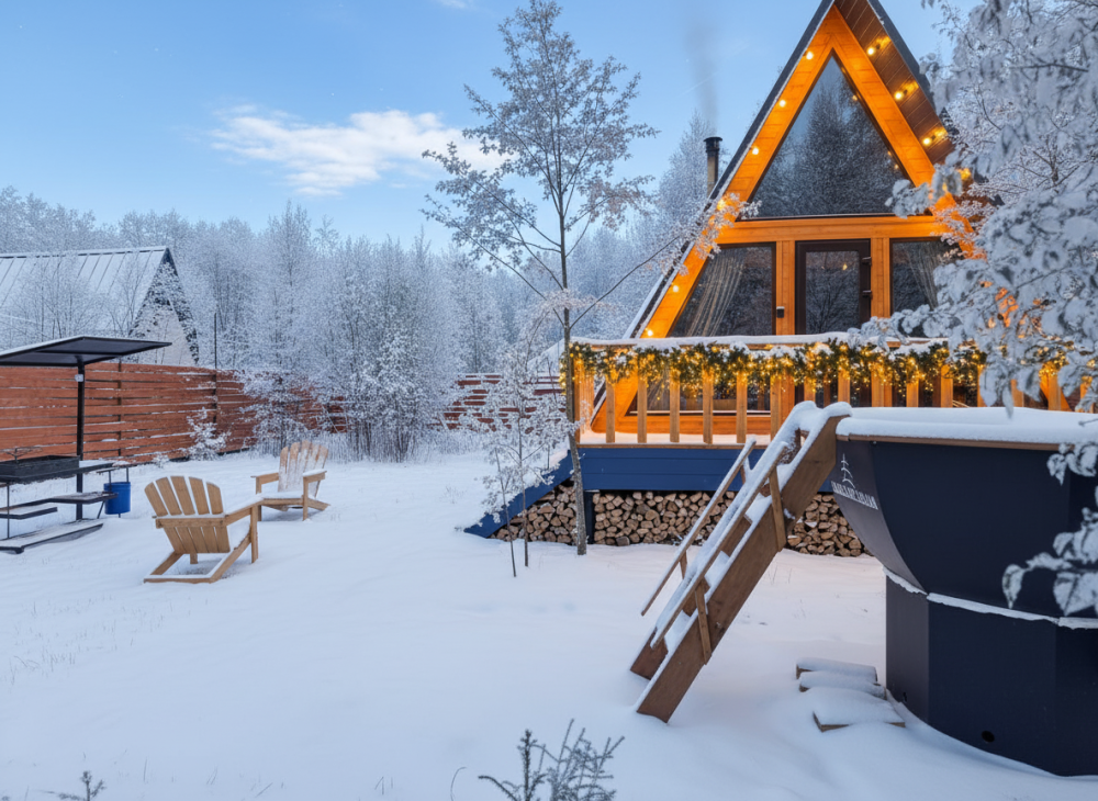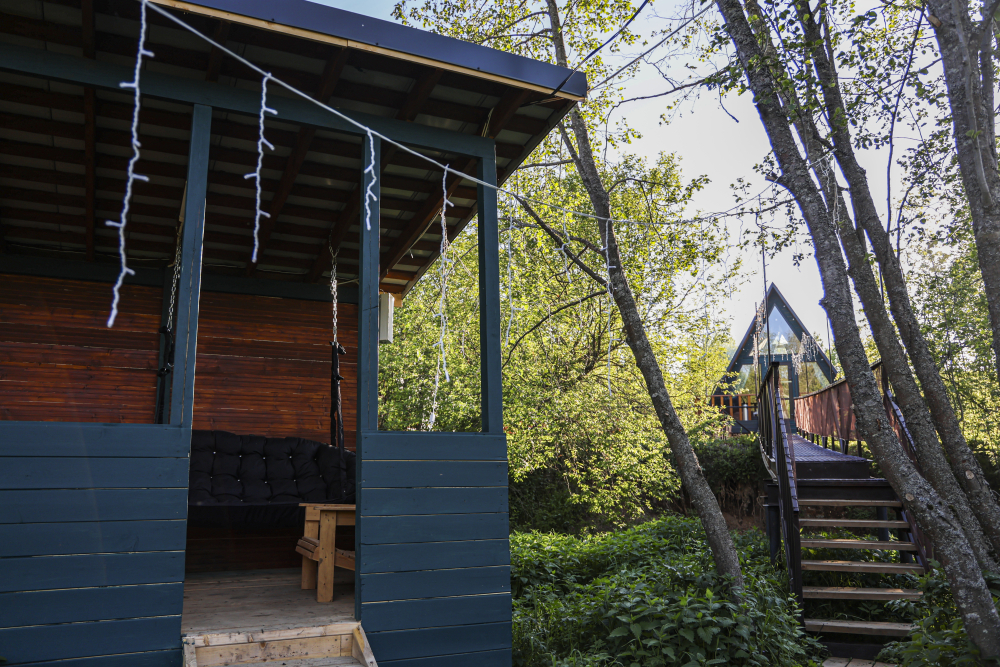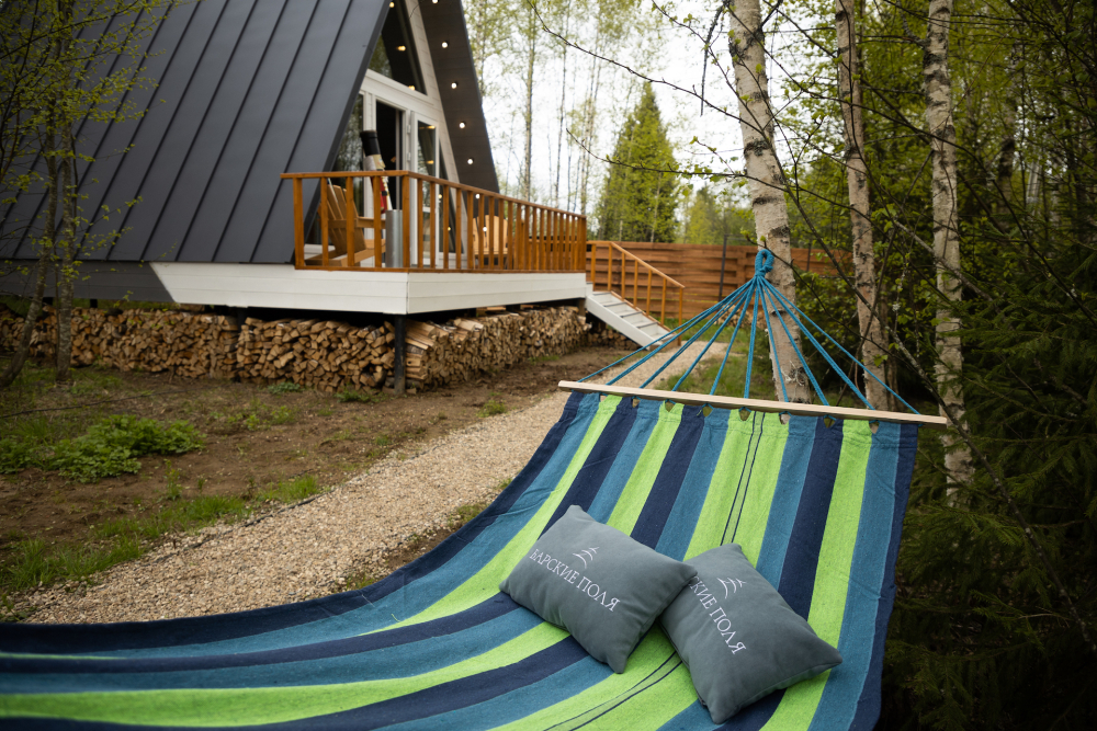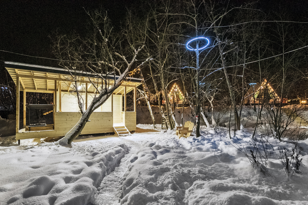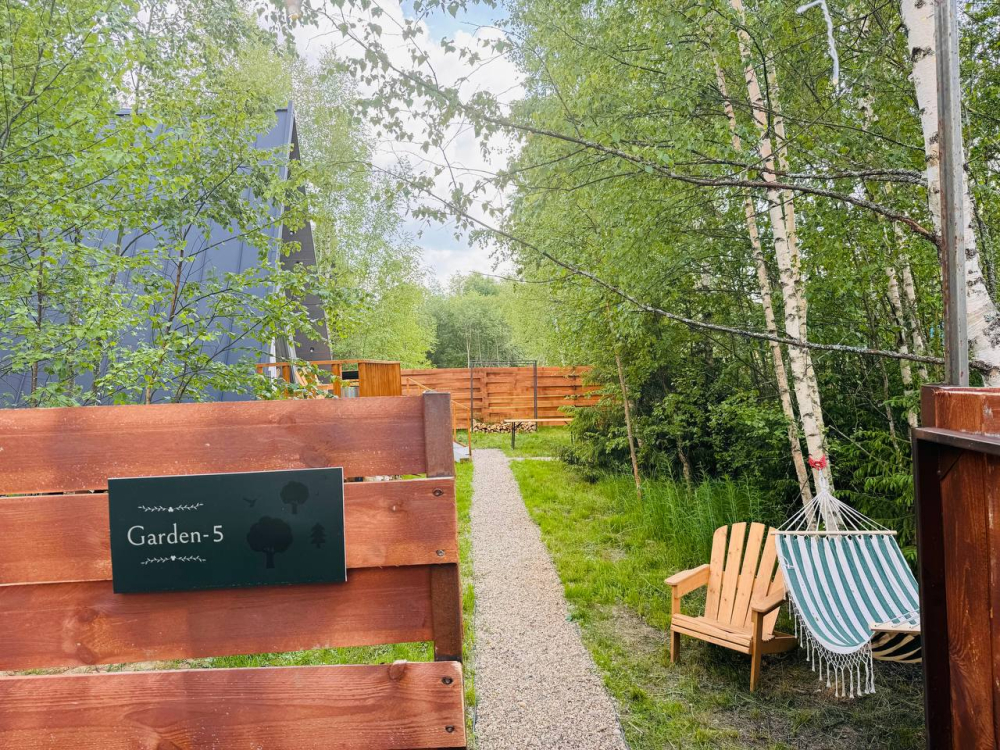 - 14 домов A-frame , каждый со своей территорией, а у многих — свой банный чан или баня*.