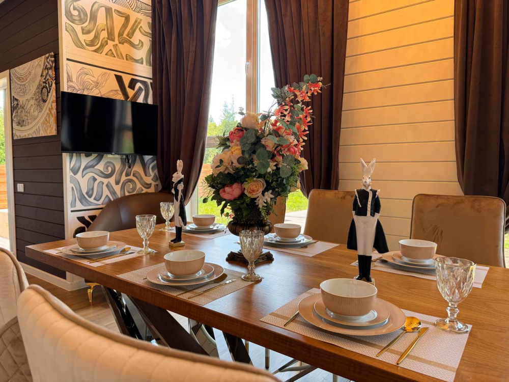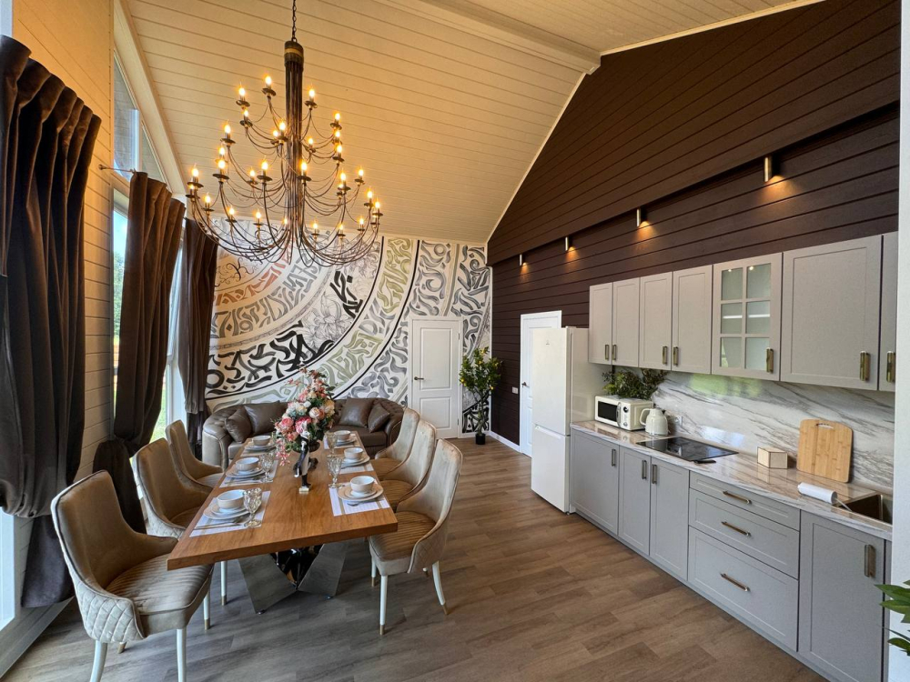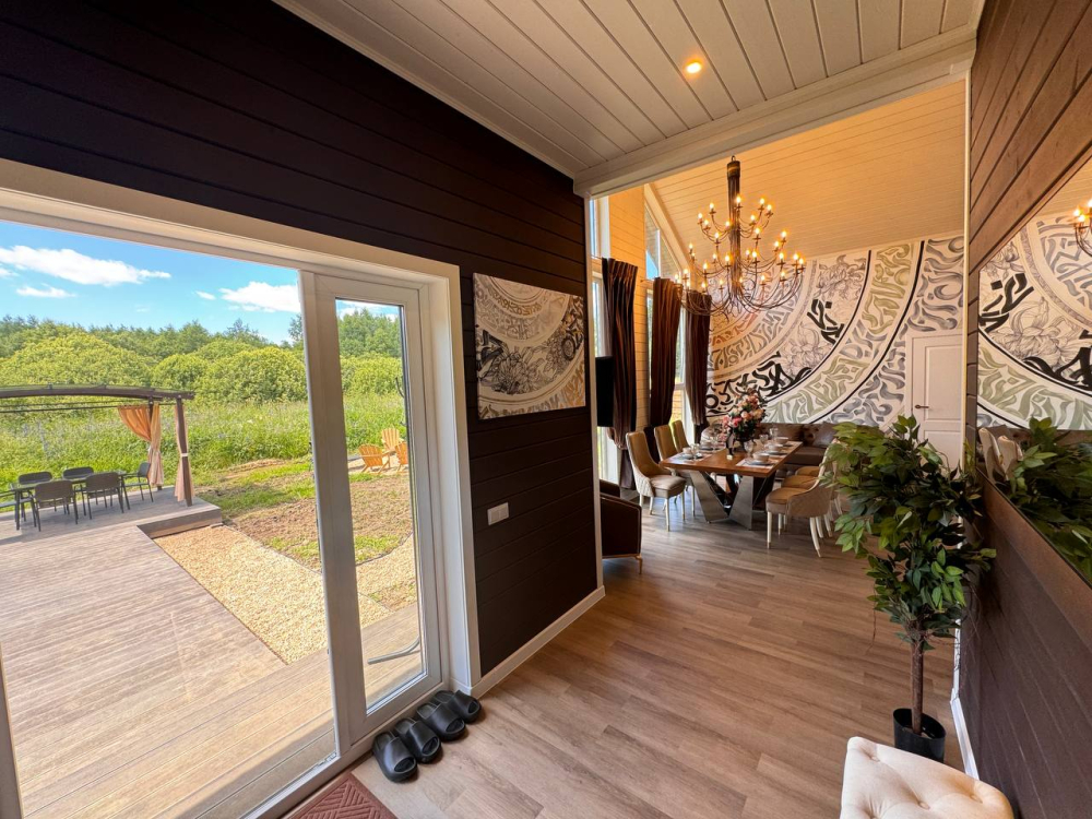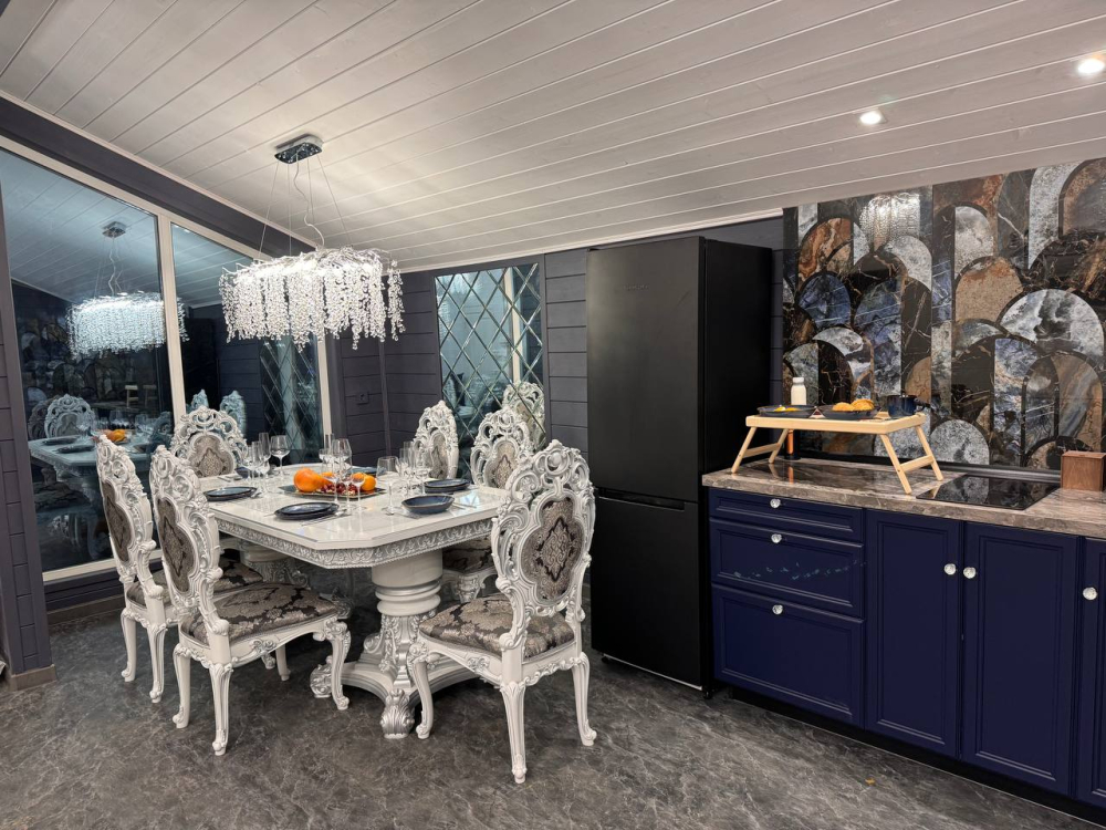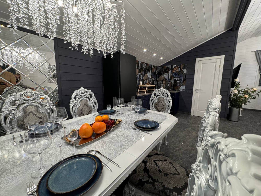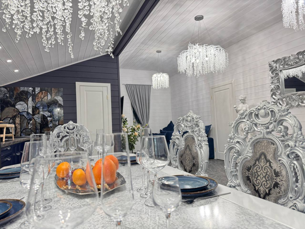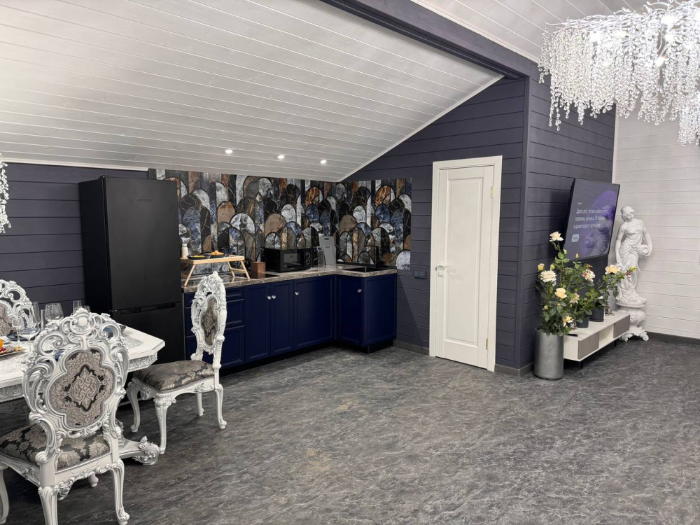 - Барский дом с баней*, мангальной зоной и большим обеденным столом — идеальный выбор для семейных праздников или отдыха с друзьями.