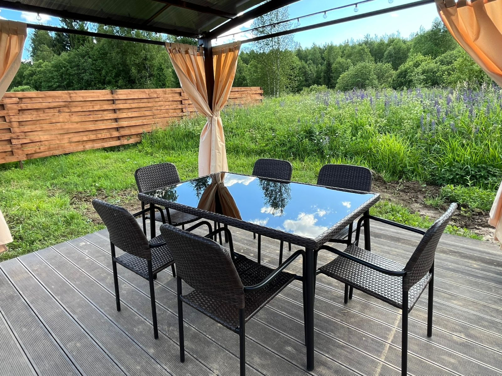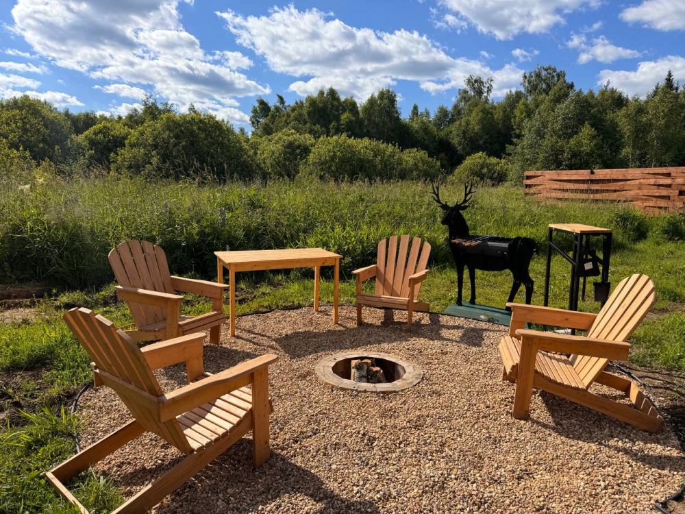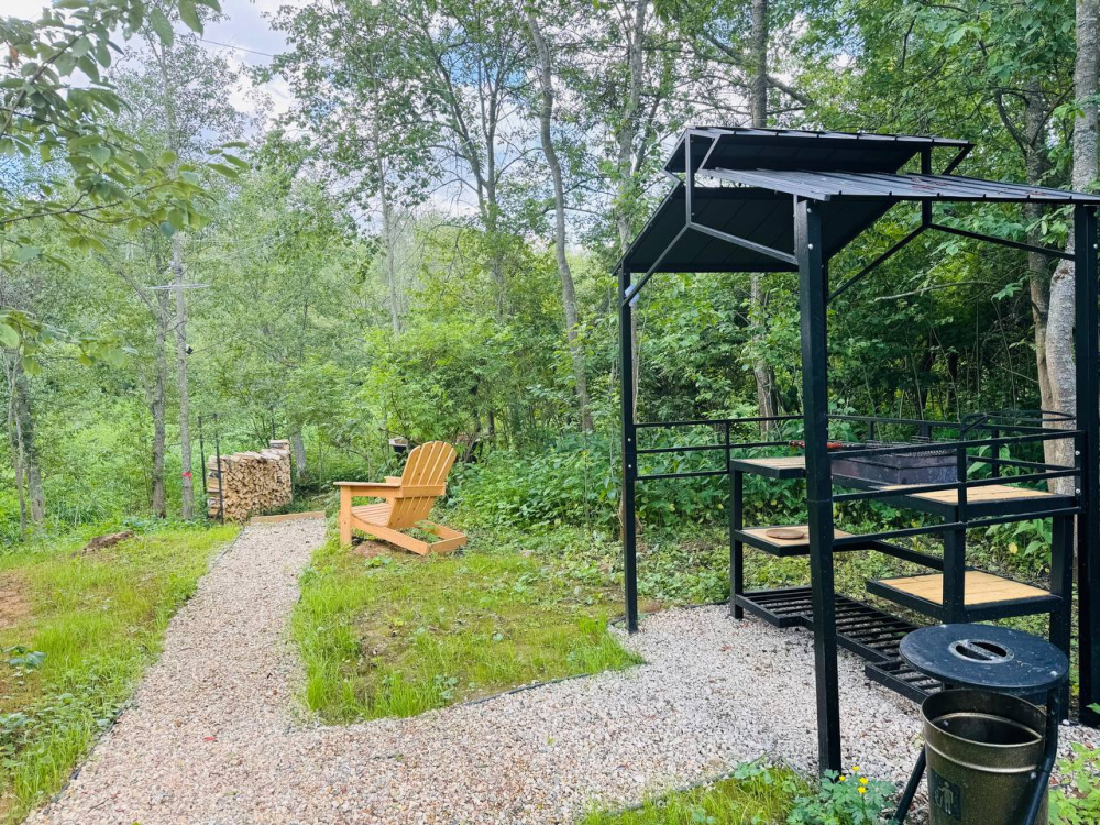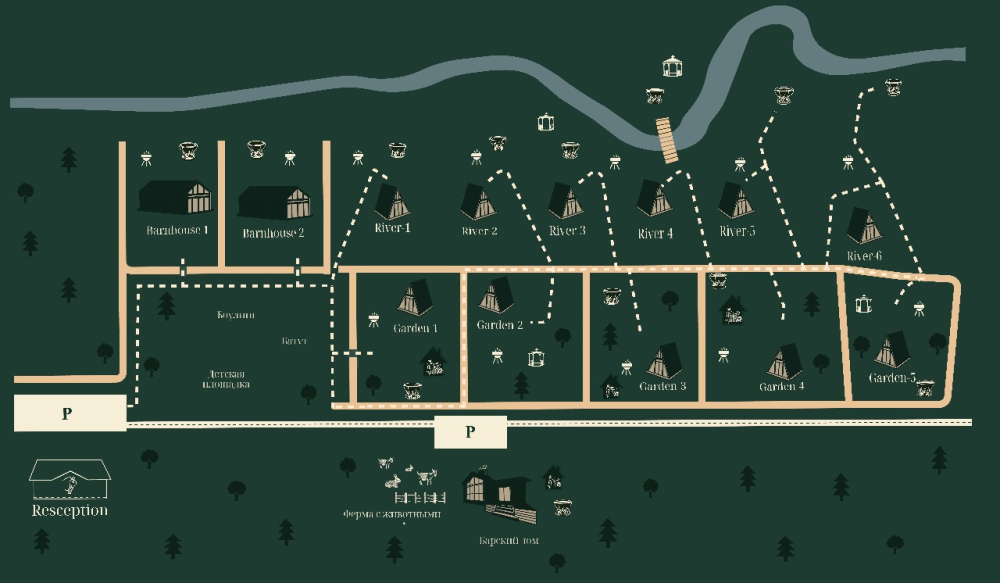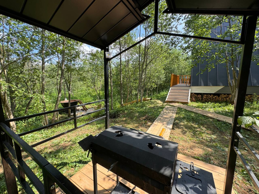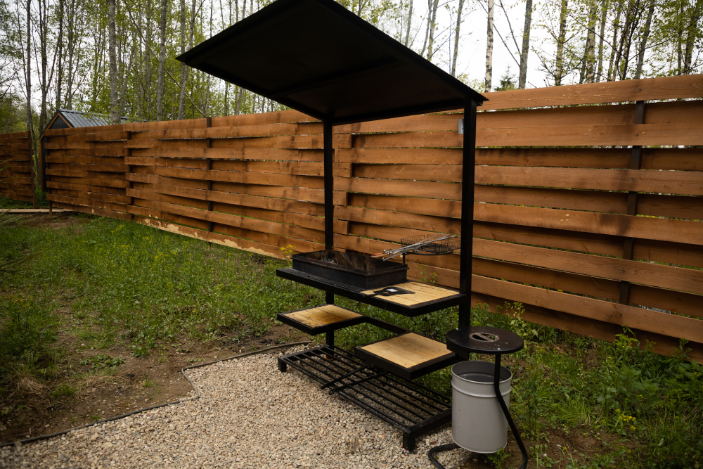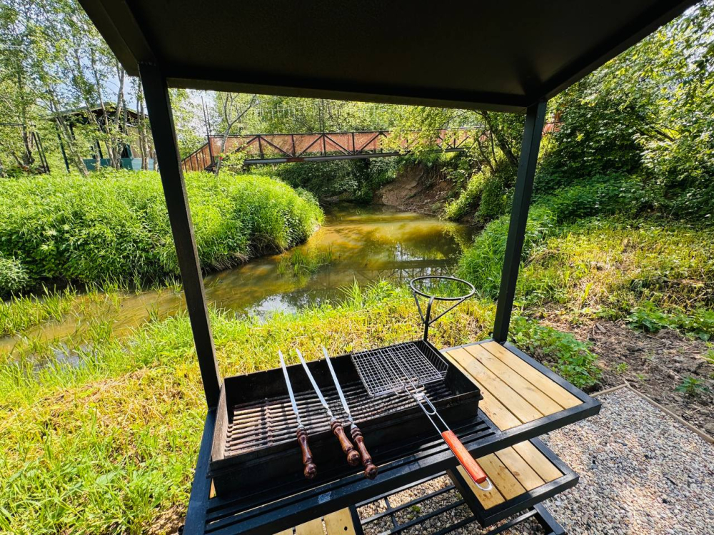 Барбекю зона есть около домиков River 1, River 2, River 3, River 4, River 5, River 6, Garden 2, Garden 3, Garden 4, Garden 5 , Garden 1, Barnhouse 1, Barnhouse 2, Барский дом.